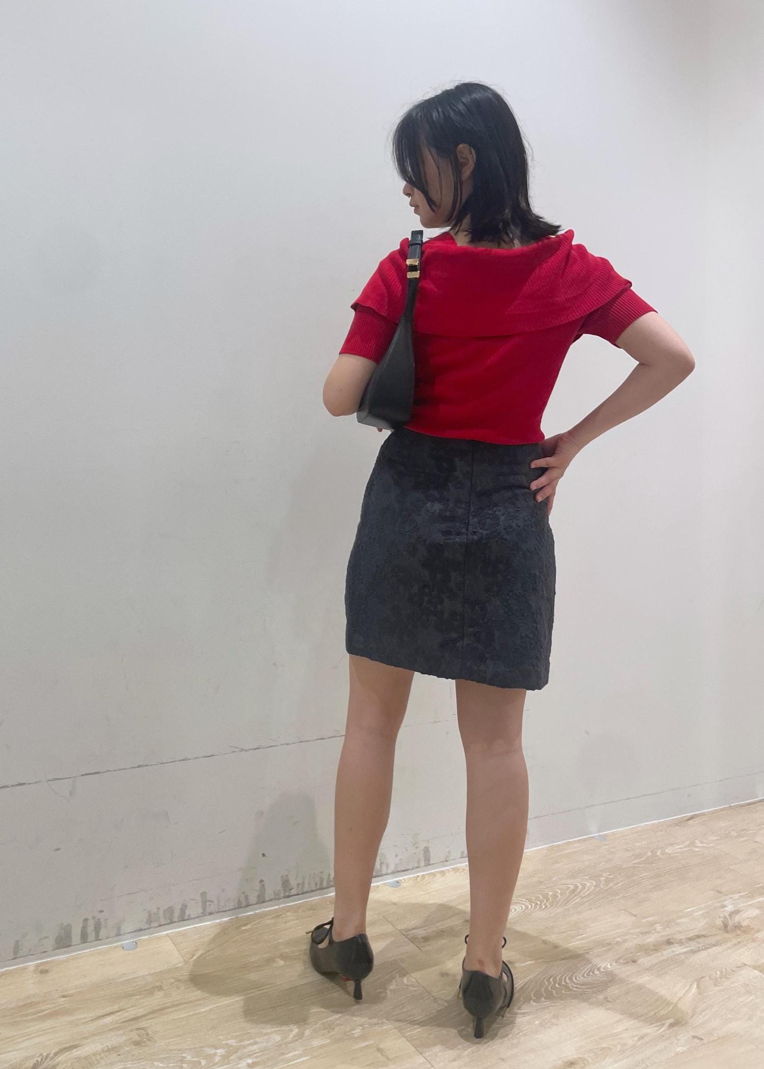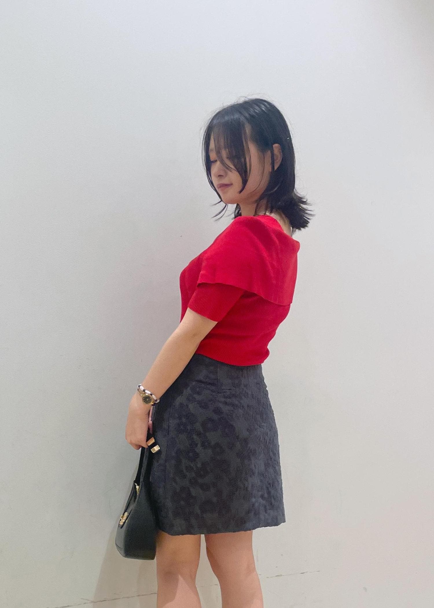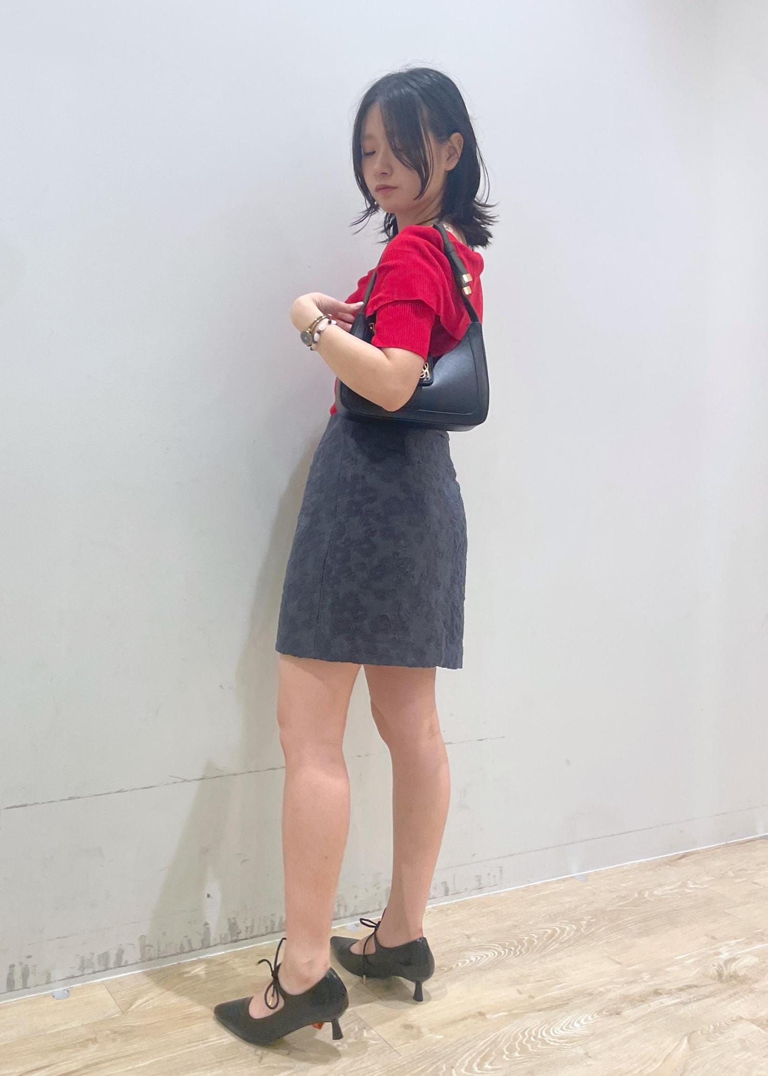 鮮やかな赤トップスで華やかさを出し、タイトめな黒スカートで大人っぽさを出しています!