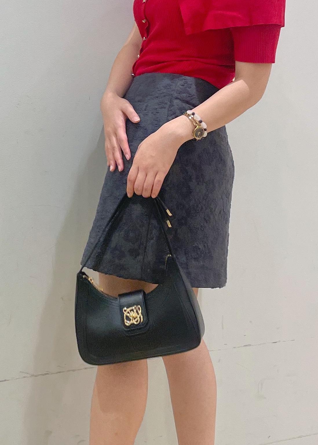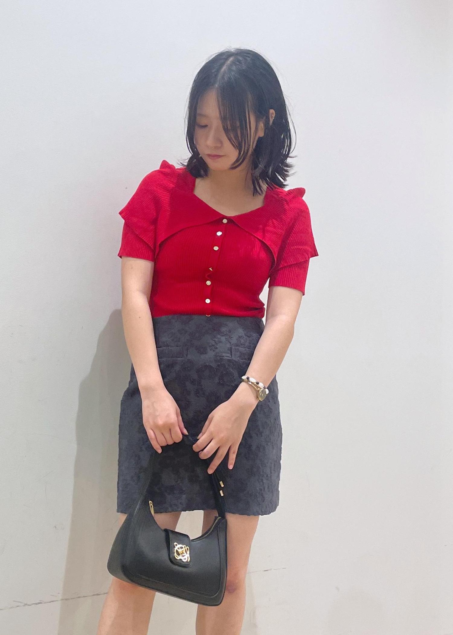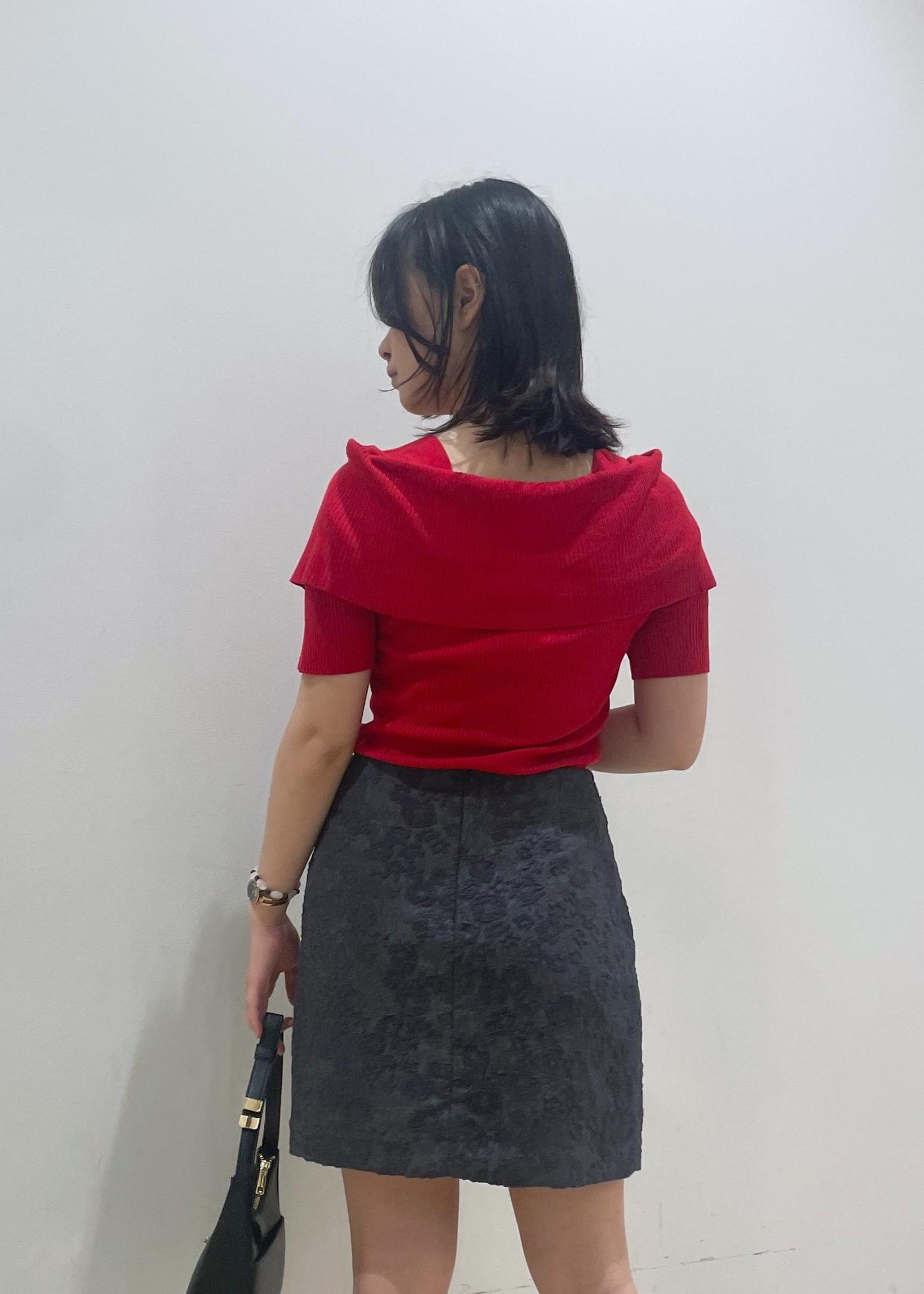 鮮やかな赤トップスで華やかさを出し、タイトめな黒スカートで大人っぽさを出しています!