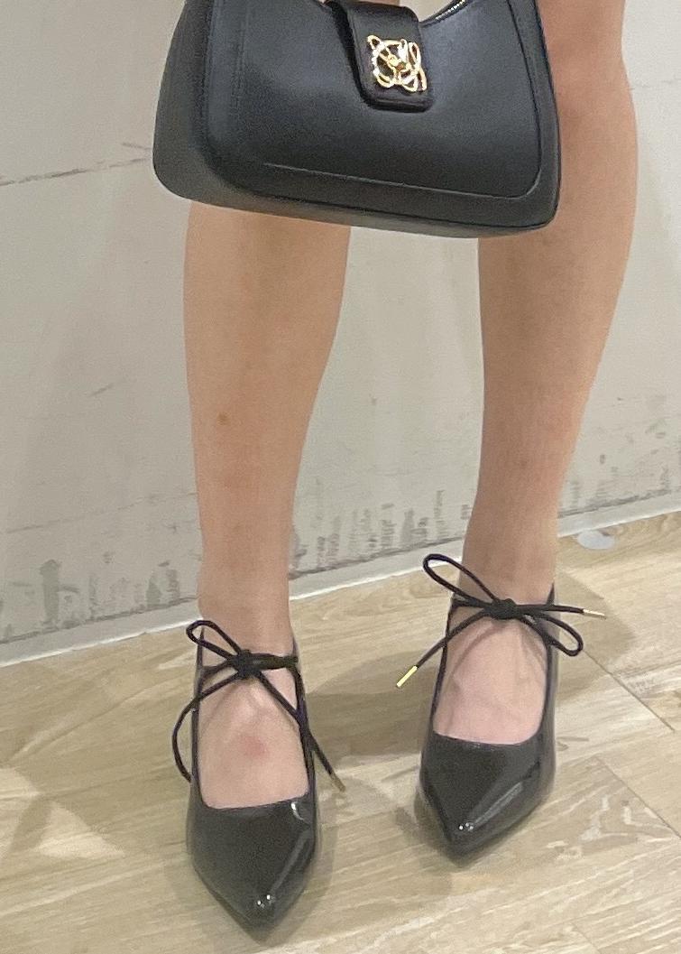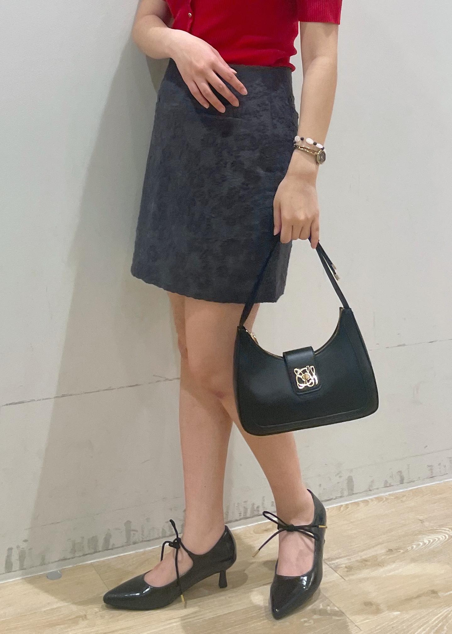 黒小物を合わせて統一感を出しつつ、リボン付きパンプスでフェミニンな印象も忘れないスタイルです!!