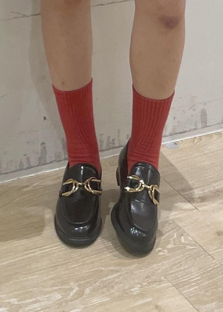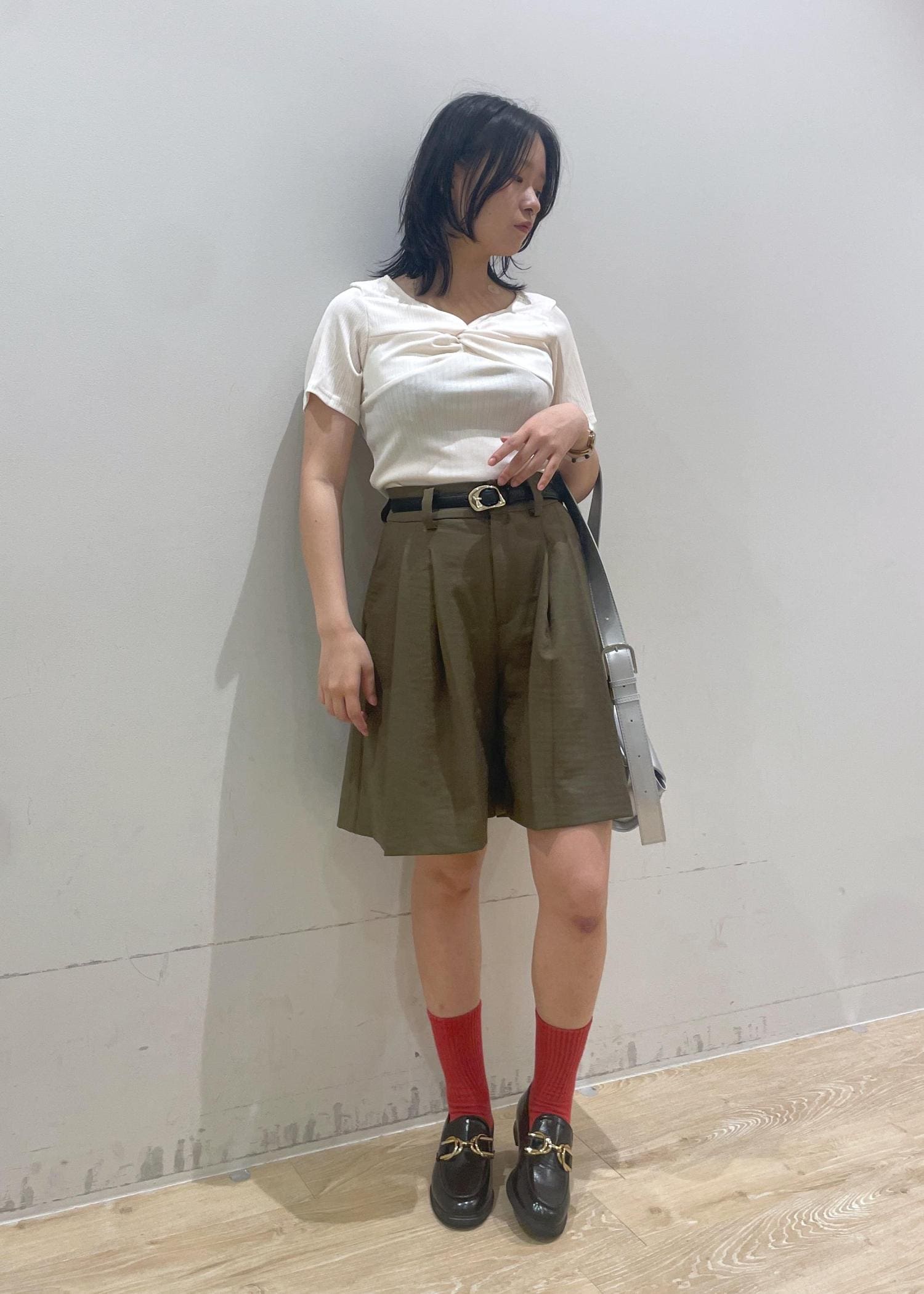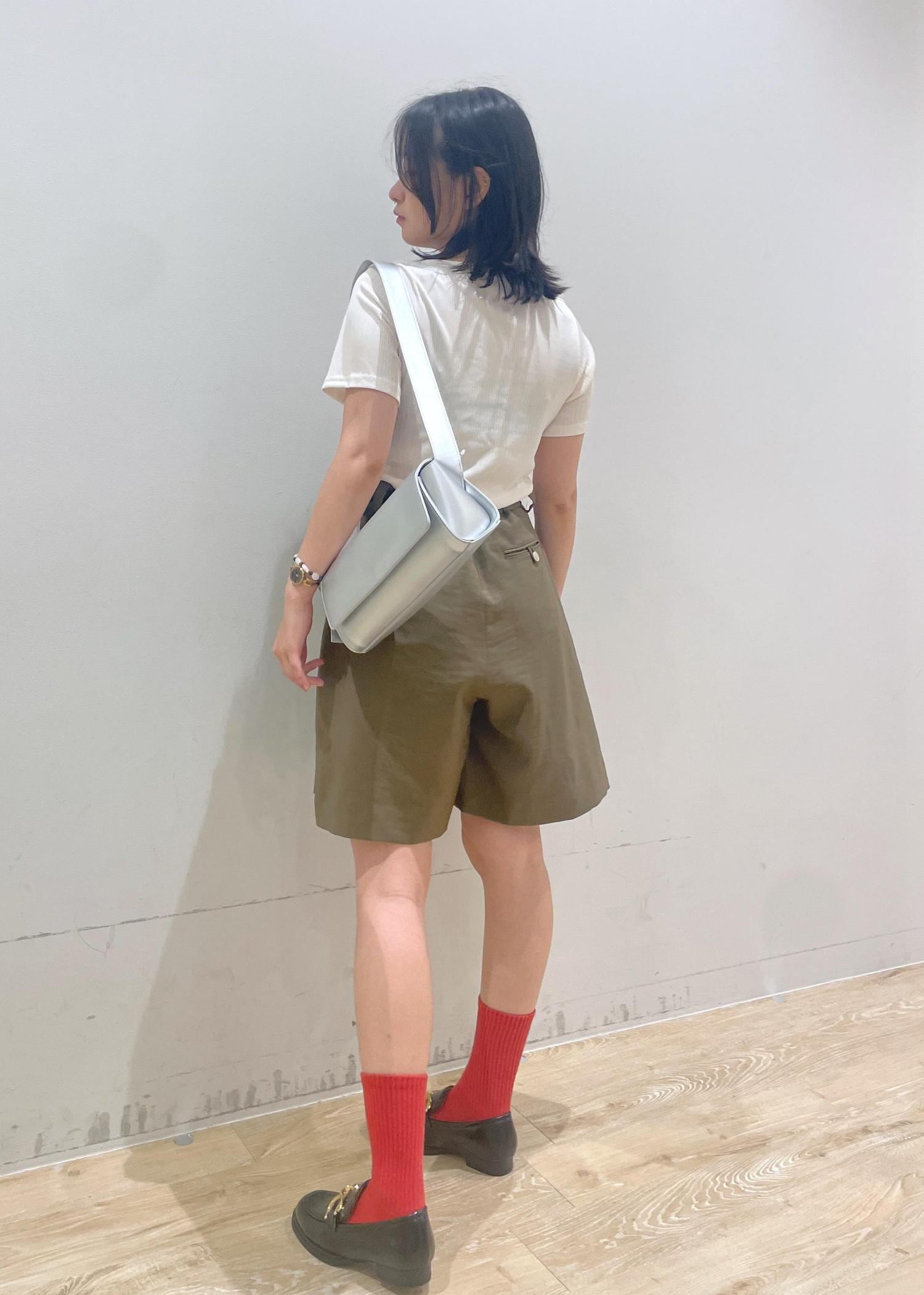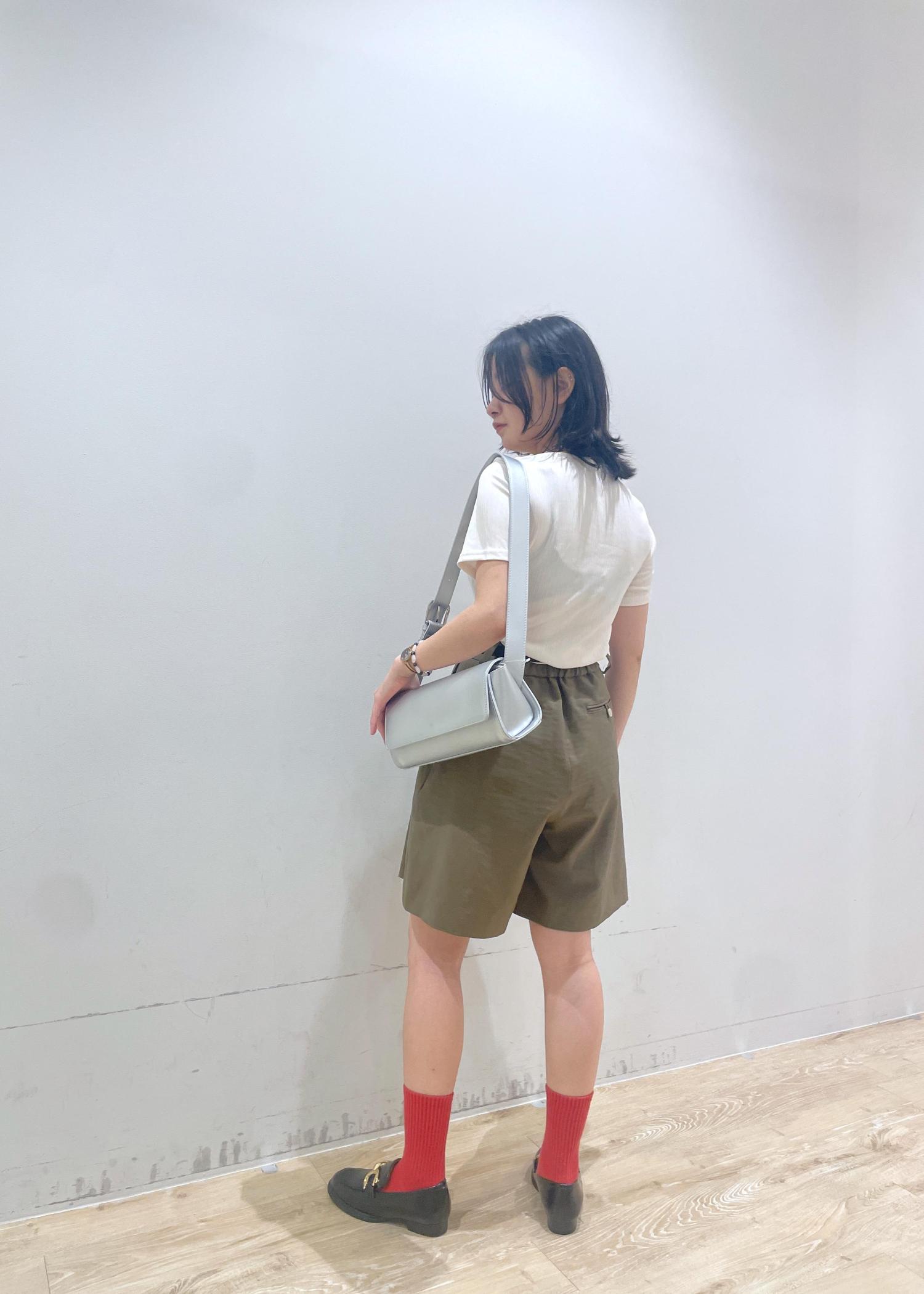シンプルな白Tとカーキショーパンでカジュアルさを出しつつ、赤ソックスでアクセントを効かせたコーデです!