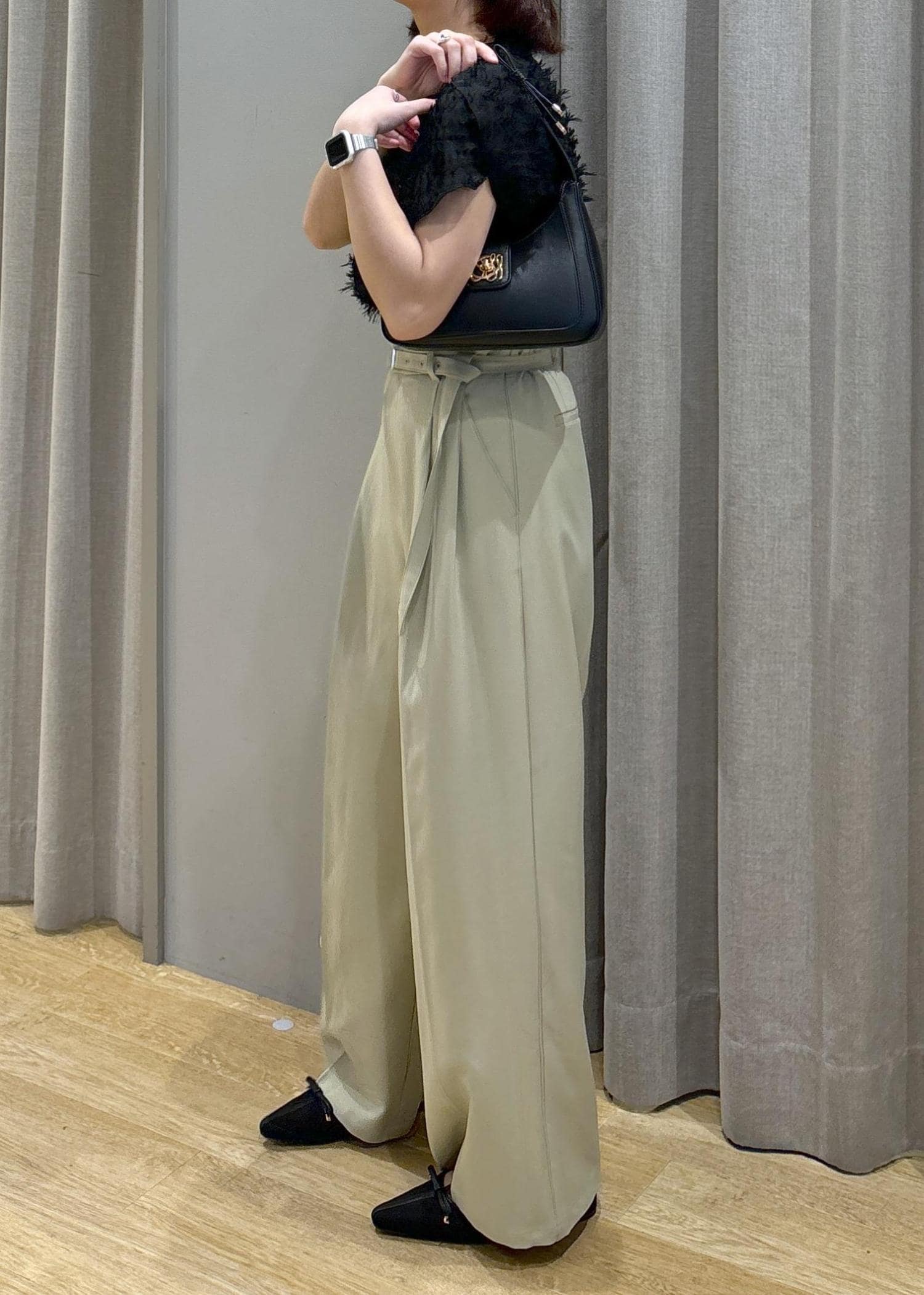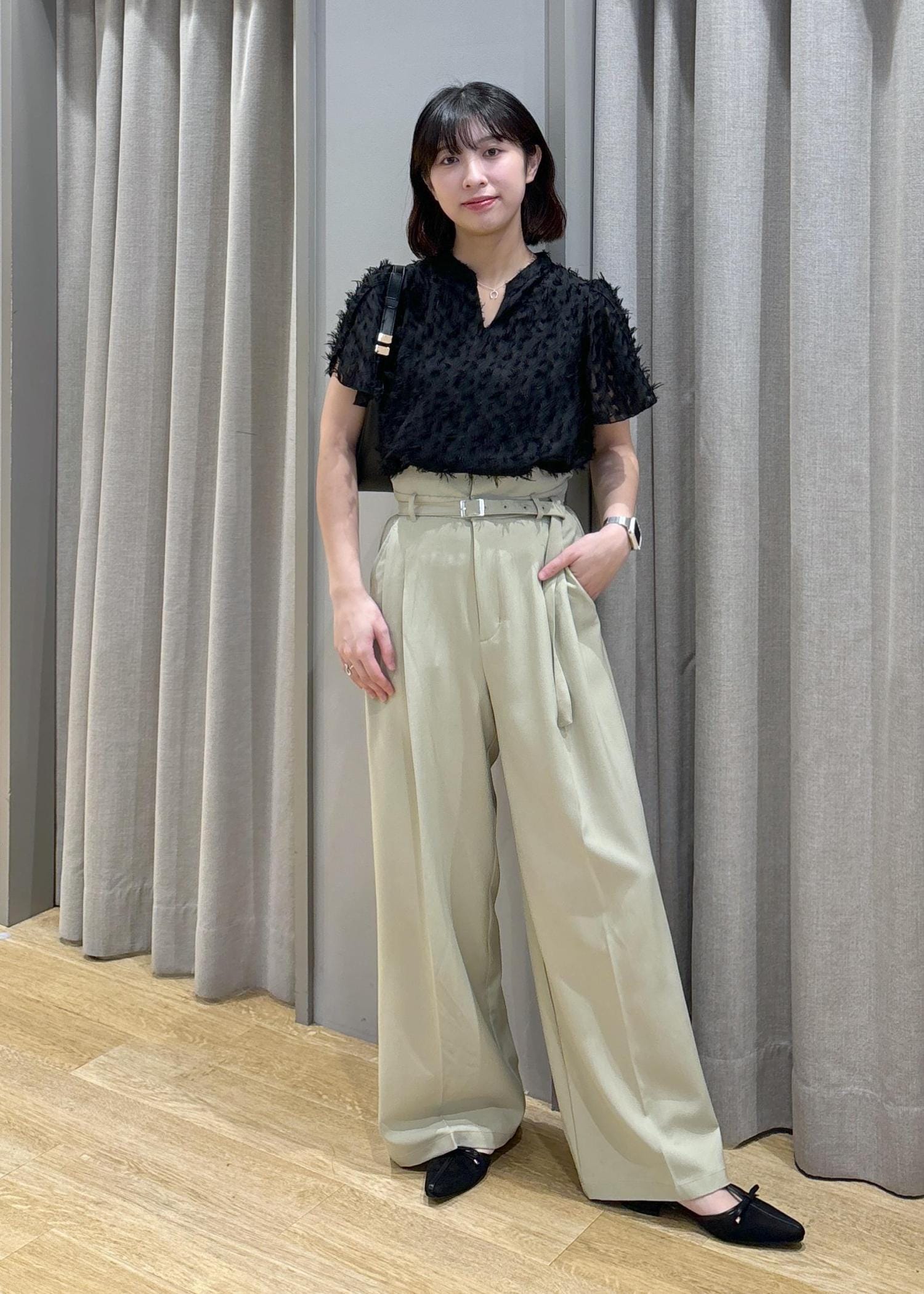 VIS【新色追加】【防シワ/接触冷感】ベルトディテールタックワイドスラックスパンツライトグリーン / M¥6,589レビュー身長158cm、Mサイズ着用。