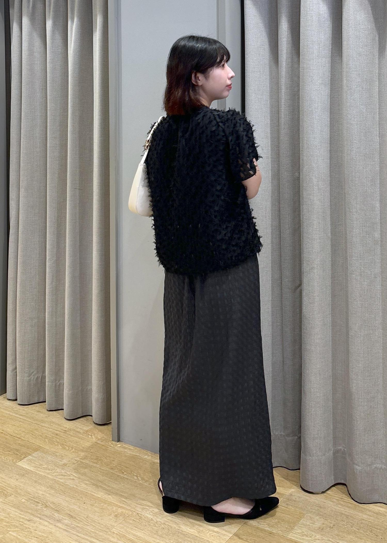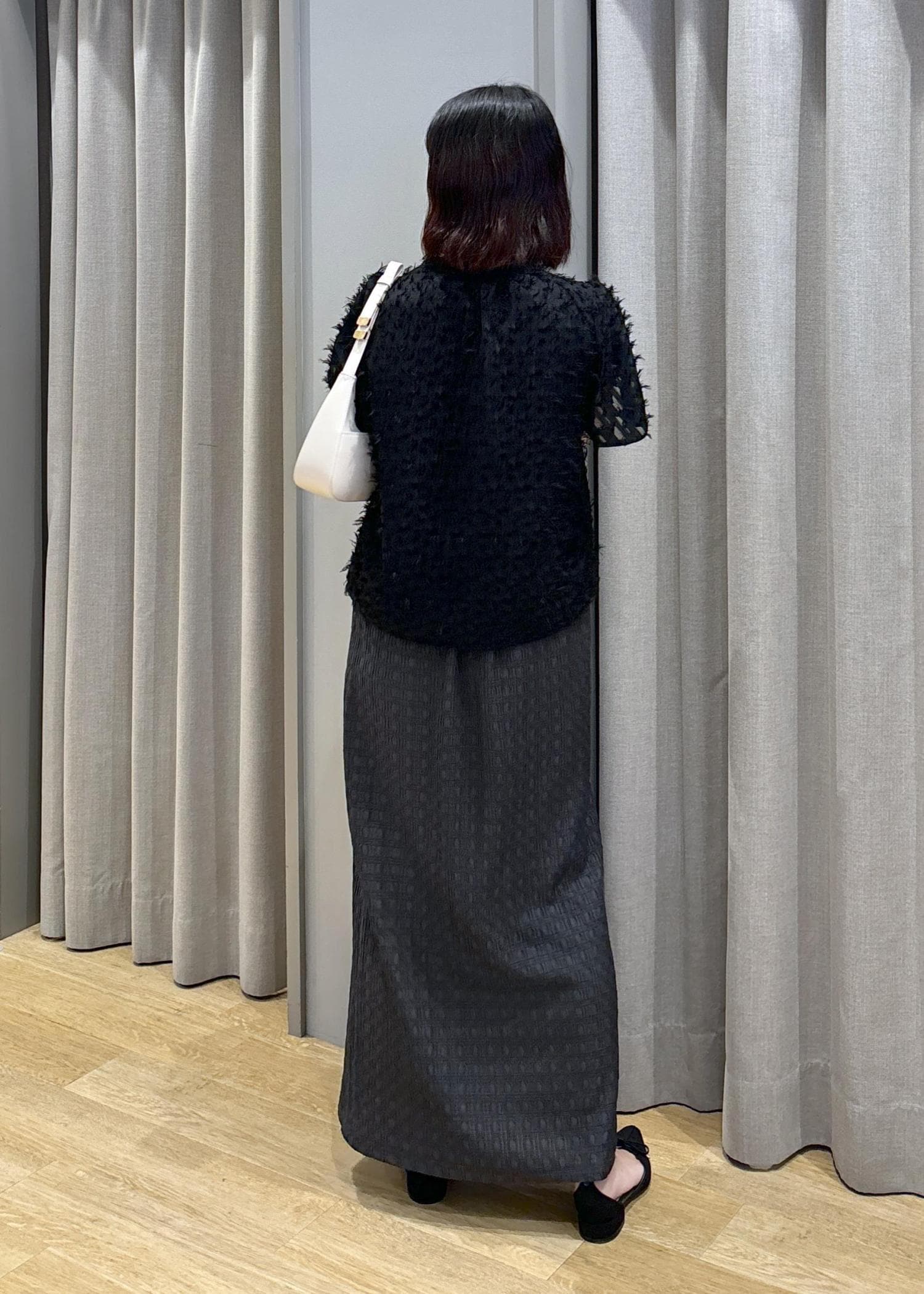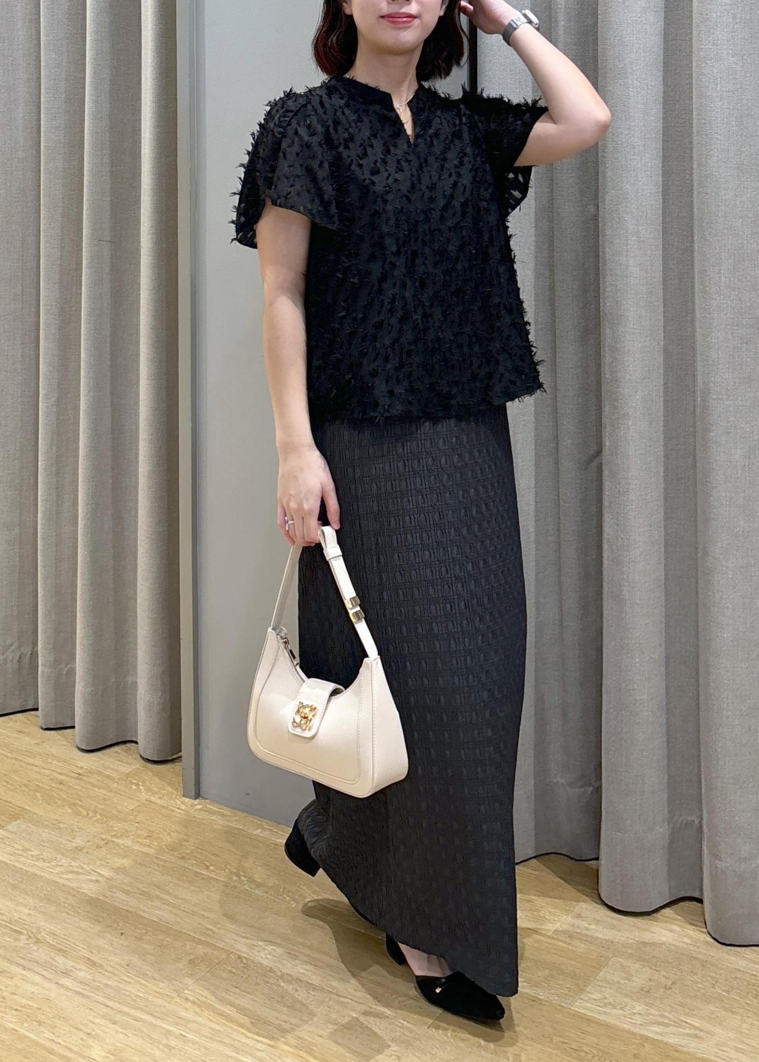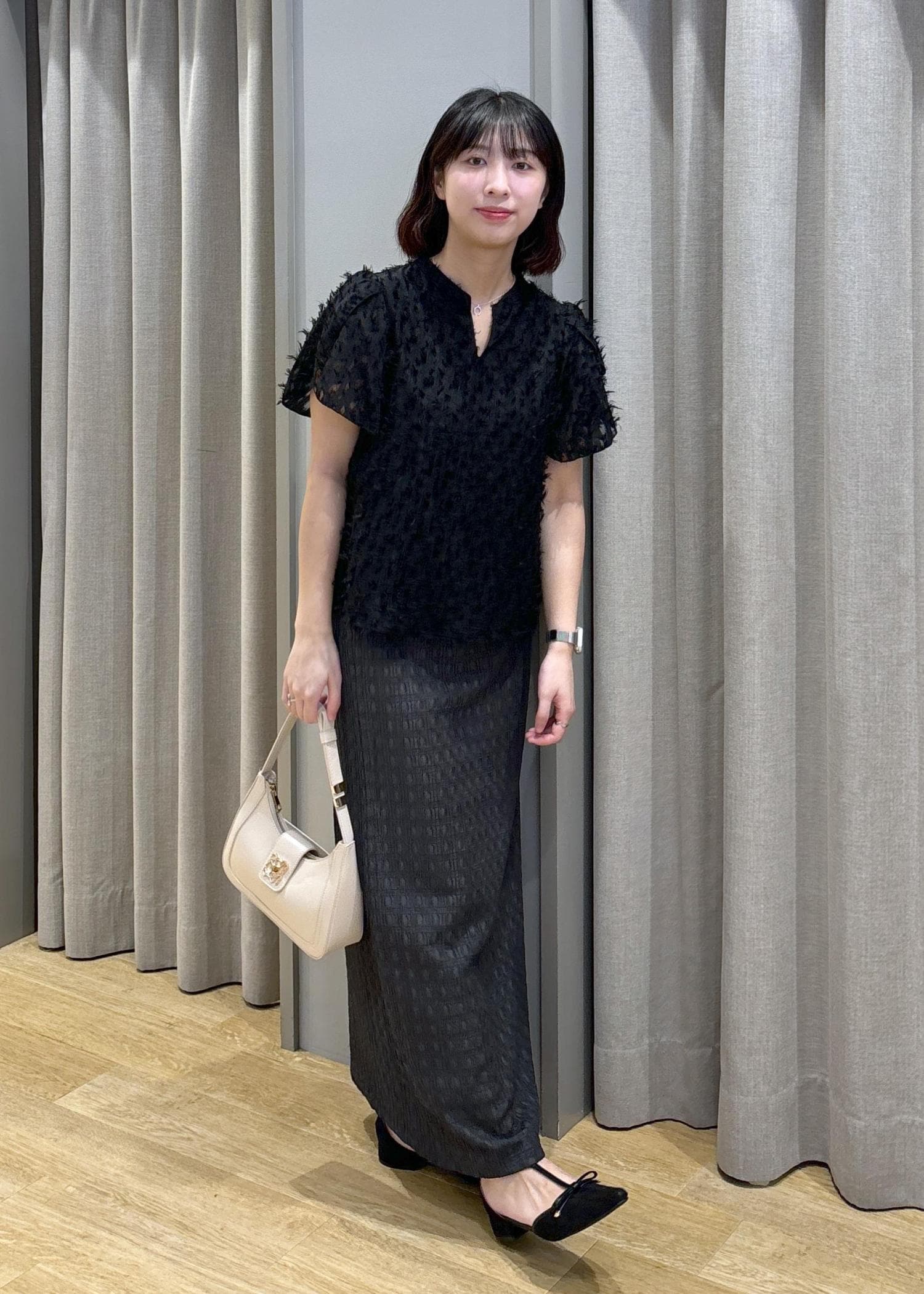 VISチューリップスリーブジャガードスキッパーブラウスブラック / F¥2,963レビュー身長158cm、Fサイズ着用。