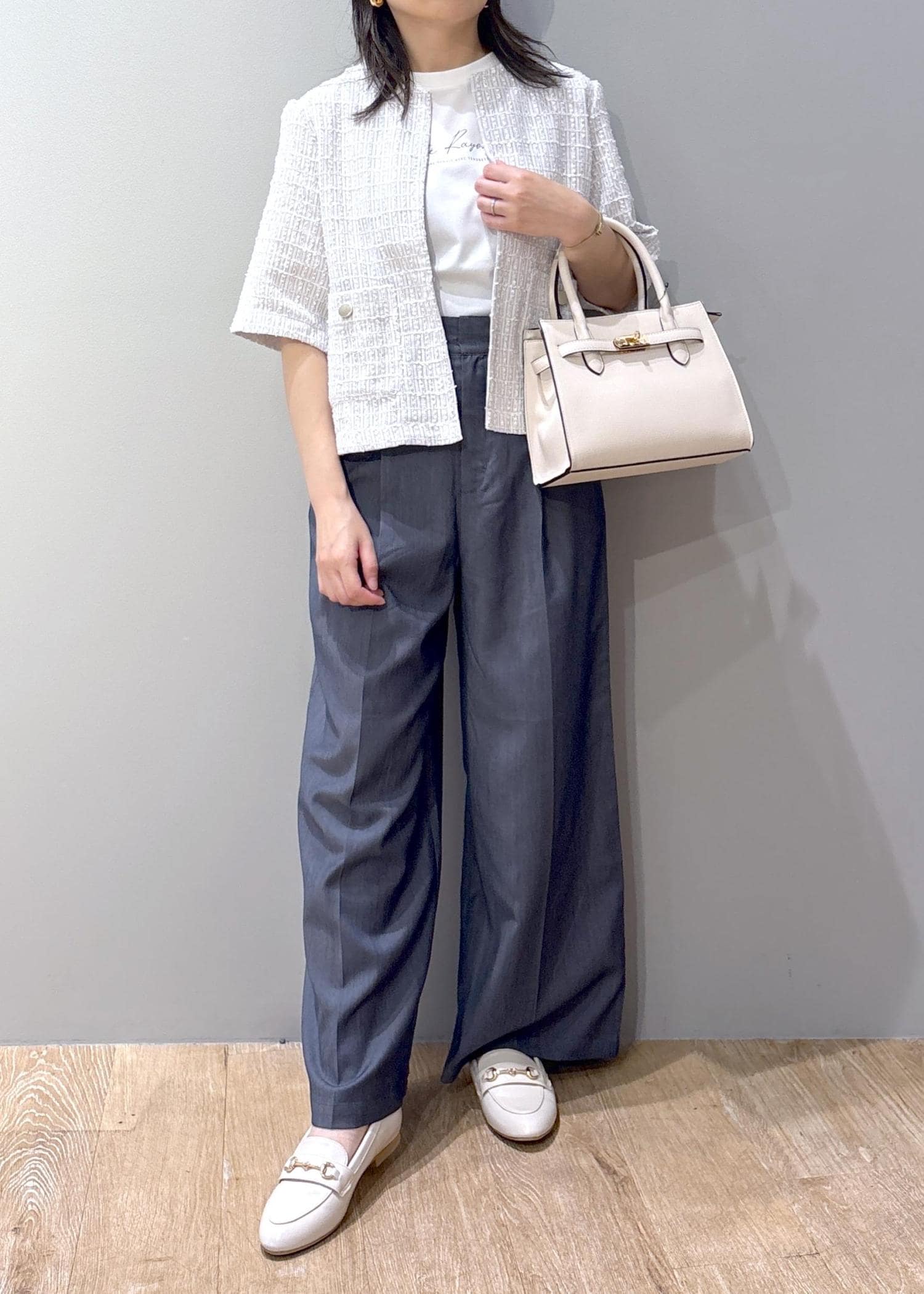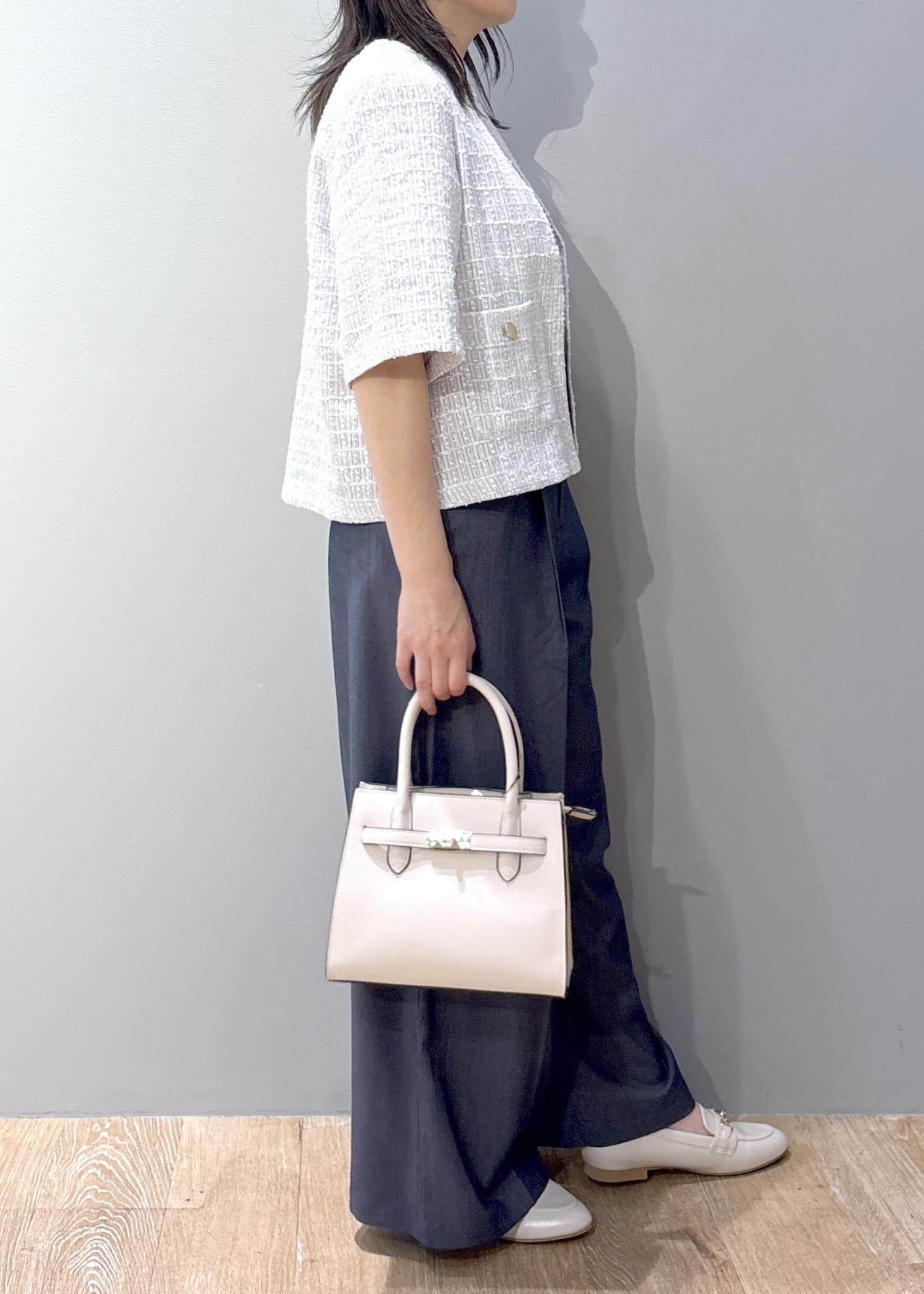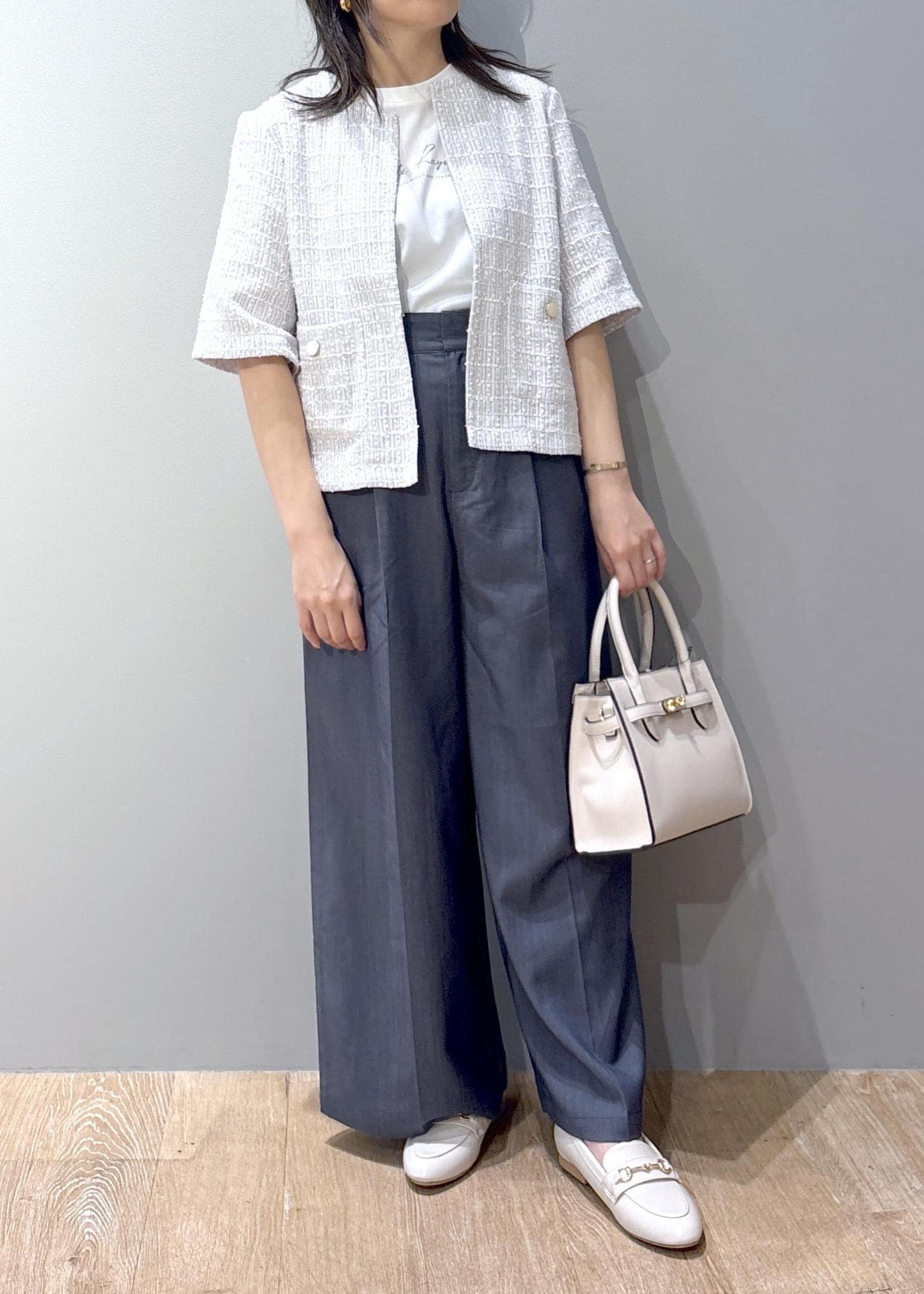 バッグとローファーはホワイトで合わせて、爽やかなオフィスカジュアルコーデにしてみました。