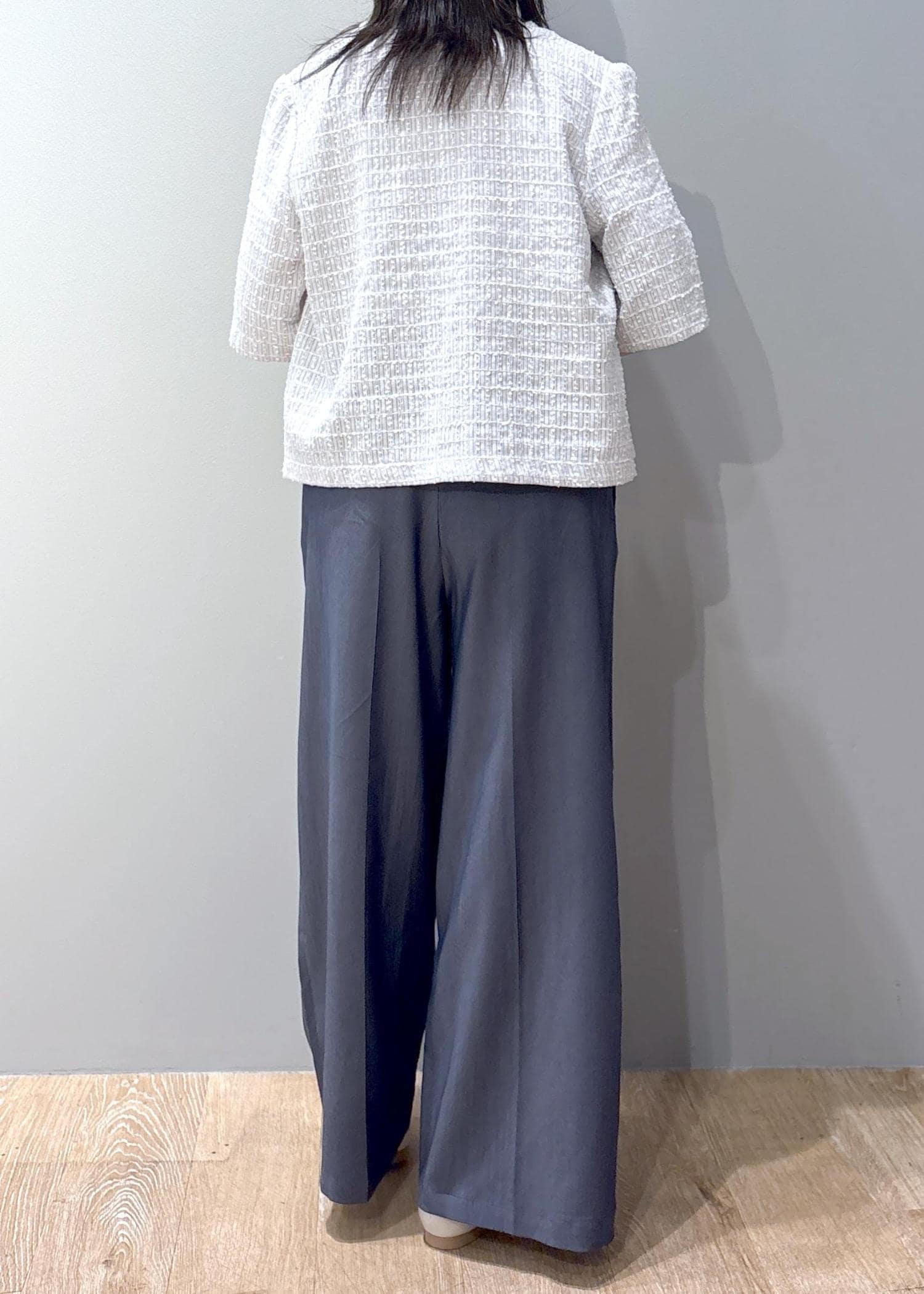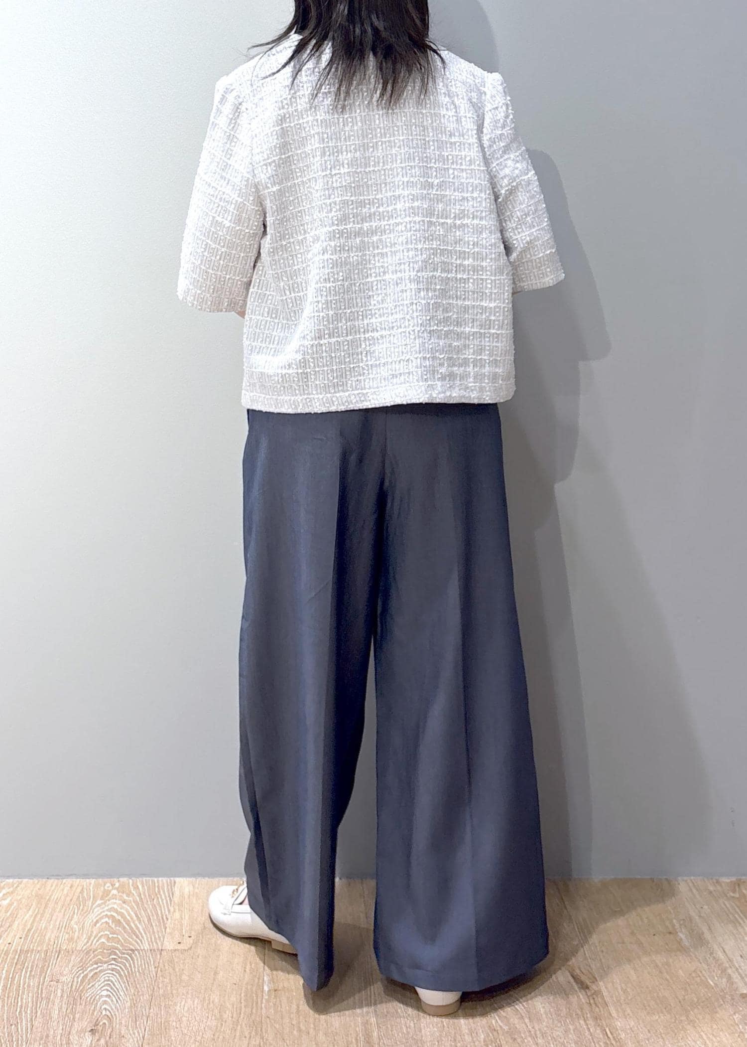 ワイドシルエットですが、タックラインが入っているので大きく見えずすっきり◎