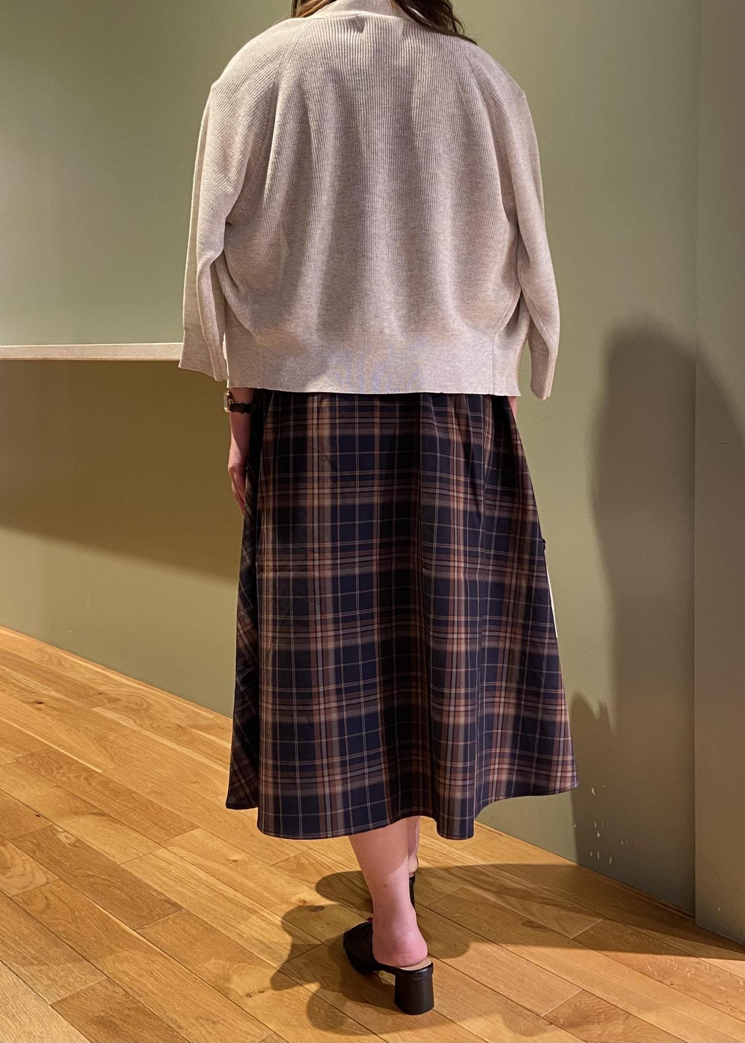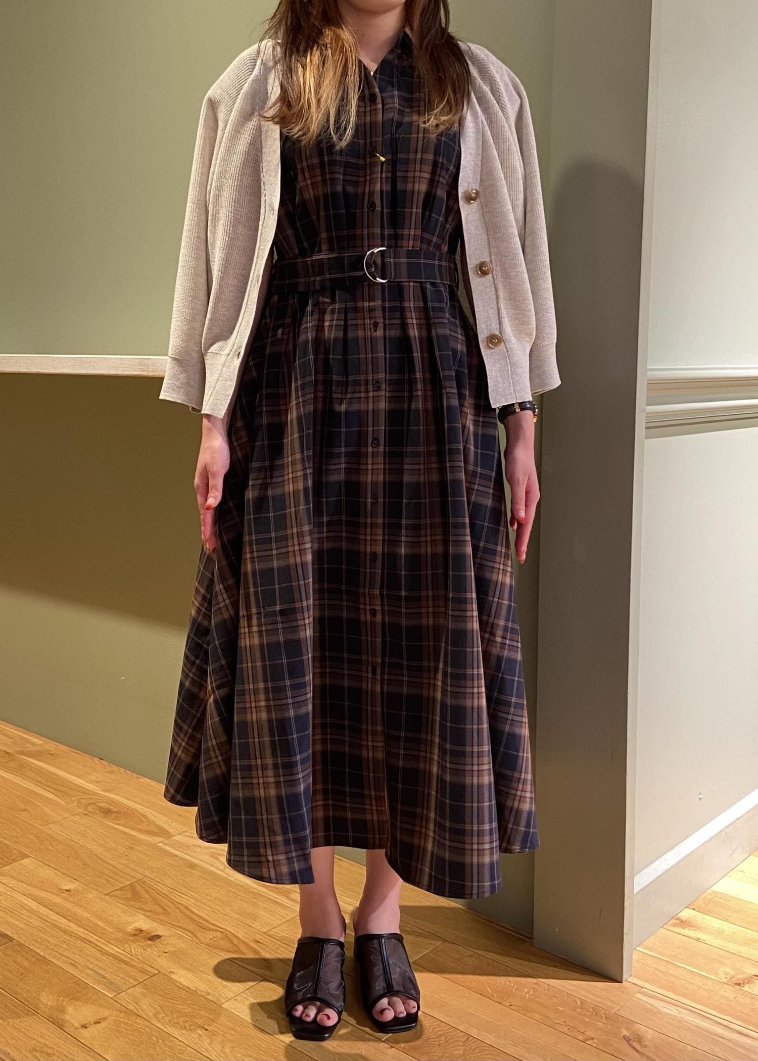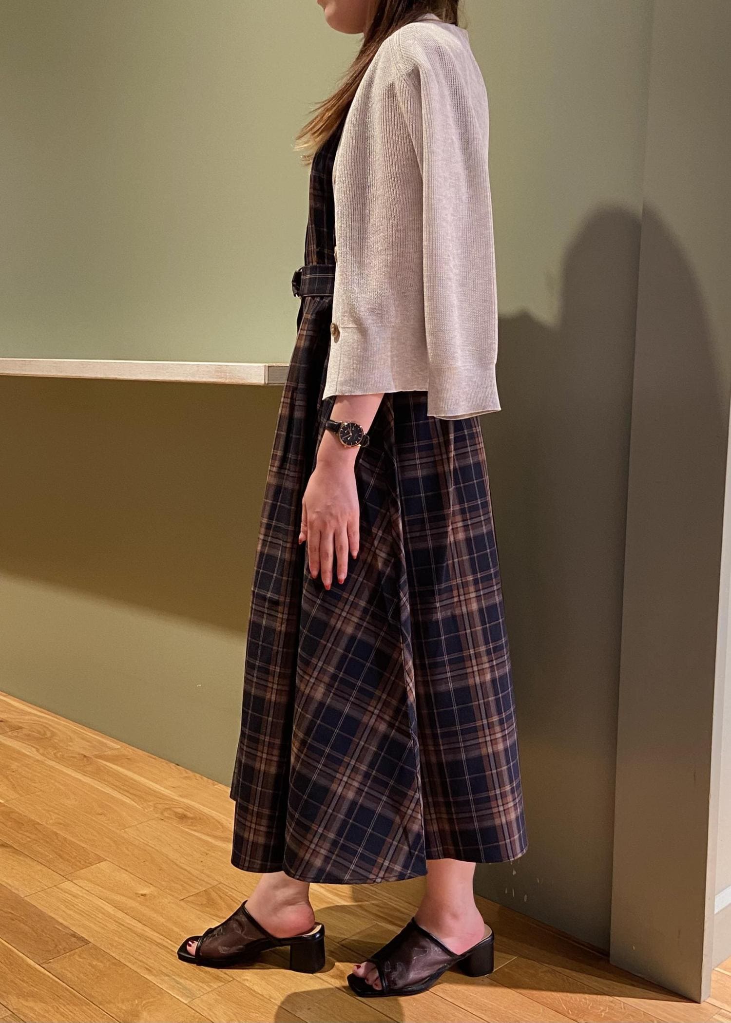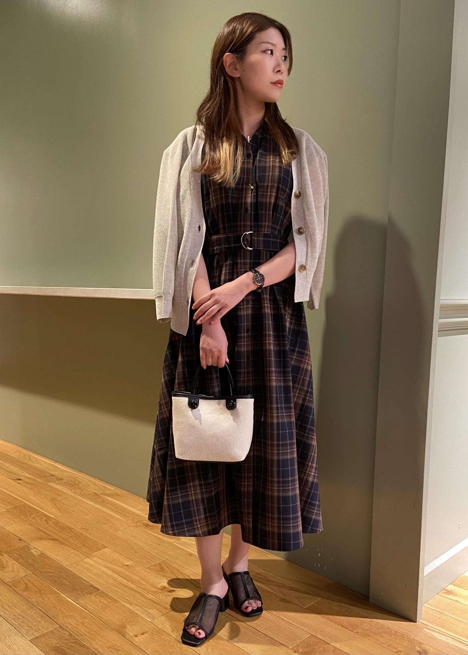 ブラウンのチェック柄のワンピースにホワイトのカーディガンを合わせた秋を意識したコーデにしました。