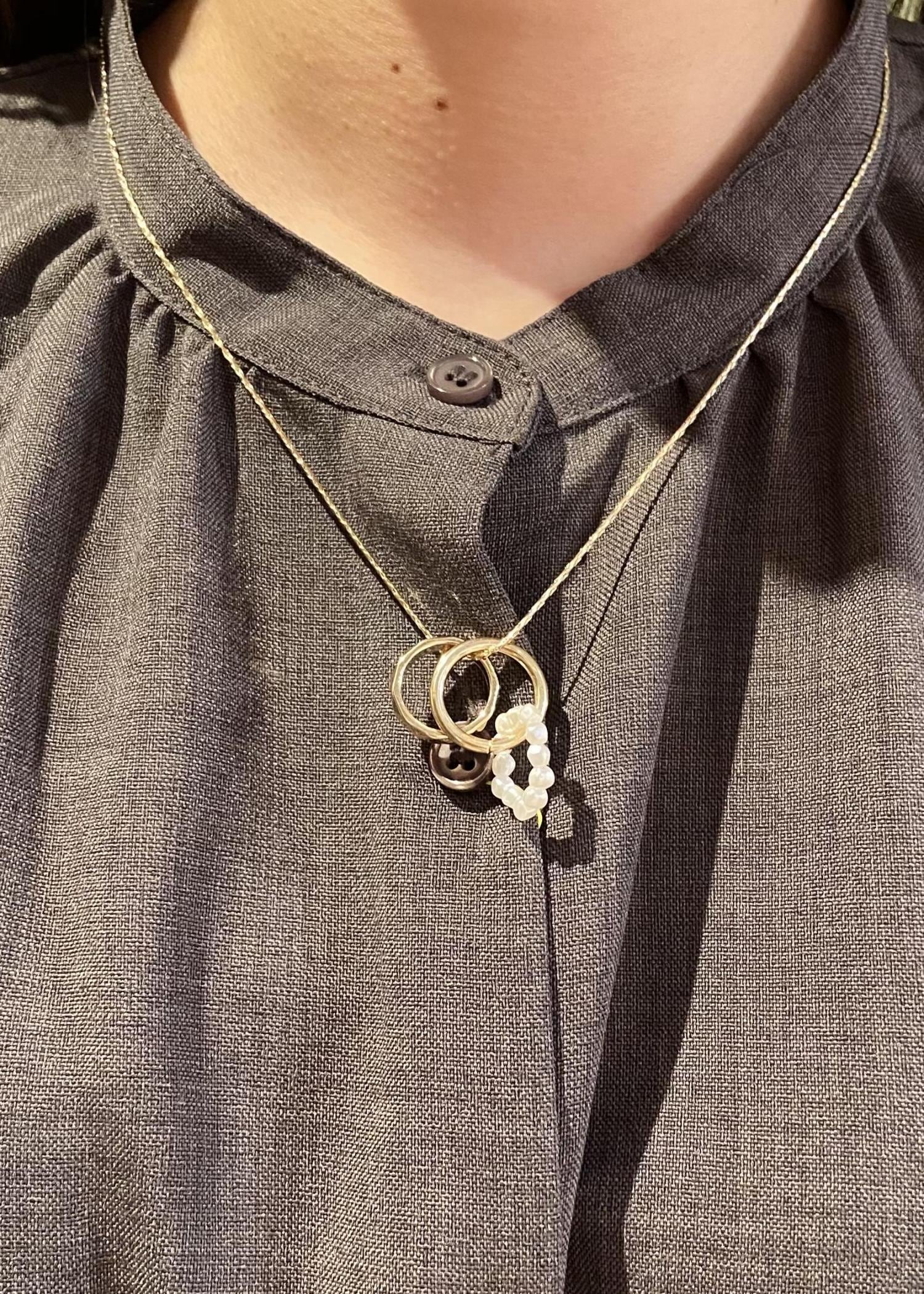 鎖骨の見えるデザインのトップスと相性が良いです。