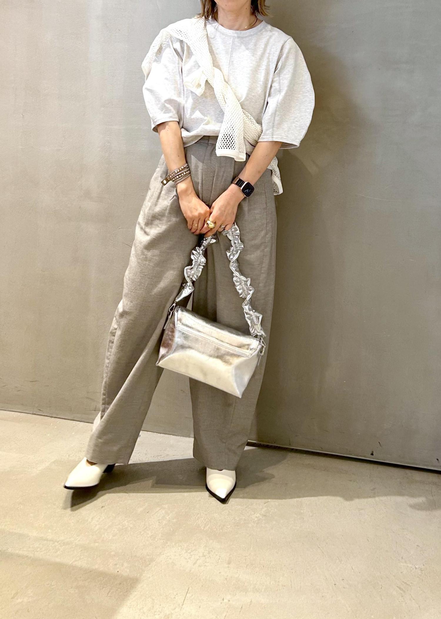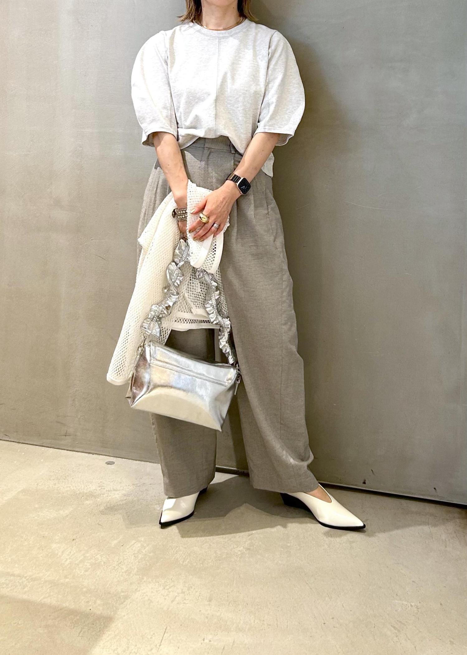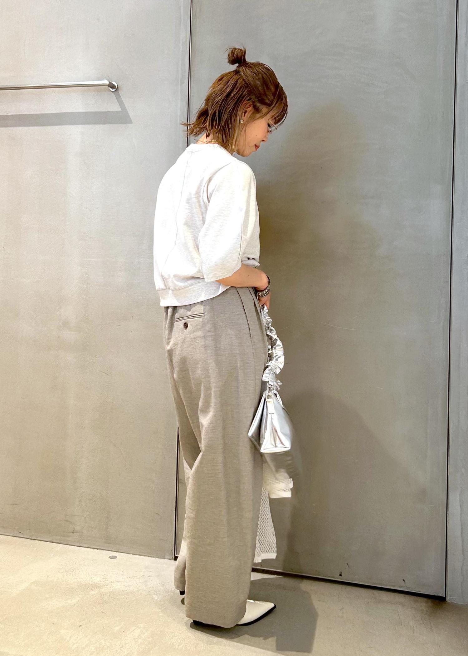 軽さのあるライトグレーでまとめましたが、トップスは薄手のスウェット素材で、ちょっと秋を意識しました。