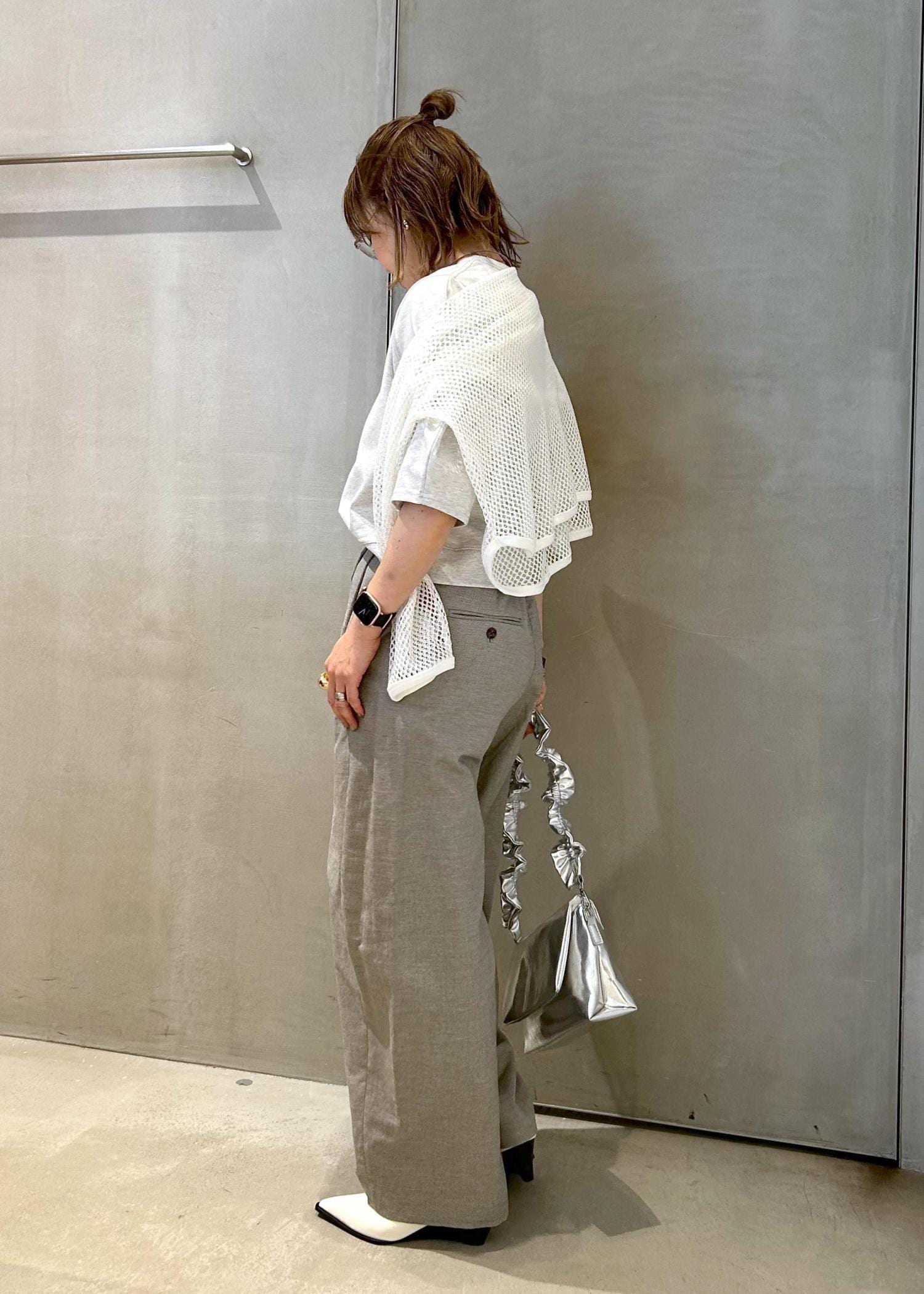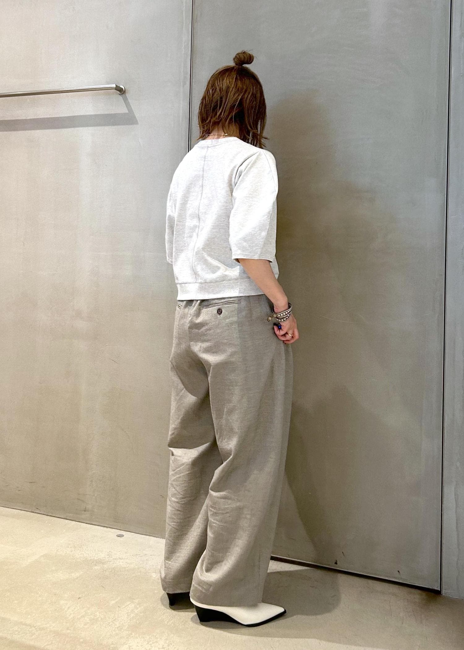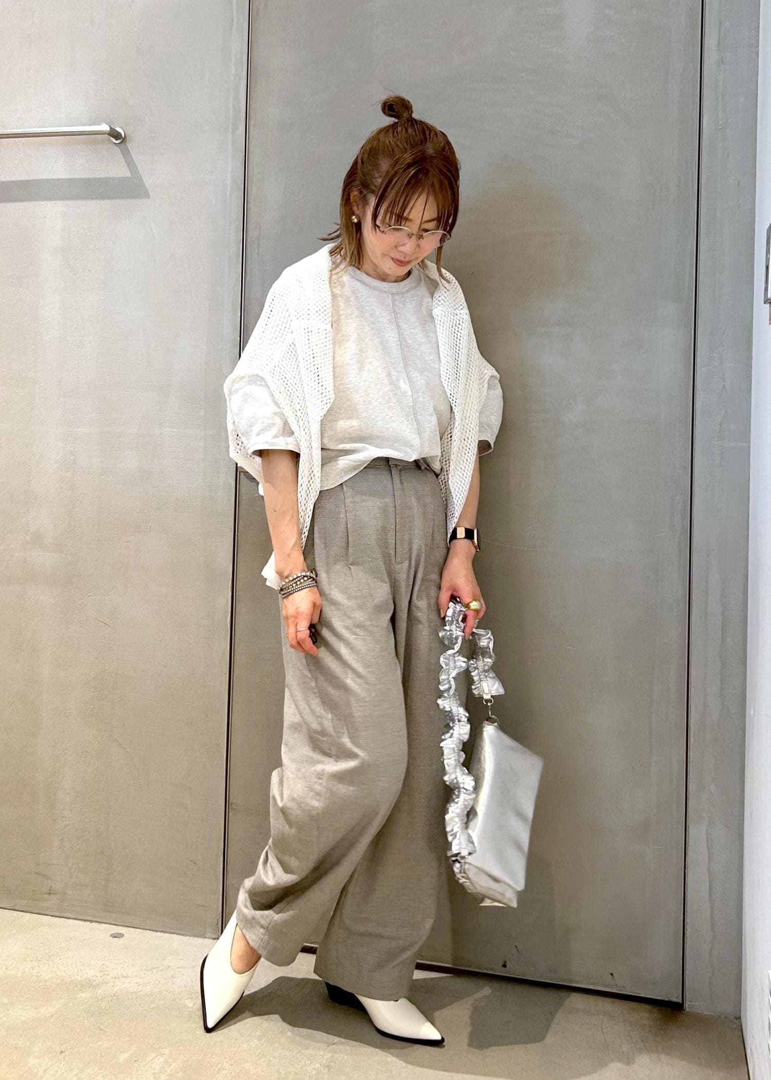 軽さのあるライトグレーでまとめましたが、トップスは薄手のスウェット素材で、ちょっと秋を意識しました。