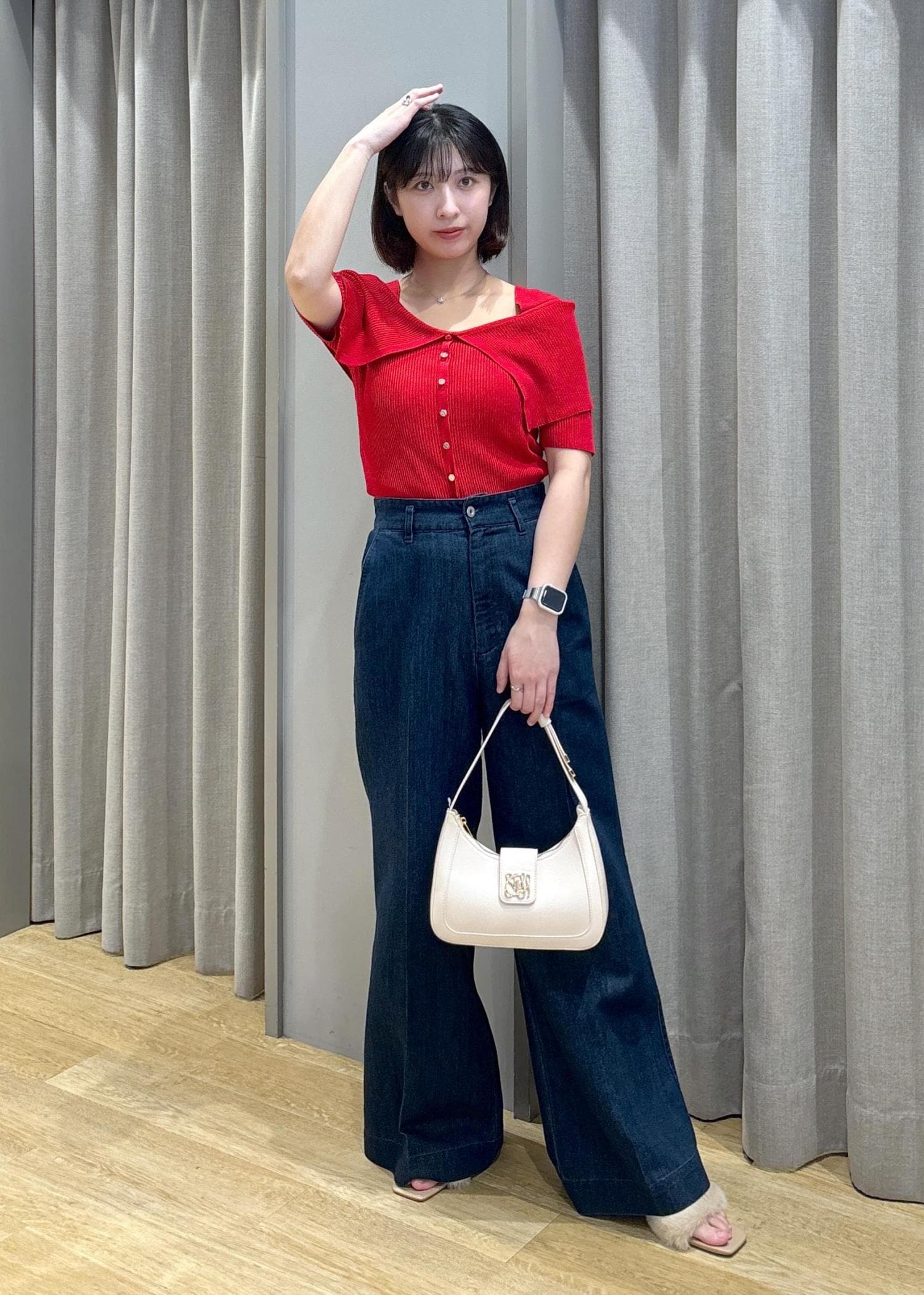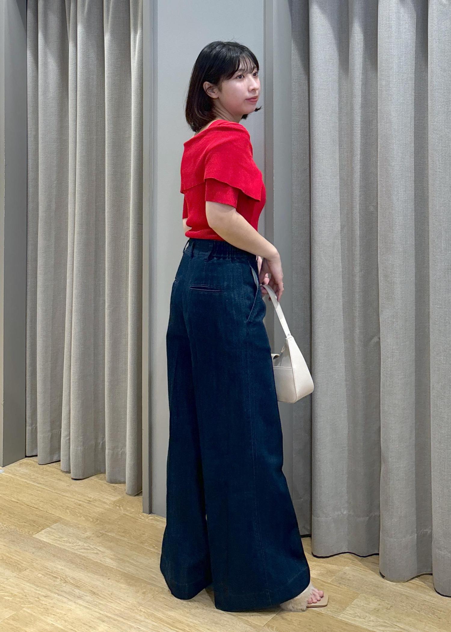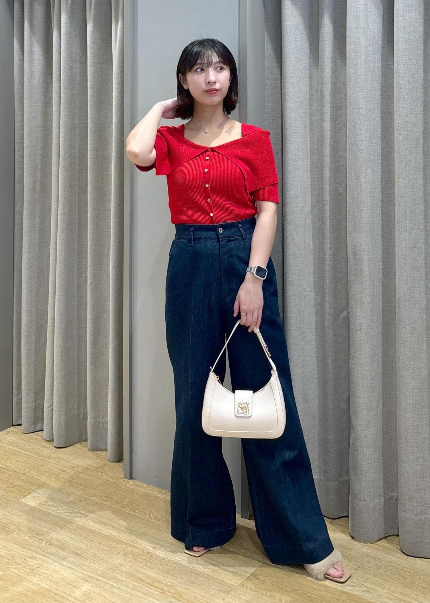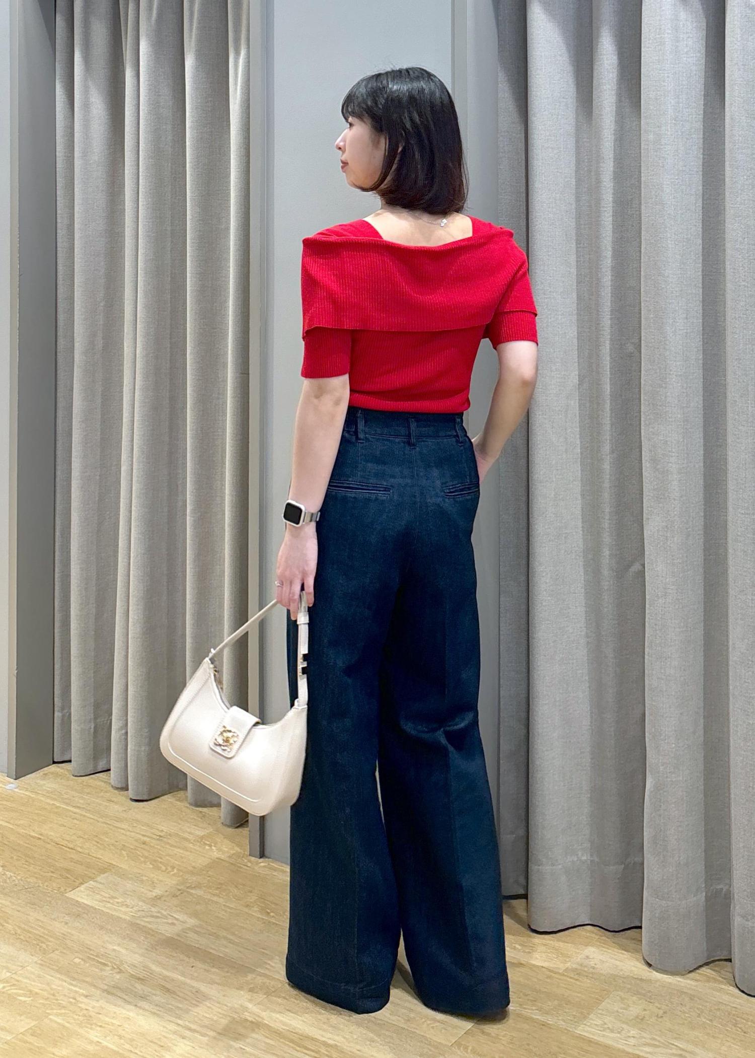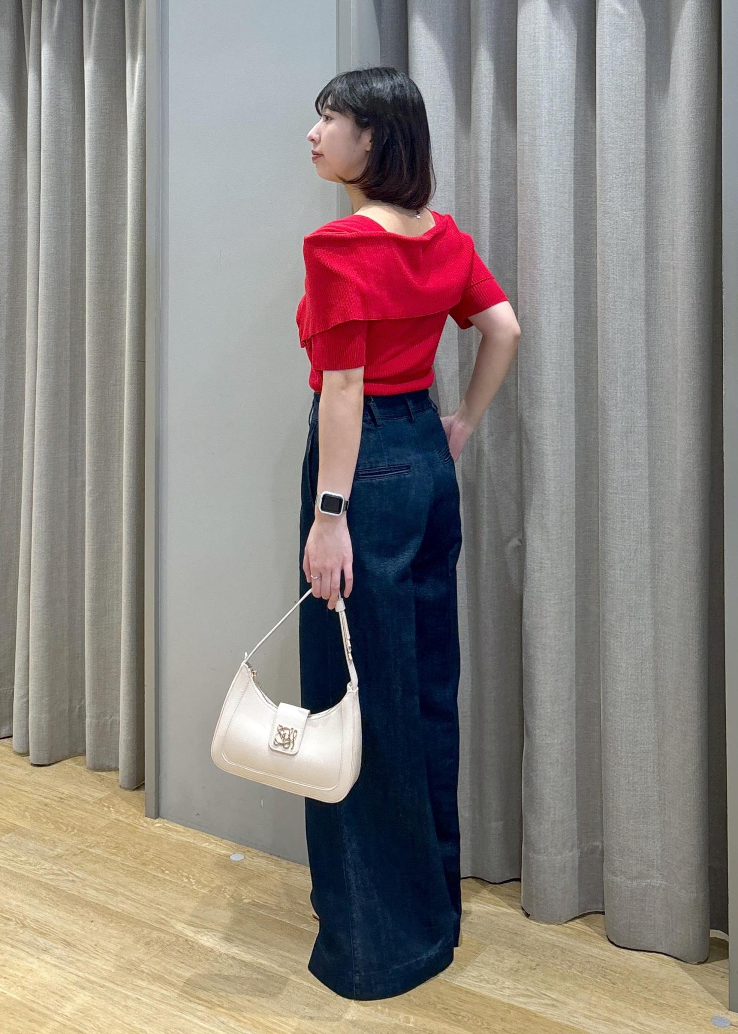 VISビックカラーオフショルハーフスリーブニットレッド / F¥2,963レビュー身長158cm、Fサイズ着用。