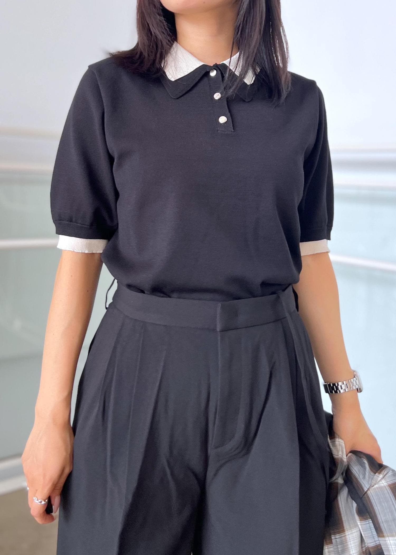襟元、袖口がレイヤーになっており、デザインがあるポロニットです。5分丈で二の腕が隠れて、安心丈です。