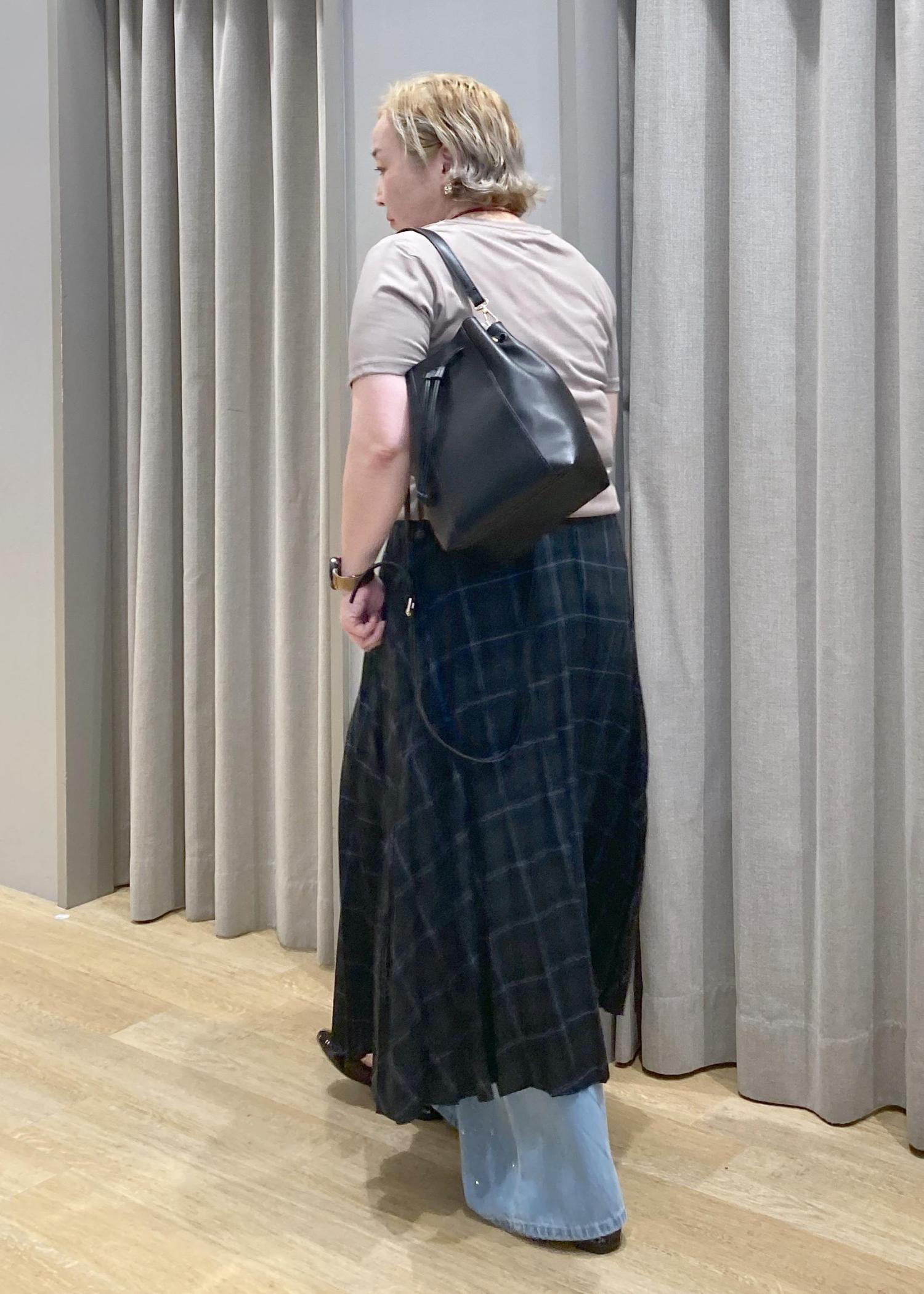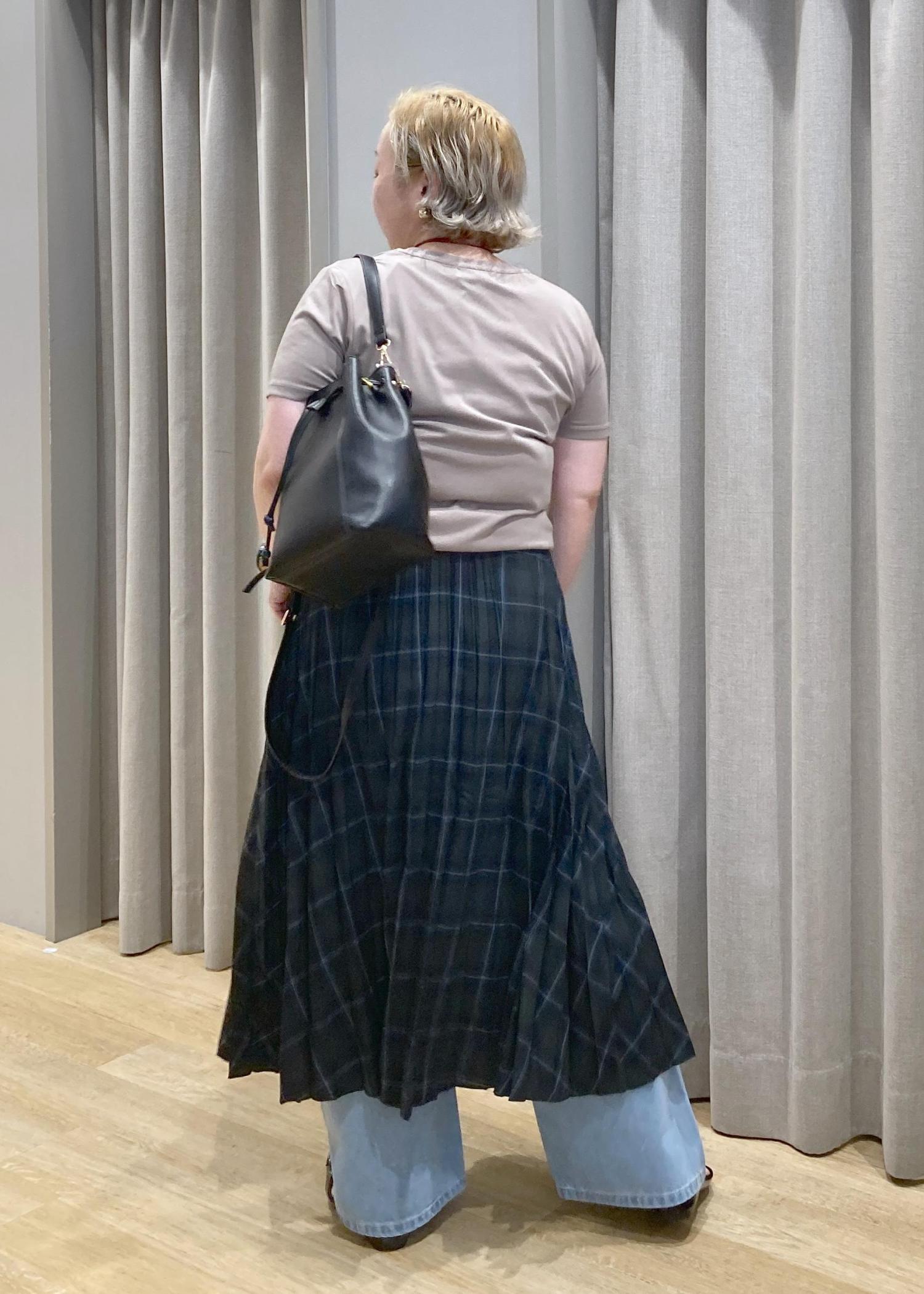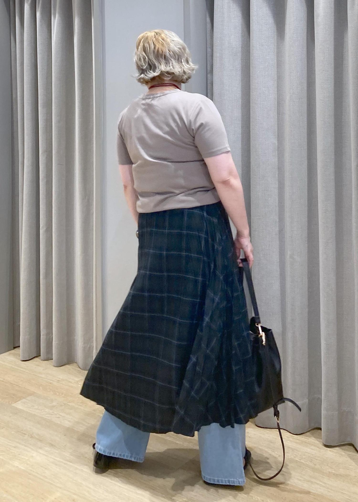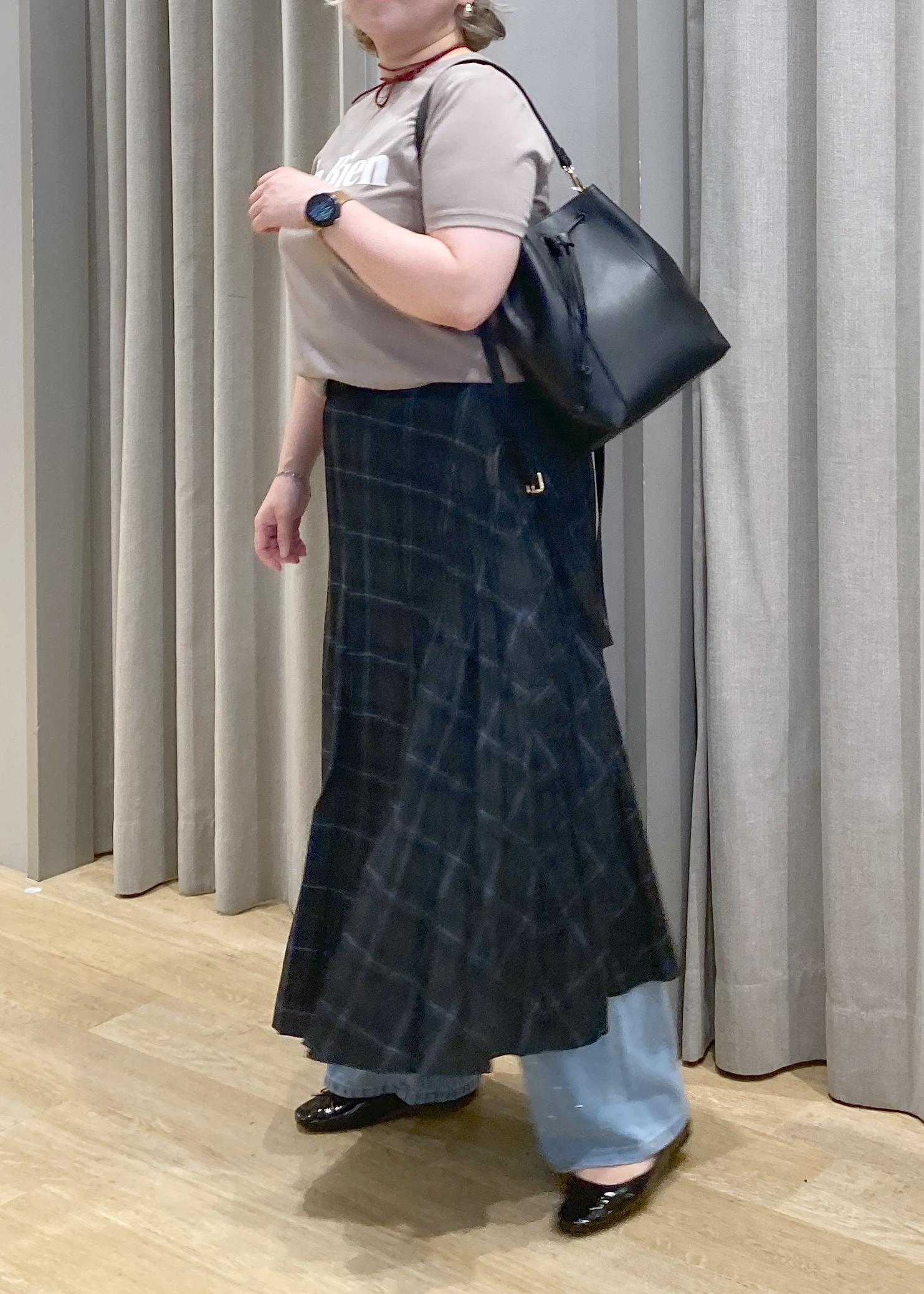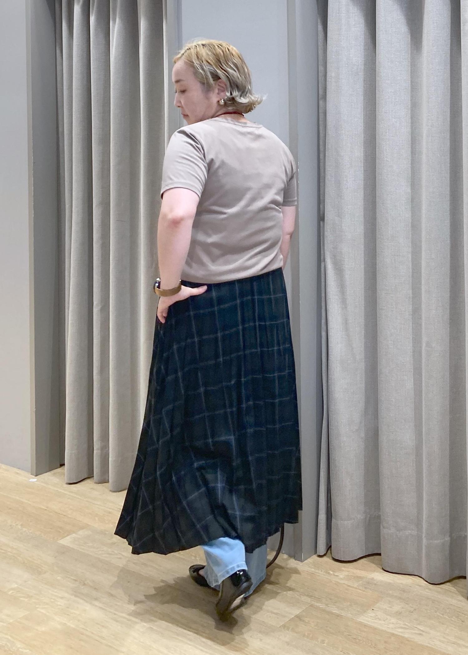 秋見えチェックスカートをプラスすれば、腰周りの体型カバーも出来ちゃいます。