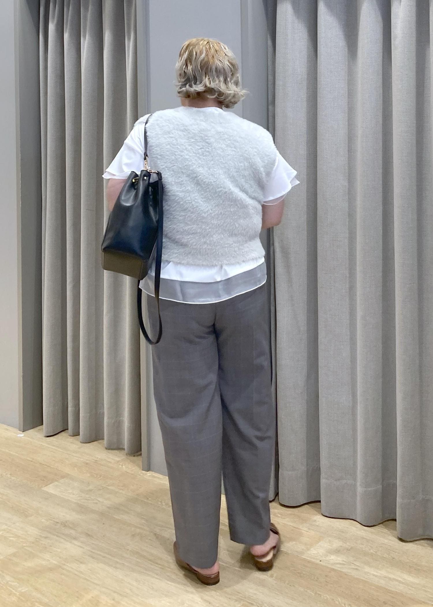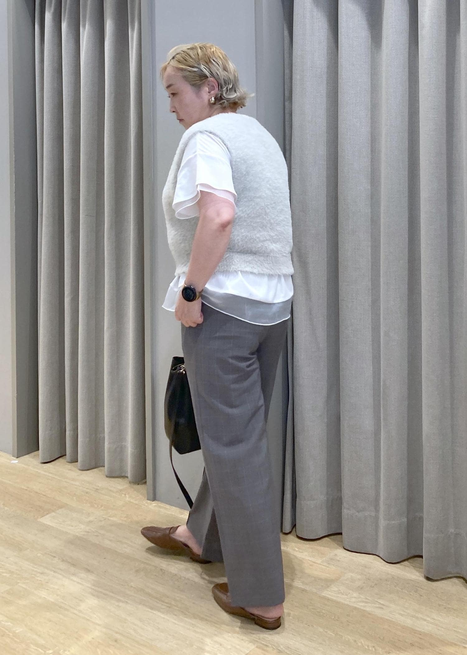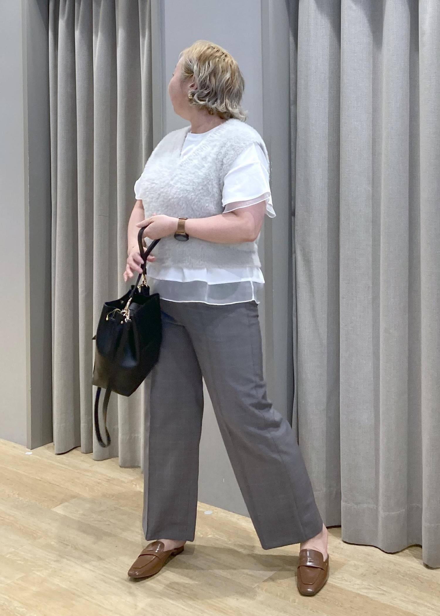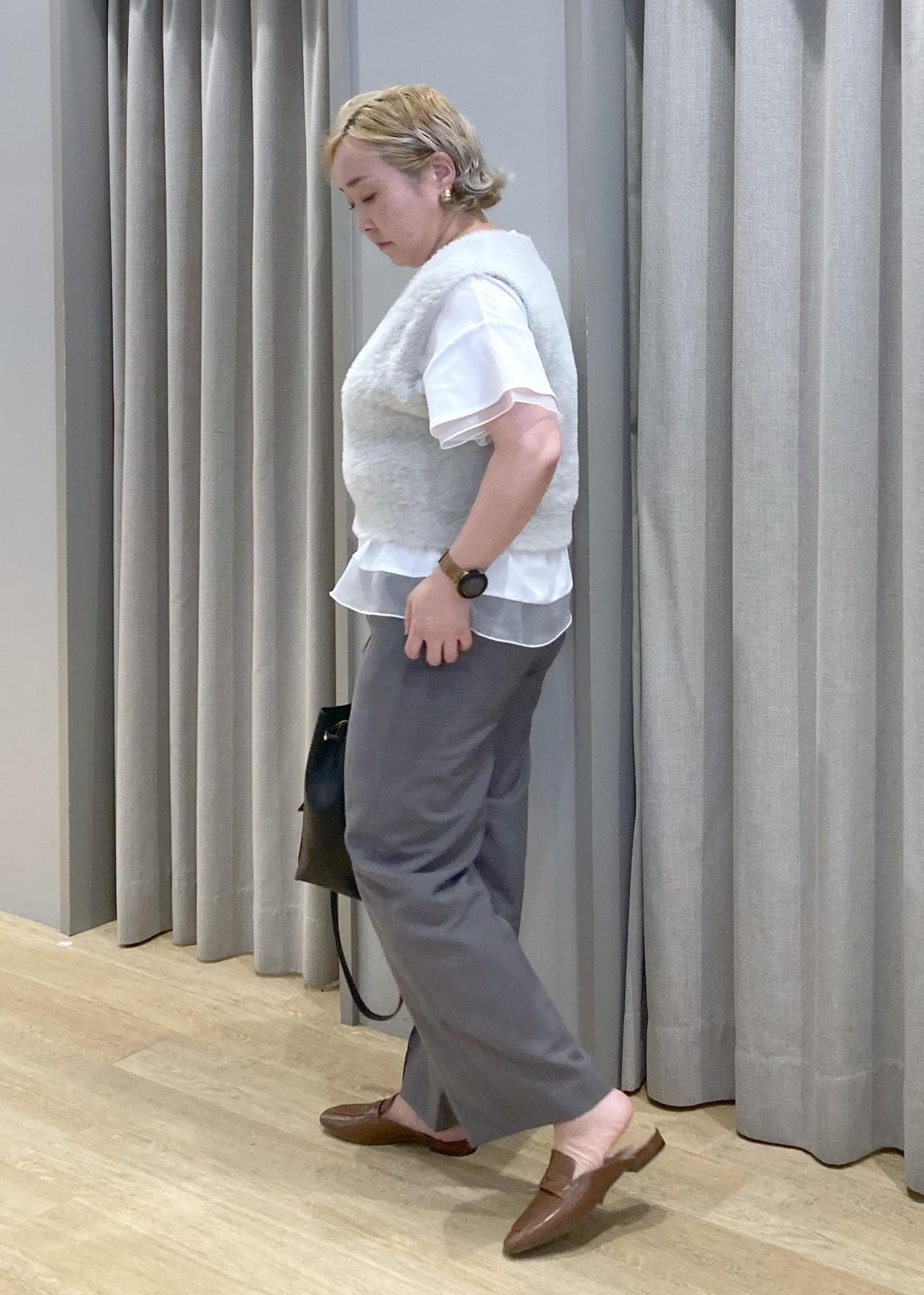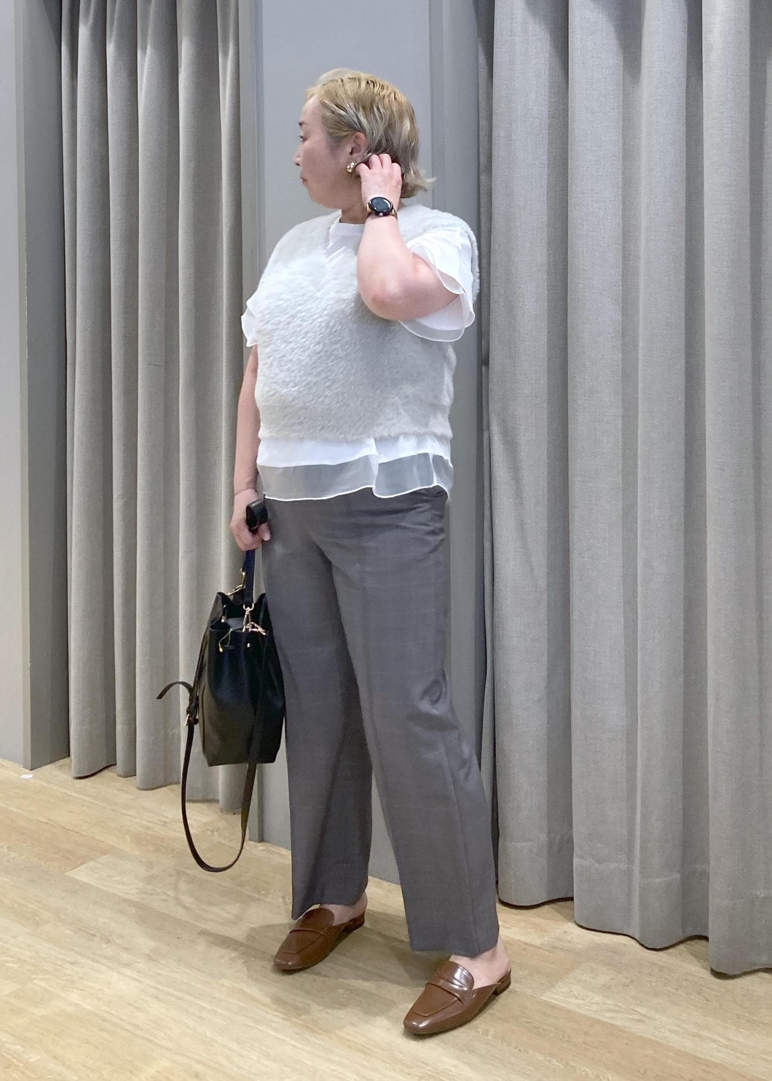 少し短めのファーベストも、チュールがひらりとしたインナーを合わせれば、体型カバーもしながら、可愛さもプラスしてました。ノースリーブでの一枚着が、苦手な方におすすめのスタイリングです