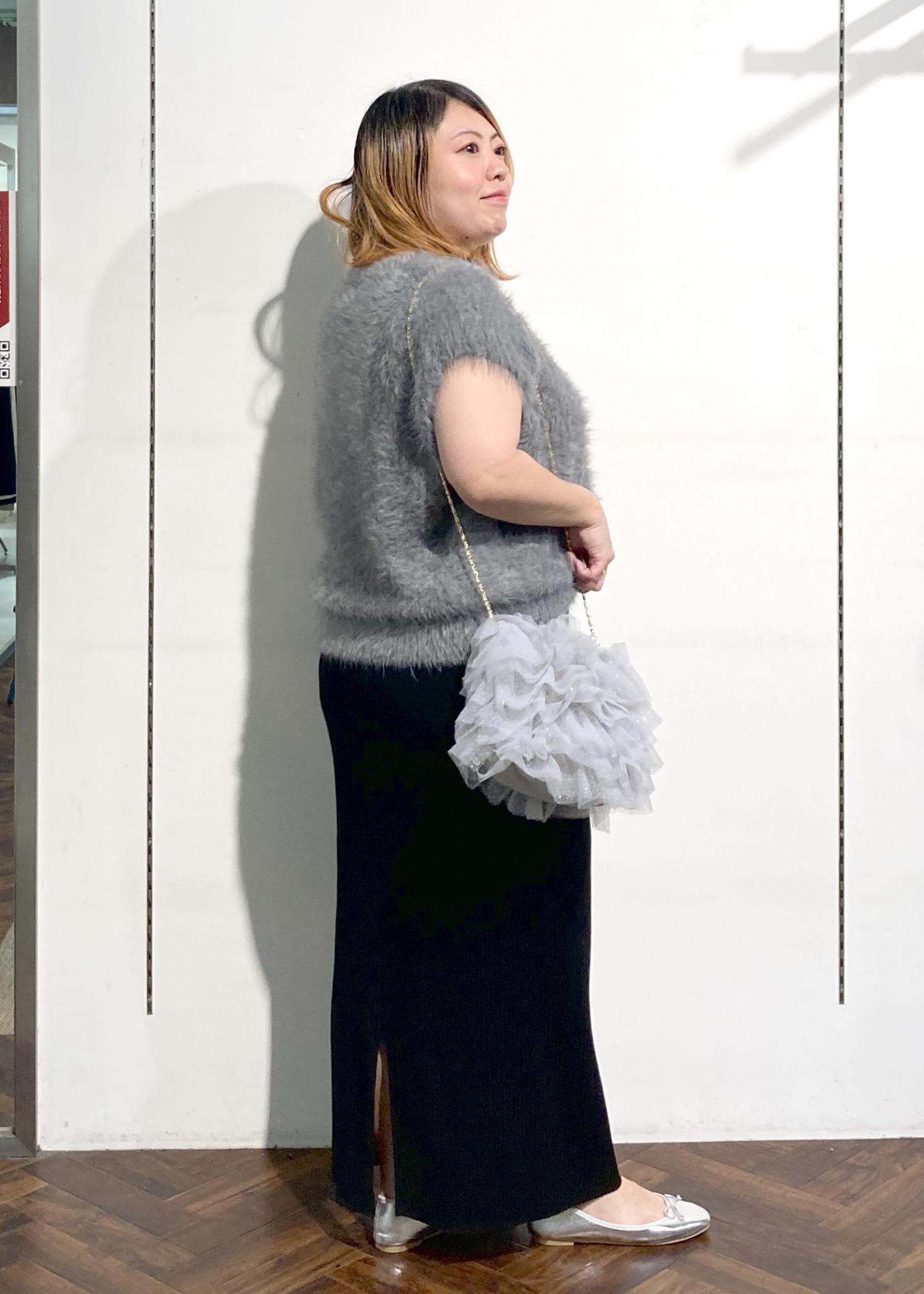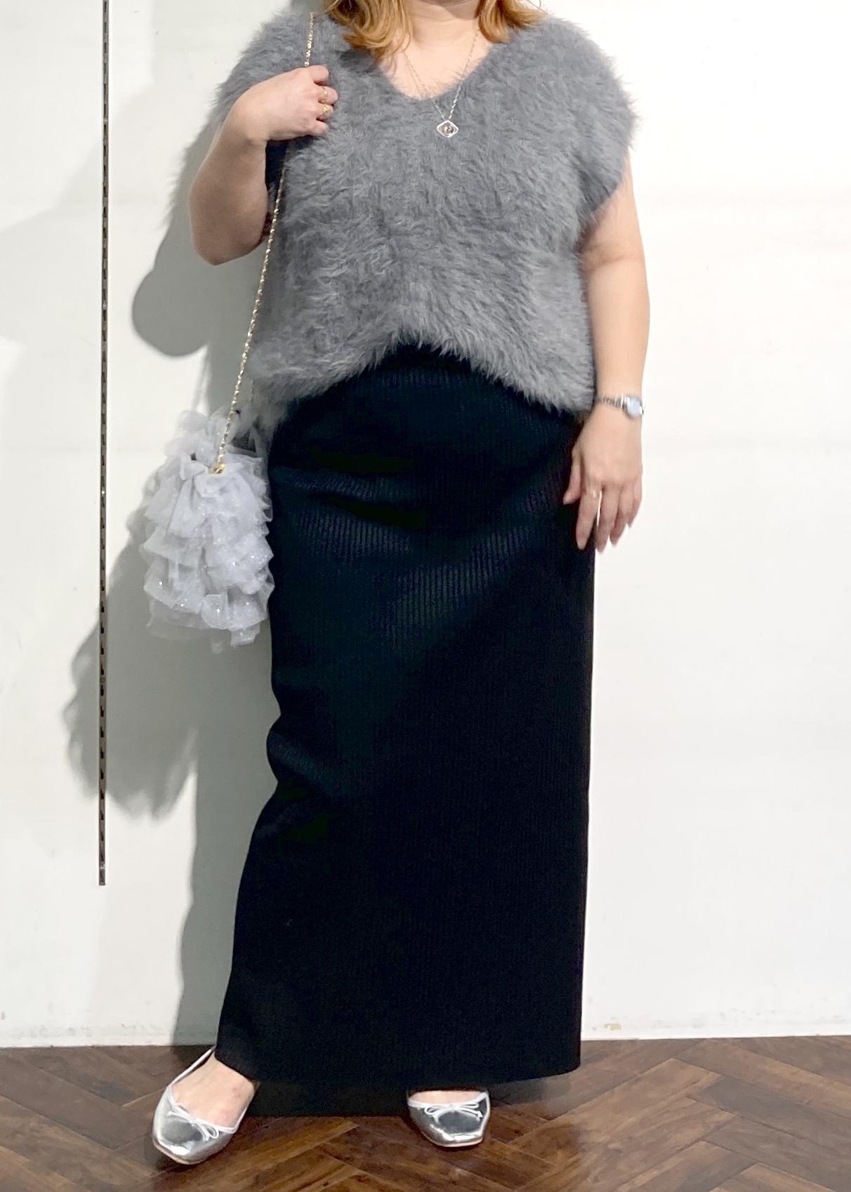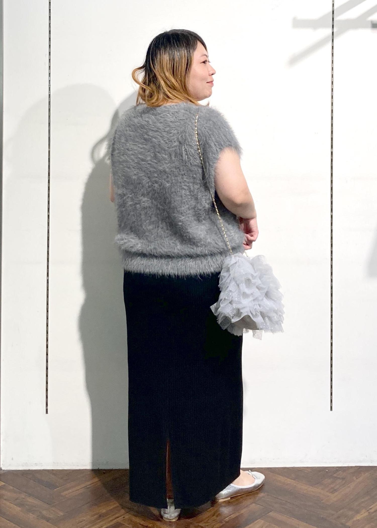 ふわふわな肌ざわりのフェザーニットベストのコーデです。