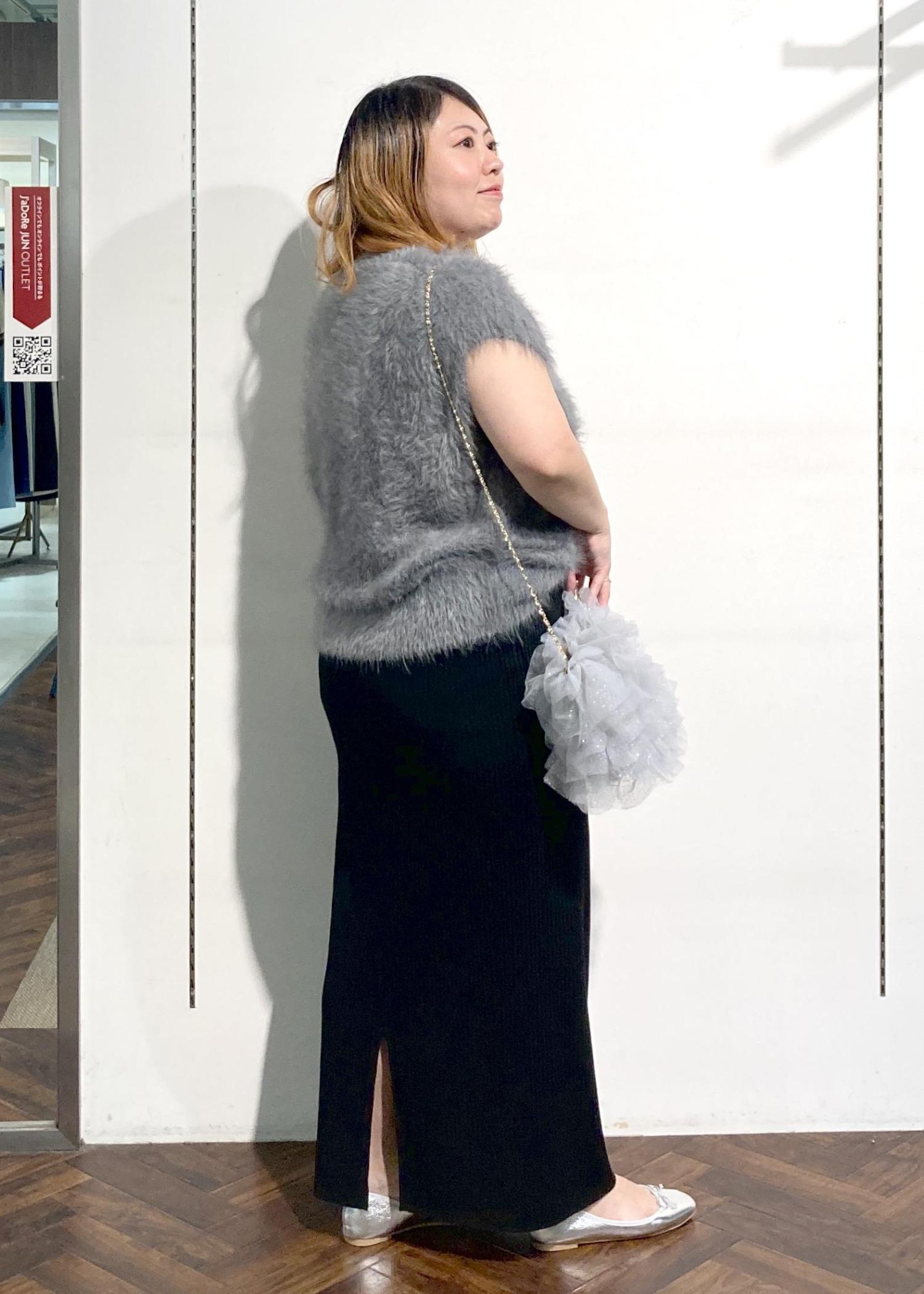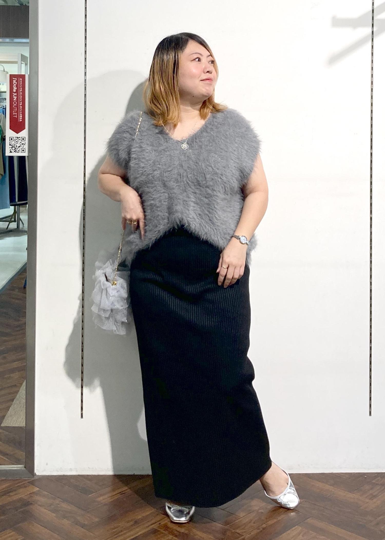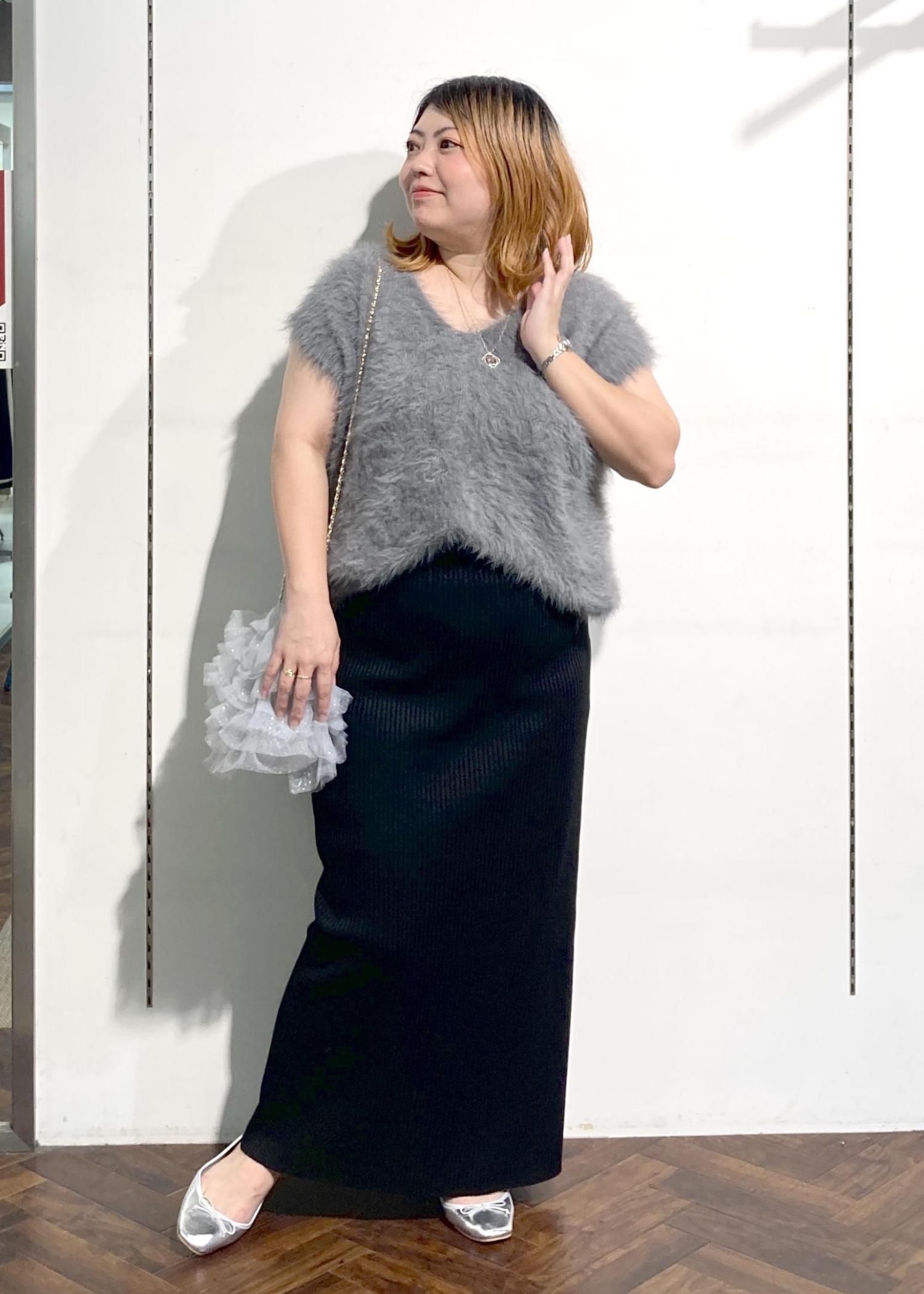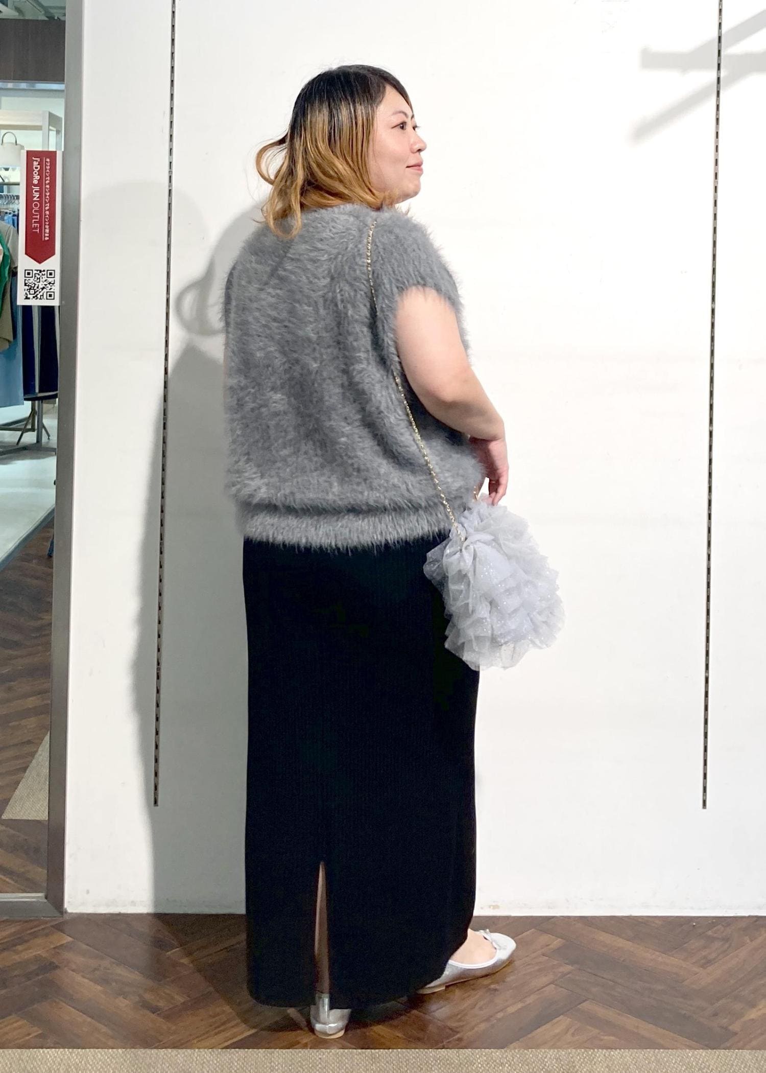 ふわふわな肌ざわりのフェザーニットベストのコーデです。