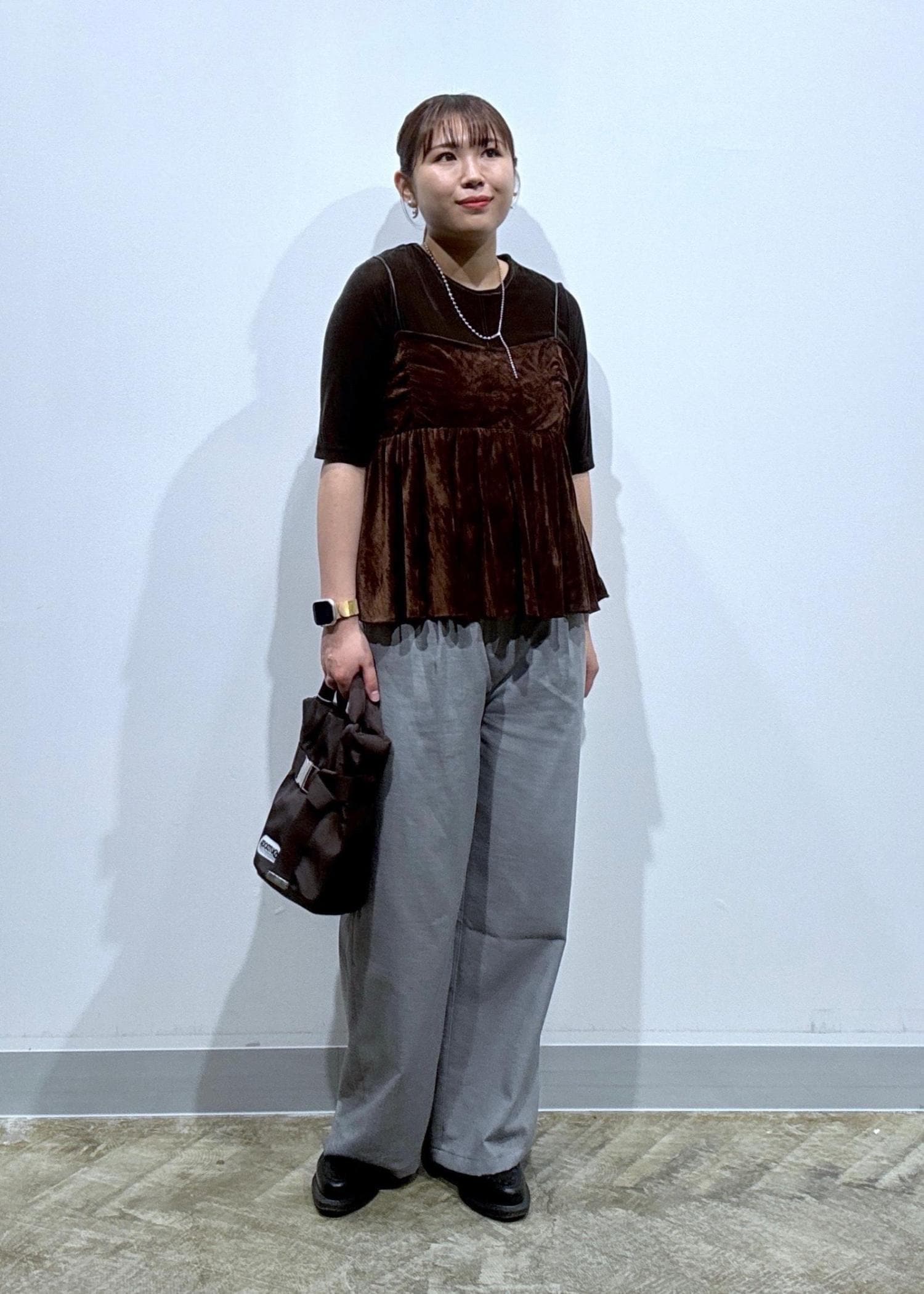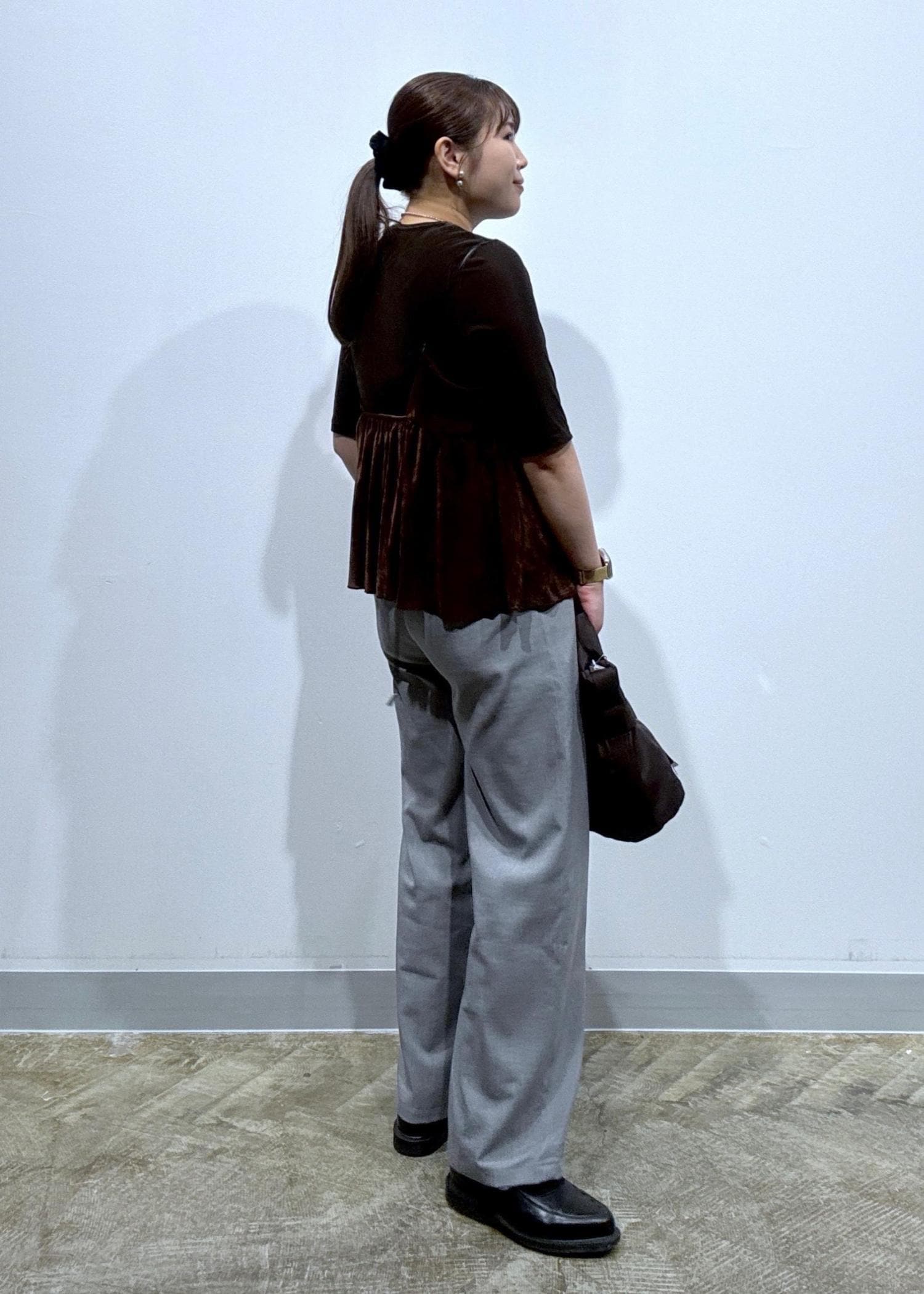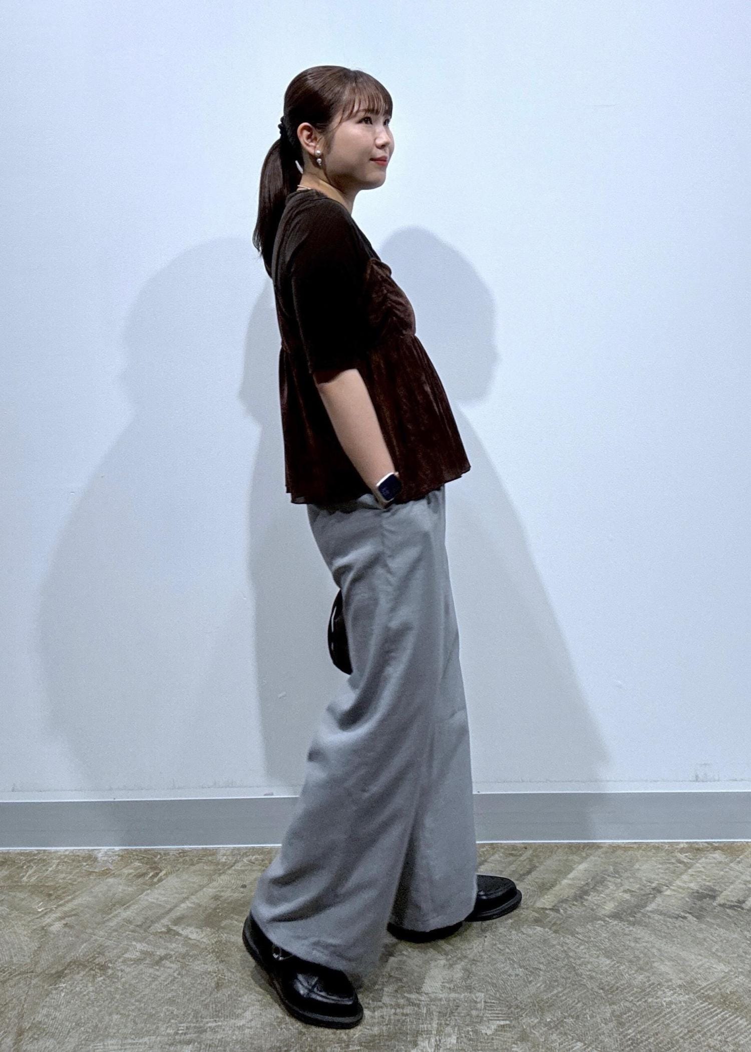落ち着いたグレーの綺麗みえパンツと合わせておとなっぽく!