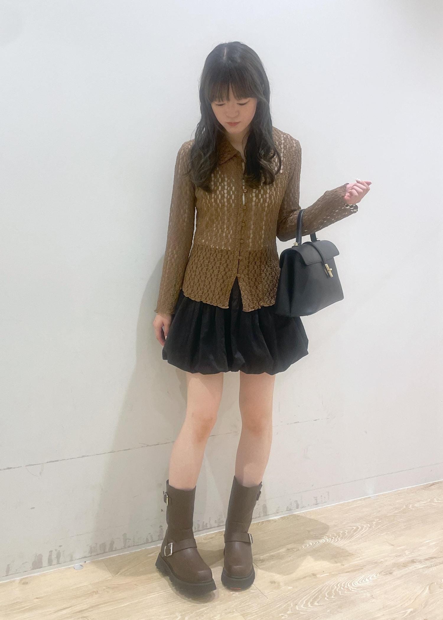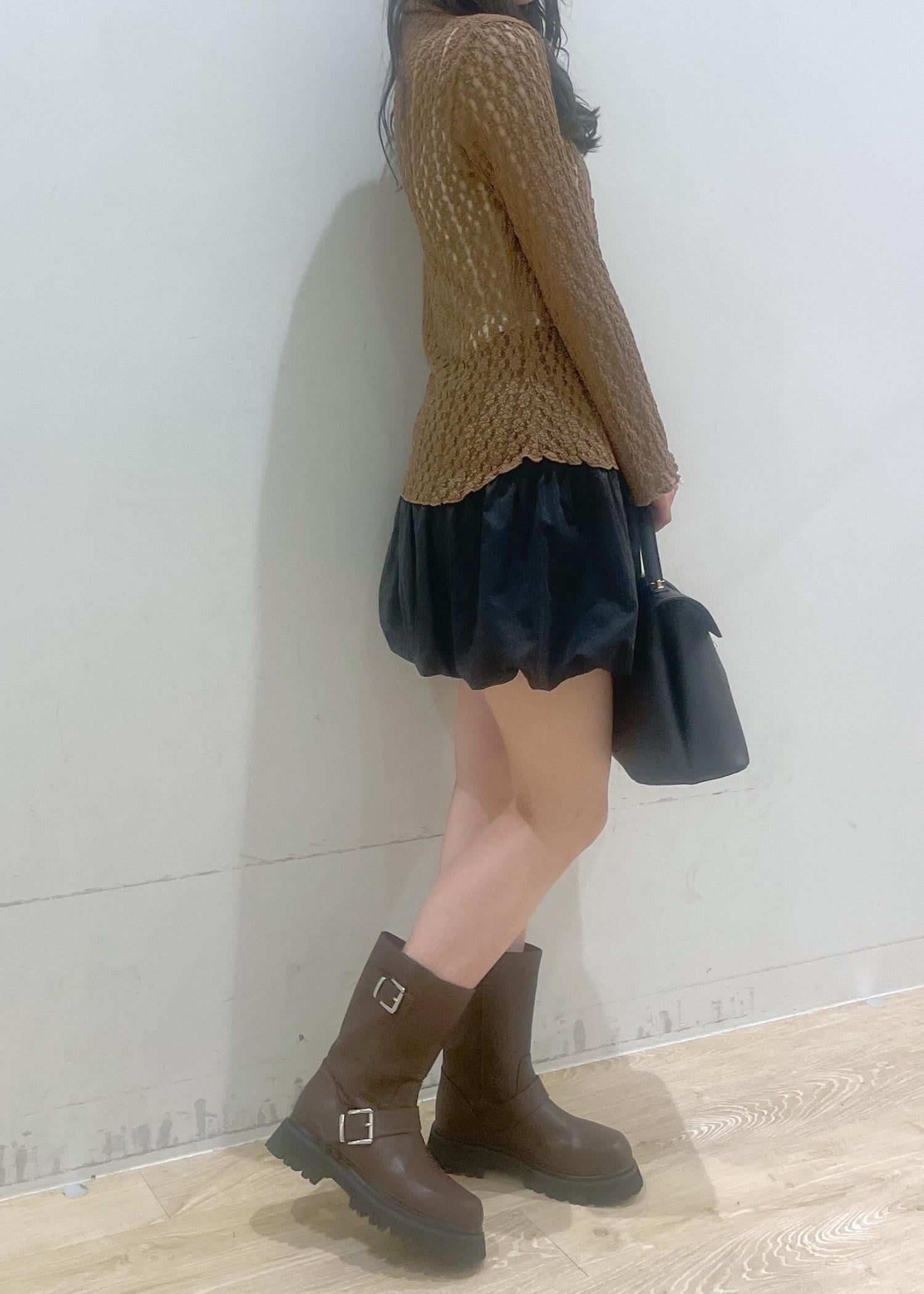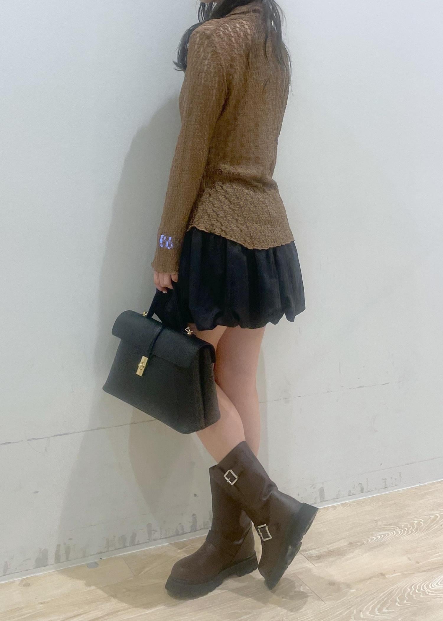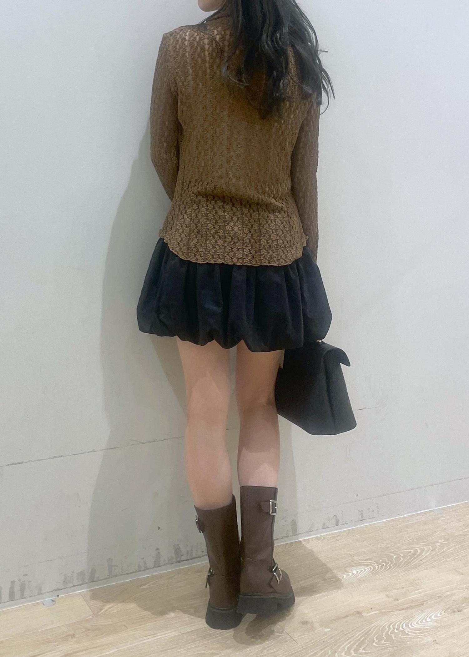 透け感のあるブラウンのカーディガンに、黒のバルーンスカートを合わせて大人かわいい雰囲気にしました♡ブラウンの厚底ブーツとバッグで引き締めて、秋らしいコーデに!