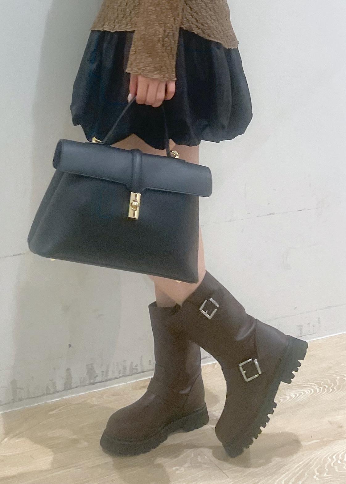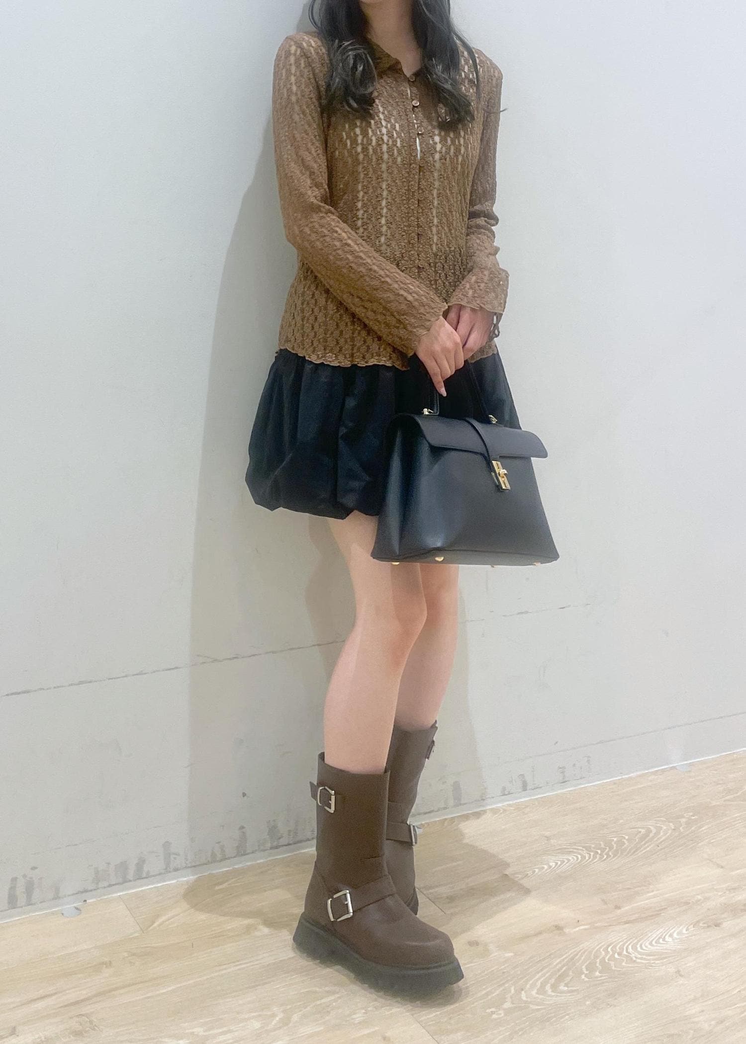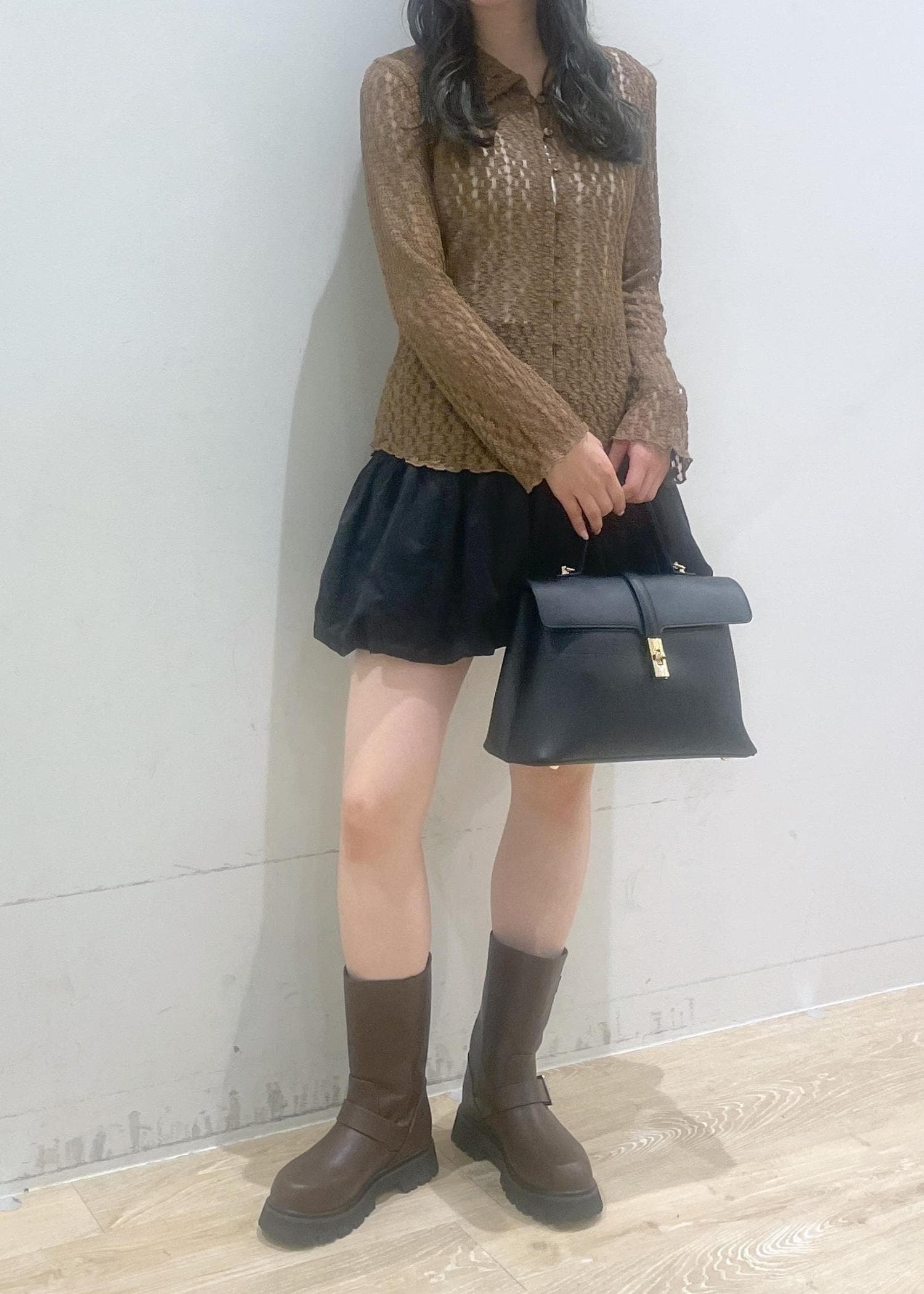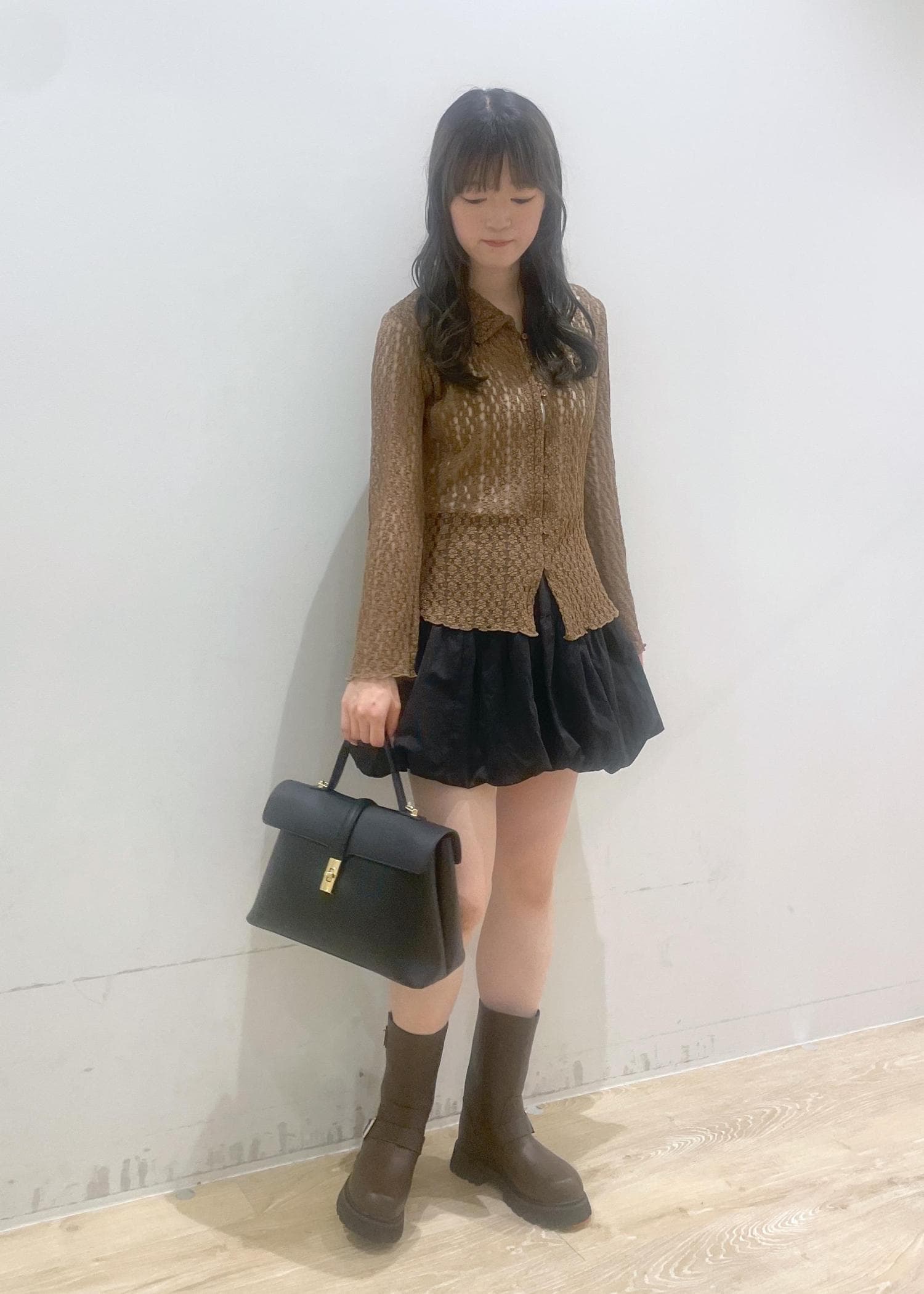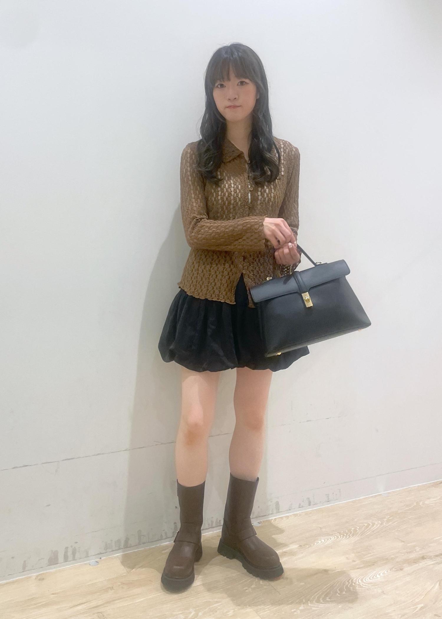 透け感のあるブラウンのカーディガンに、黒のバルーンスカートを合わせて大人かわいい雰囲気にしました♡ブラウンの厚底ブーツとバッグで引き締めて、秋らしいコーデに!