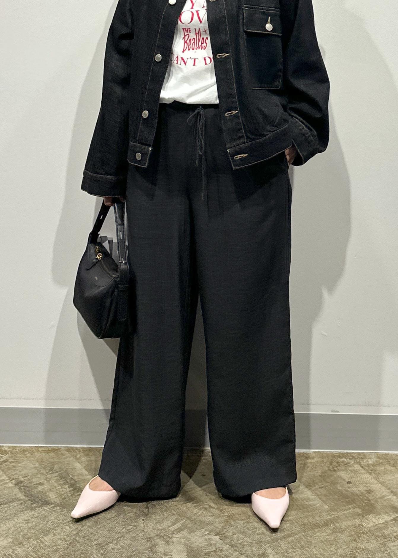 さらっした素材感で、ストレートに落ちてくれるシルエットがヒップラインなお腹周りも気にせず履けるどのスタイリングにも合わせやすい万能パンツです。