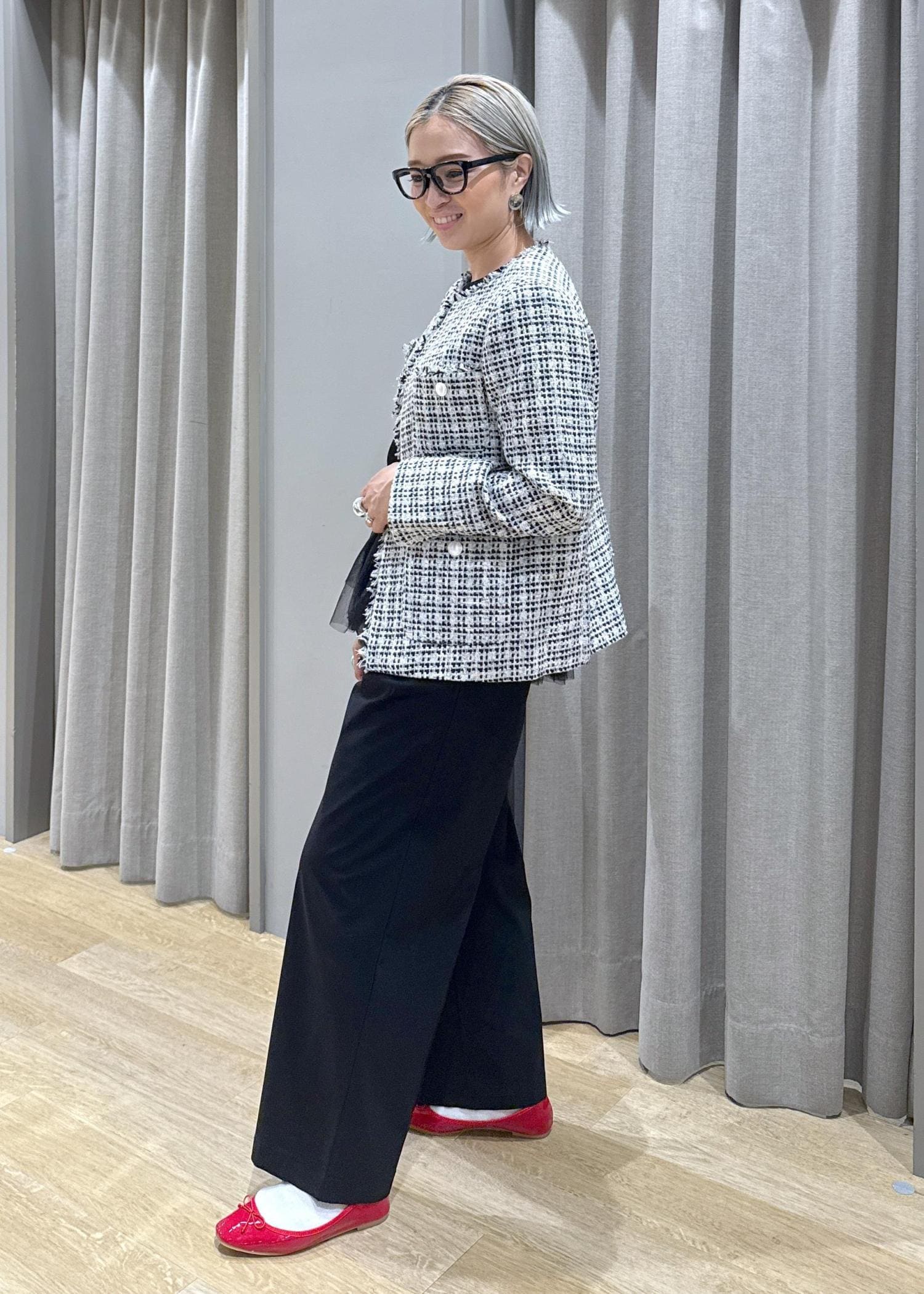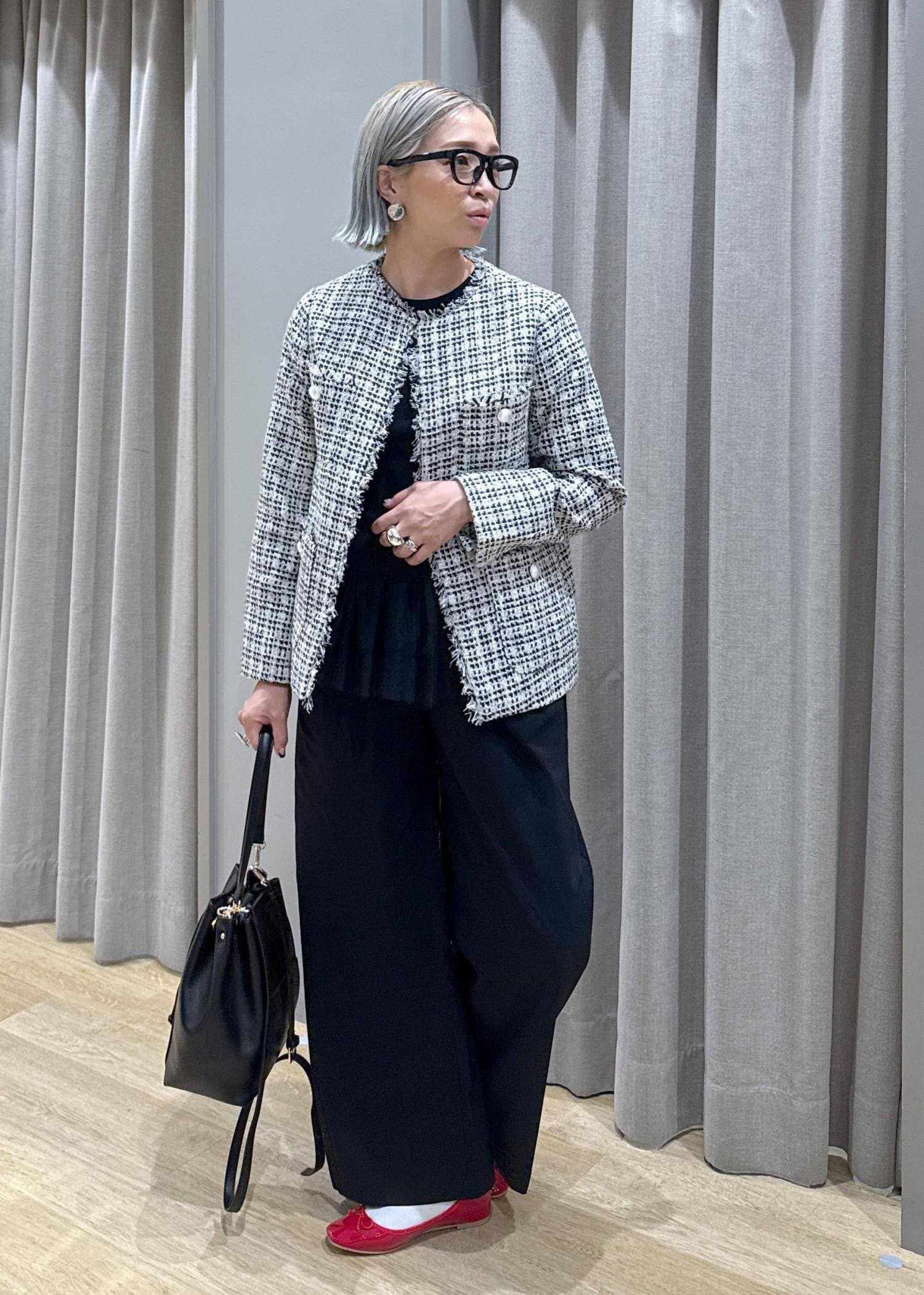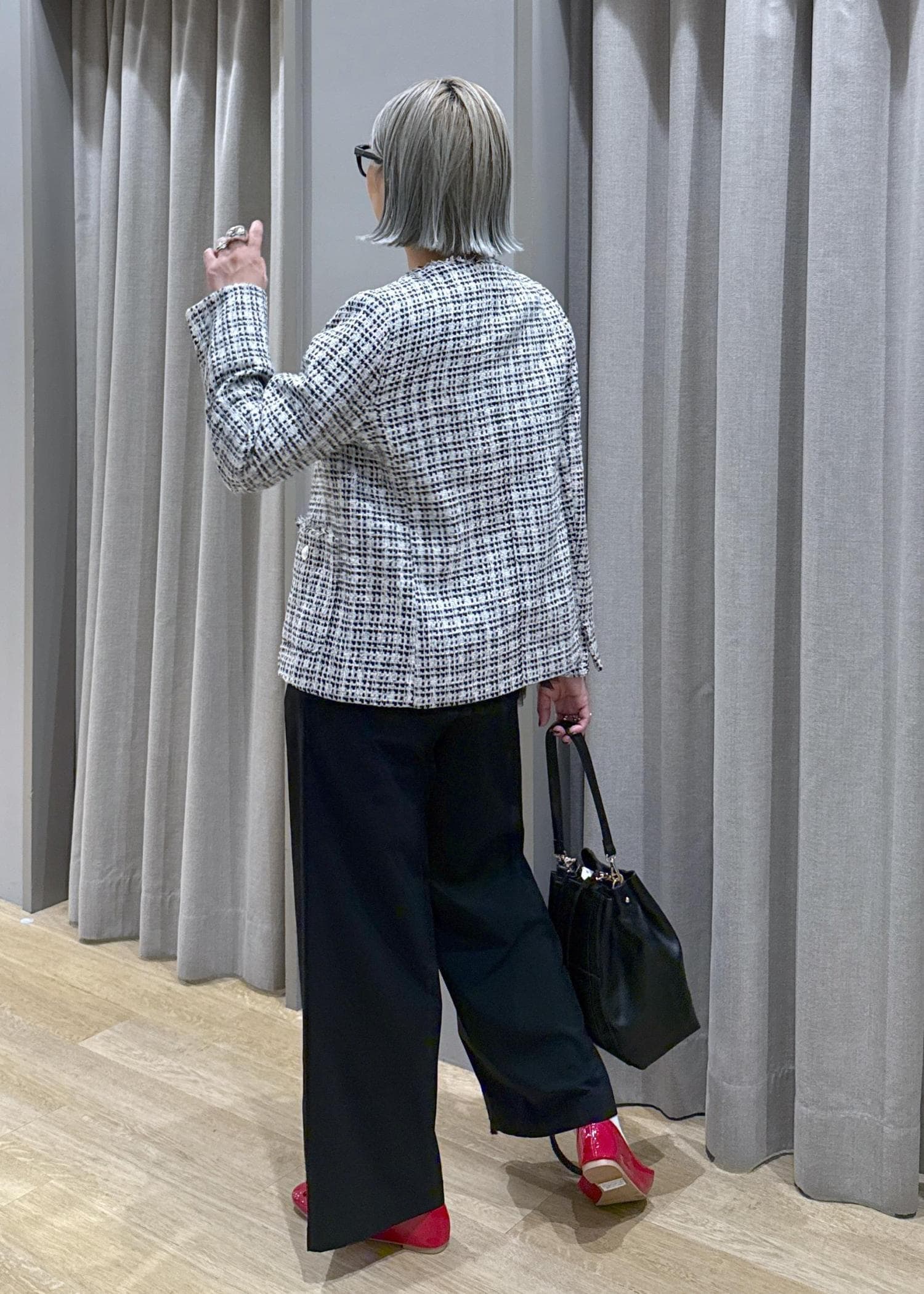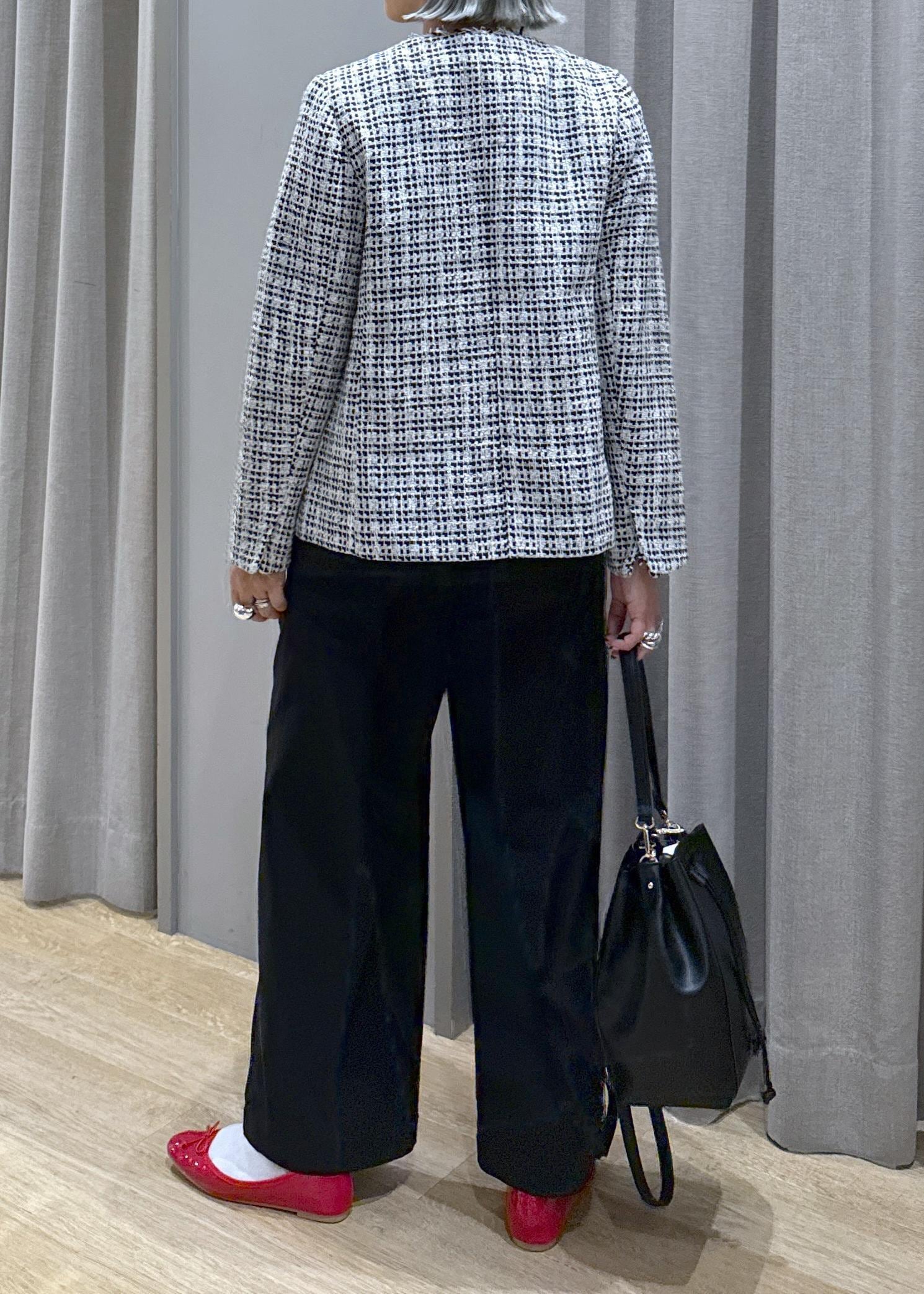 羽織ってもしっかり丈感があるツイードジャケットとの