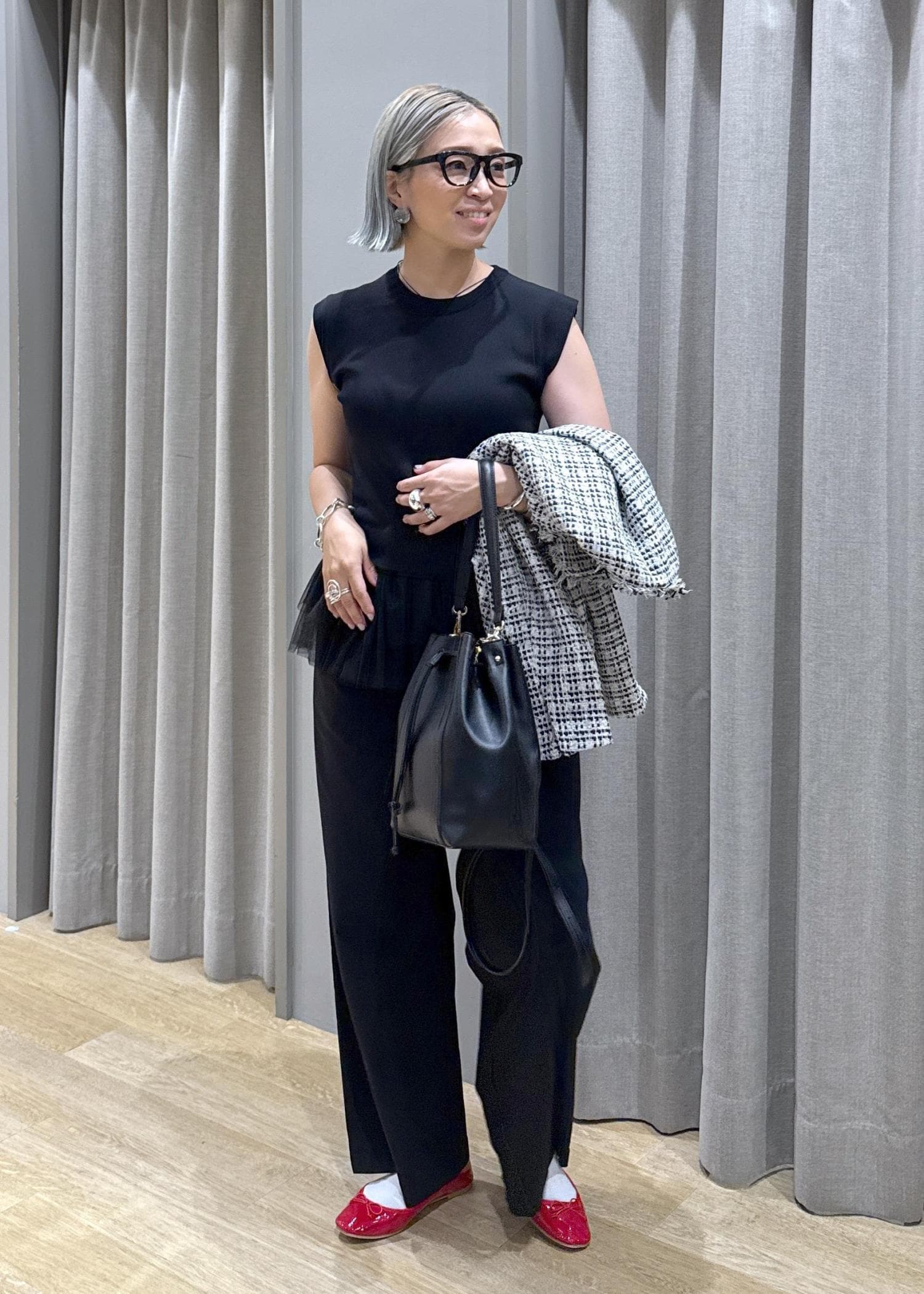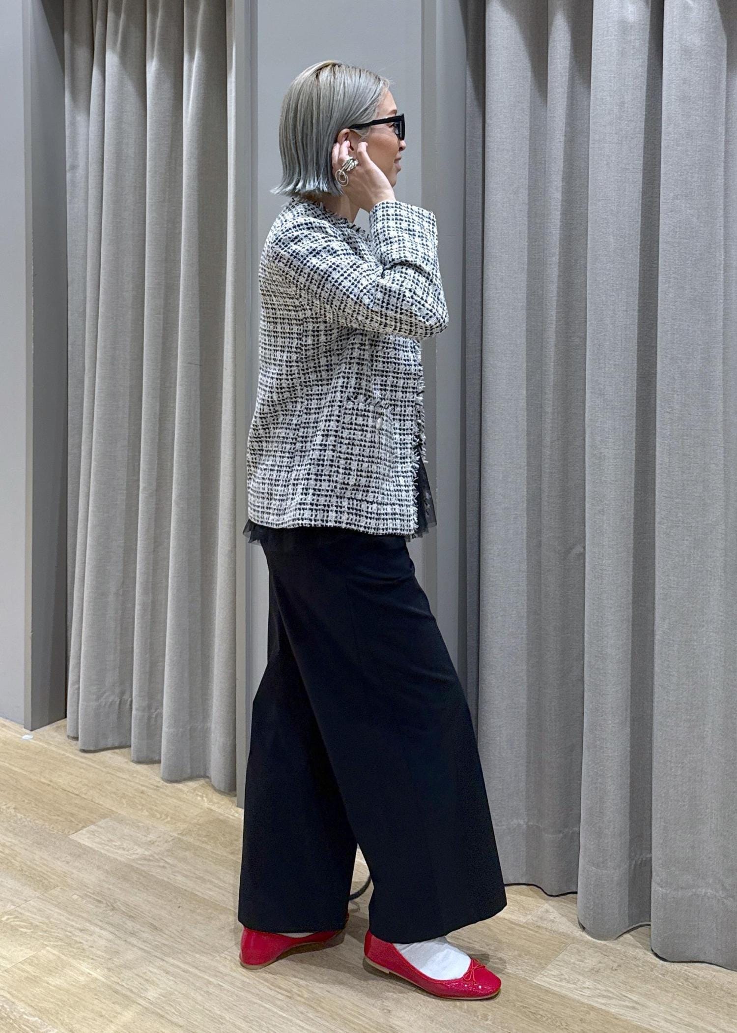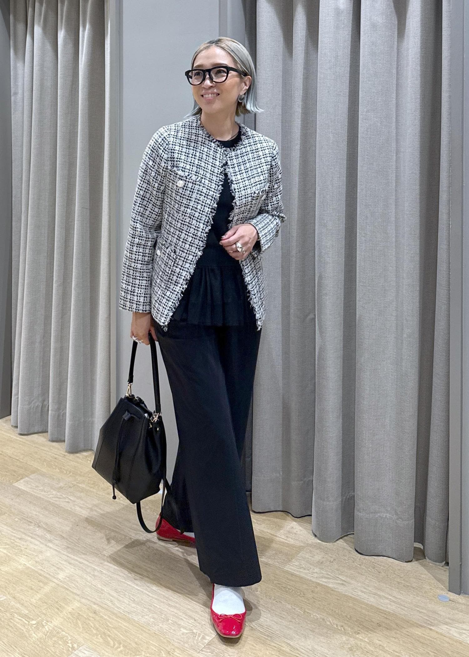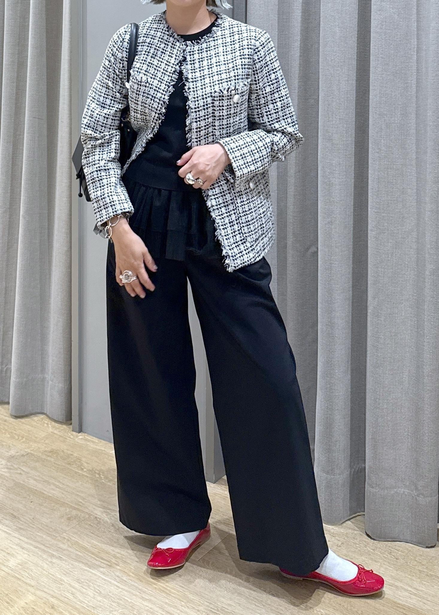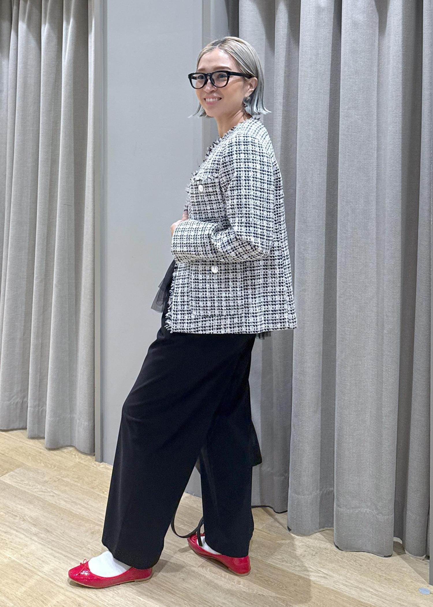 羽織ってもしっかり丈感があるツイードジャケットとの