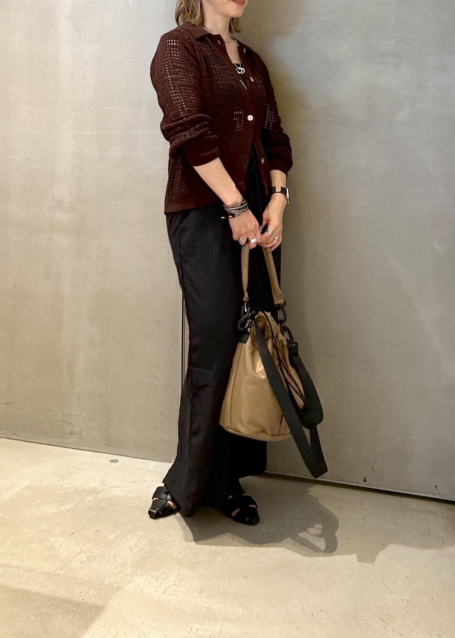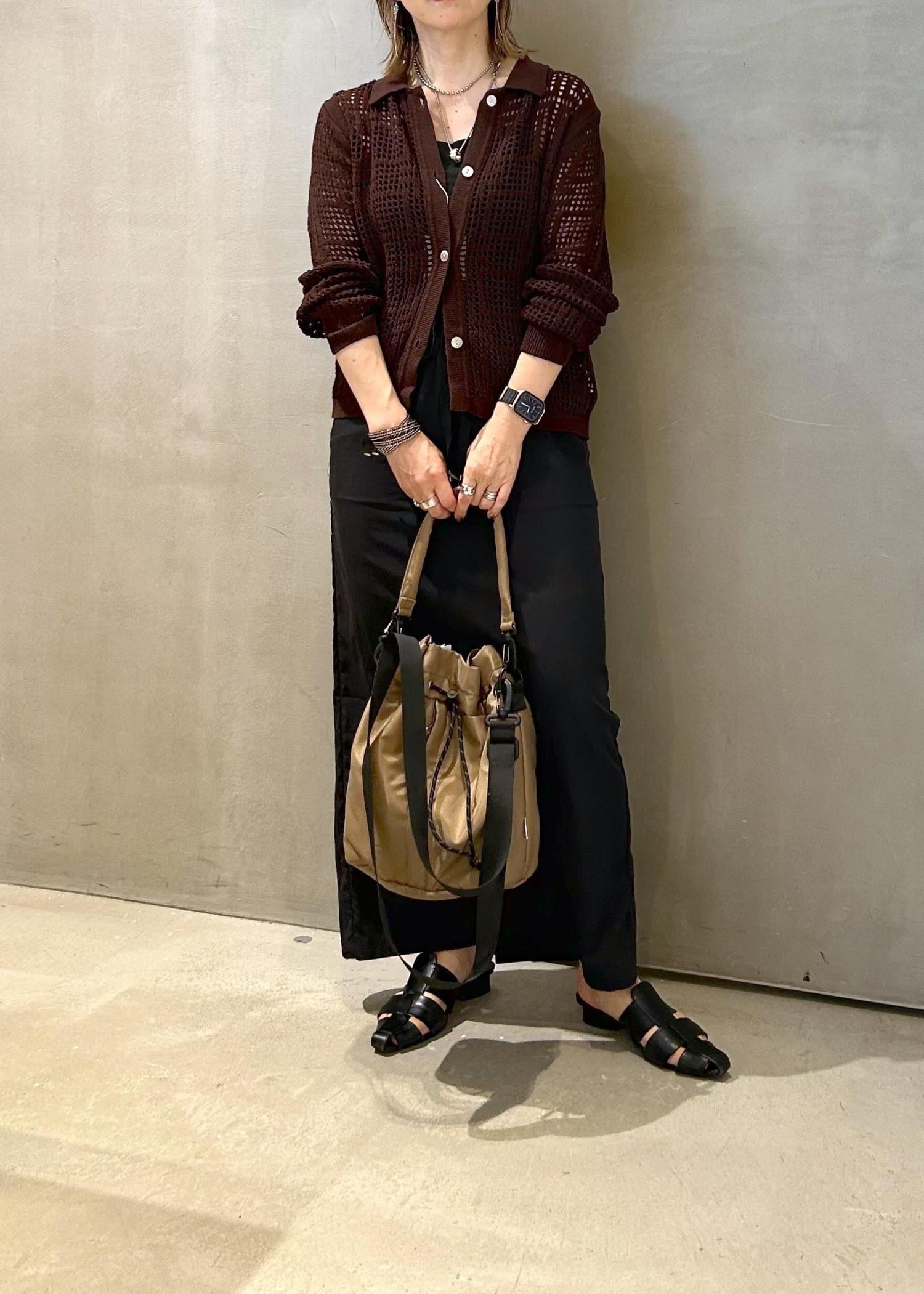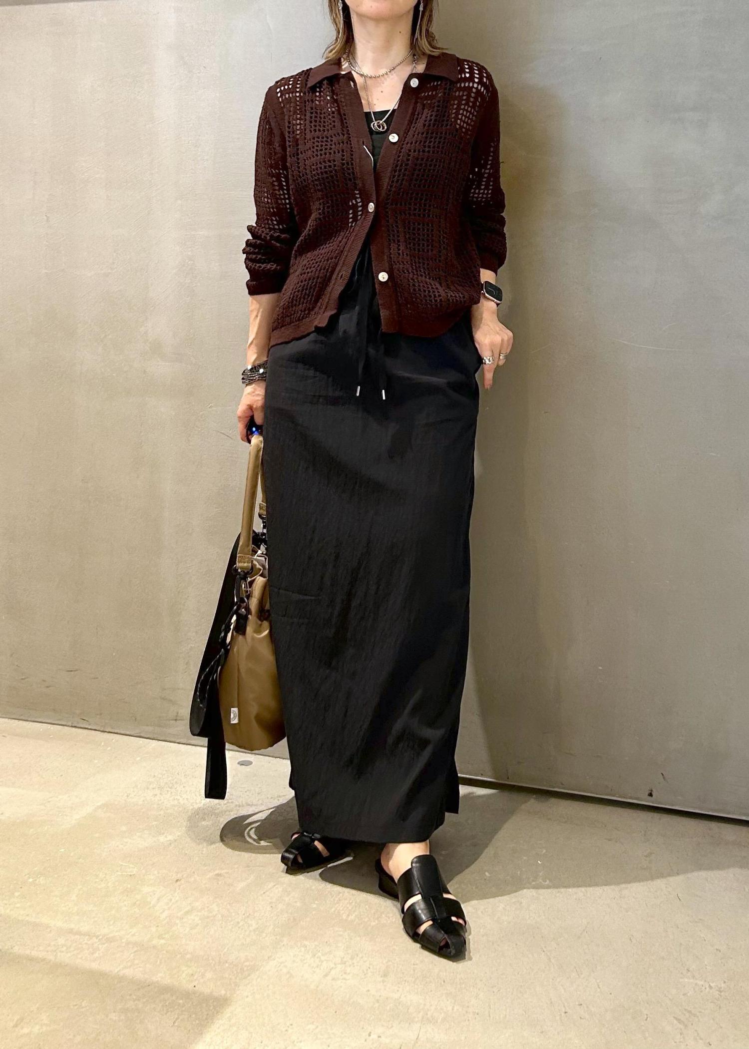 オータムカラーのカーディガンで、秋を意識したコーディネートのご提案です。