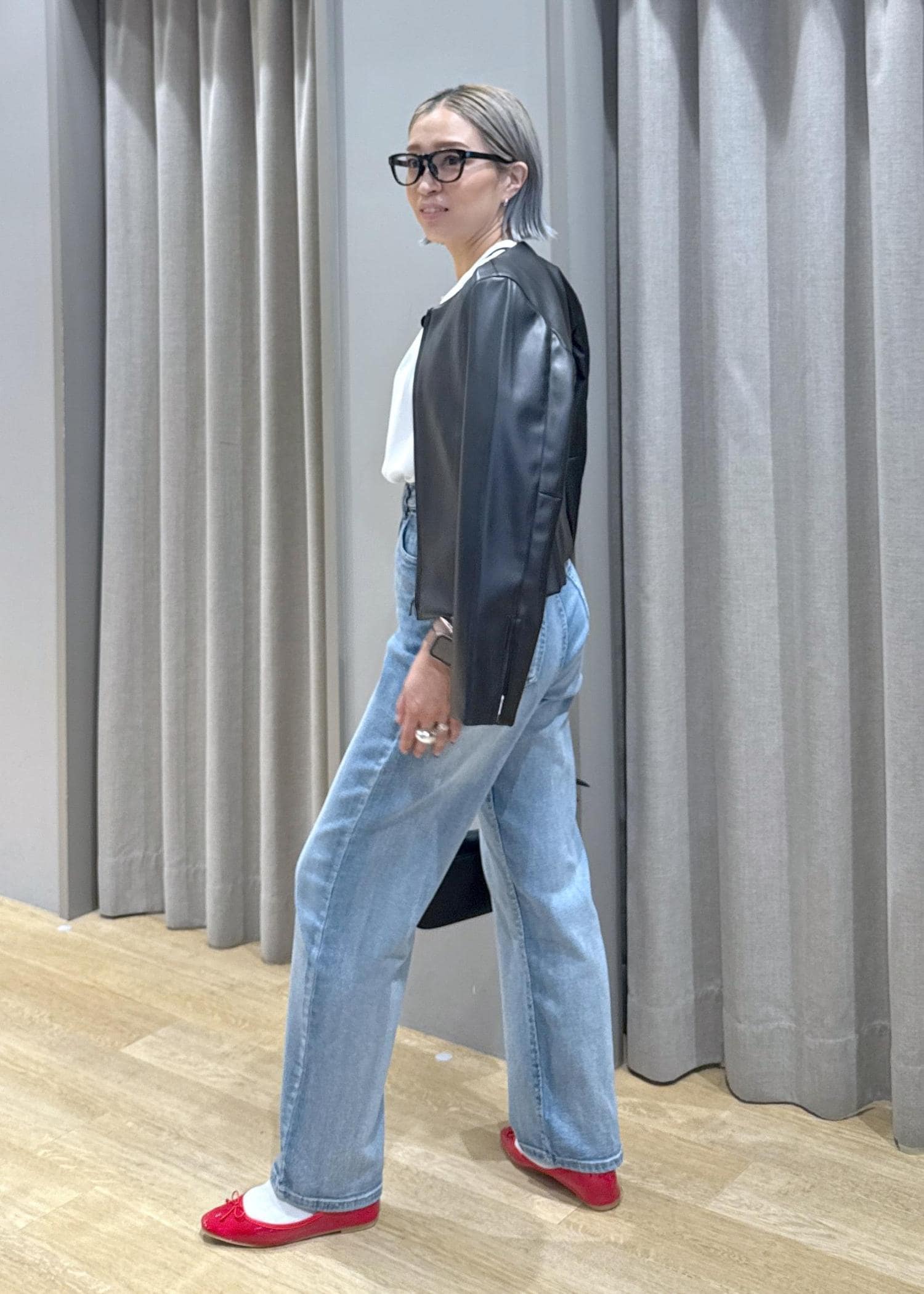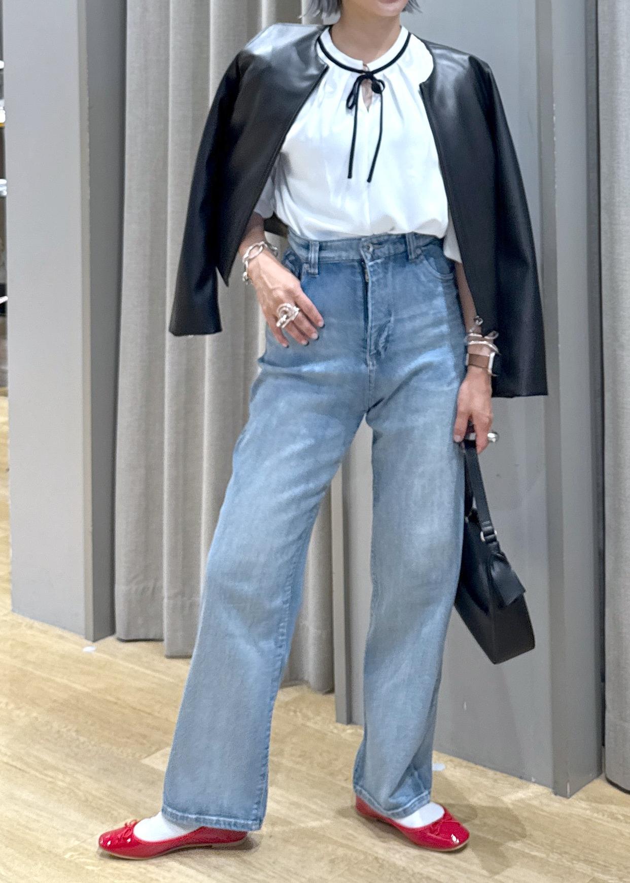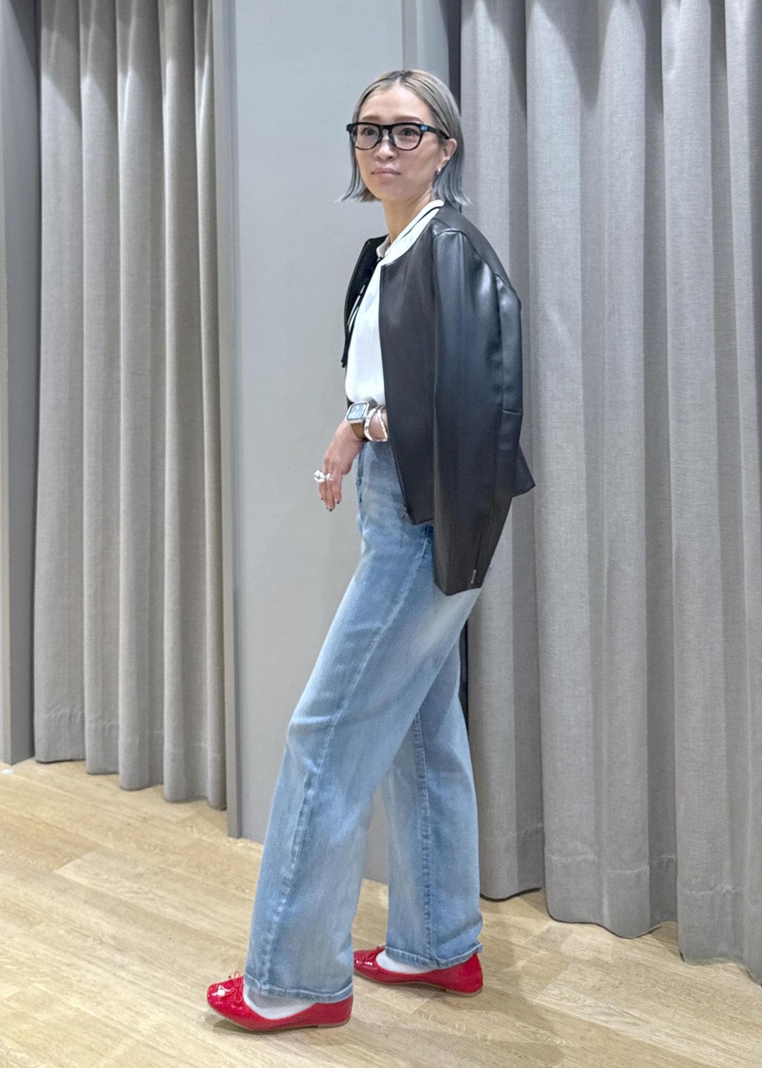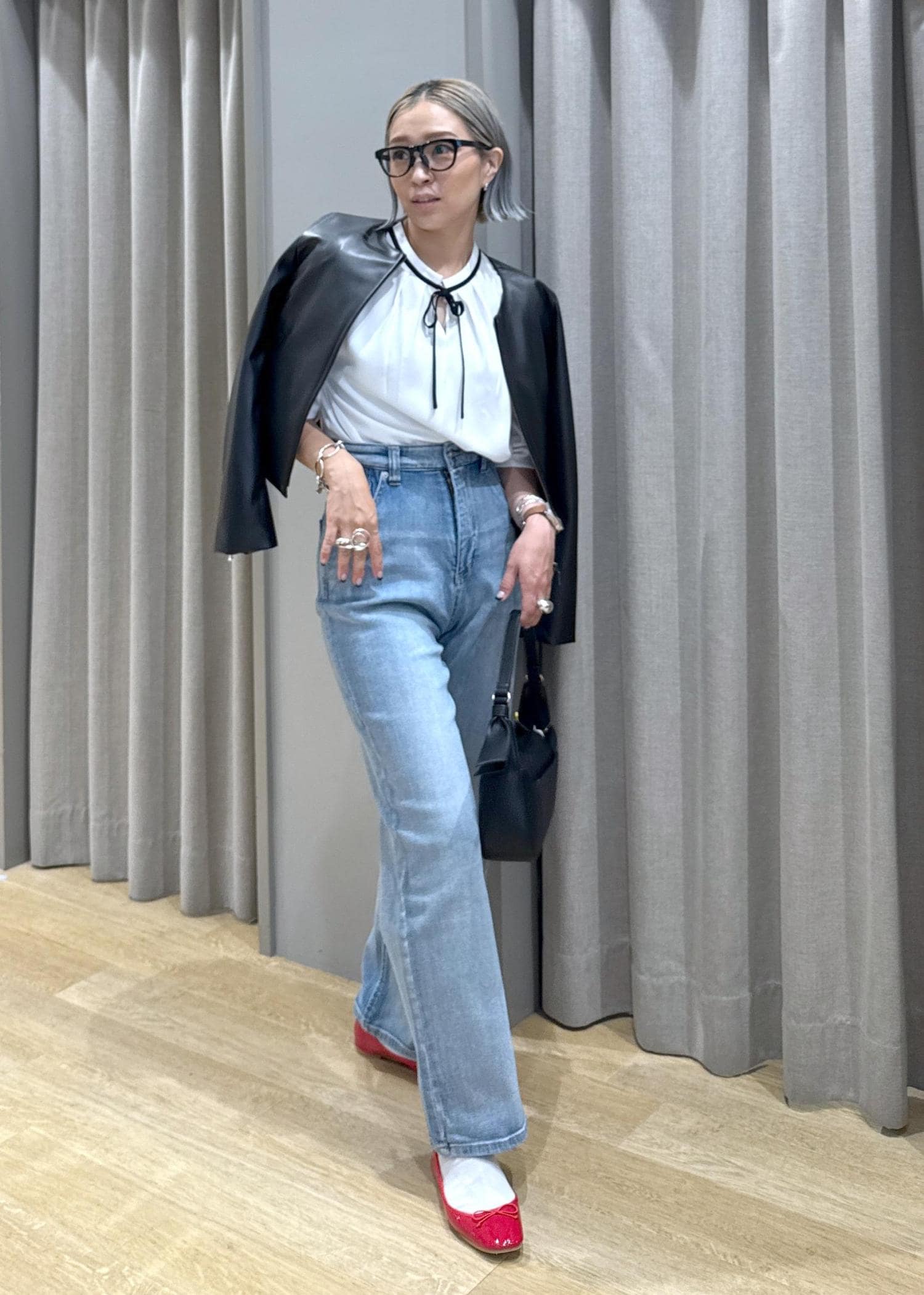 甘くなりすぎないように羽織りはクールなレザーブルゾンにしました♪