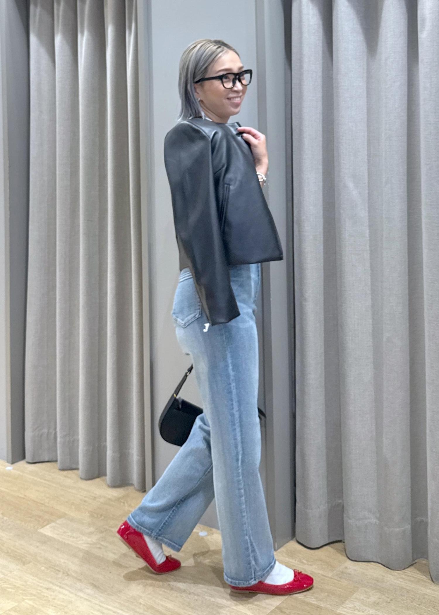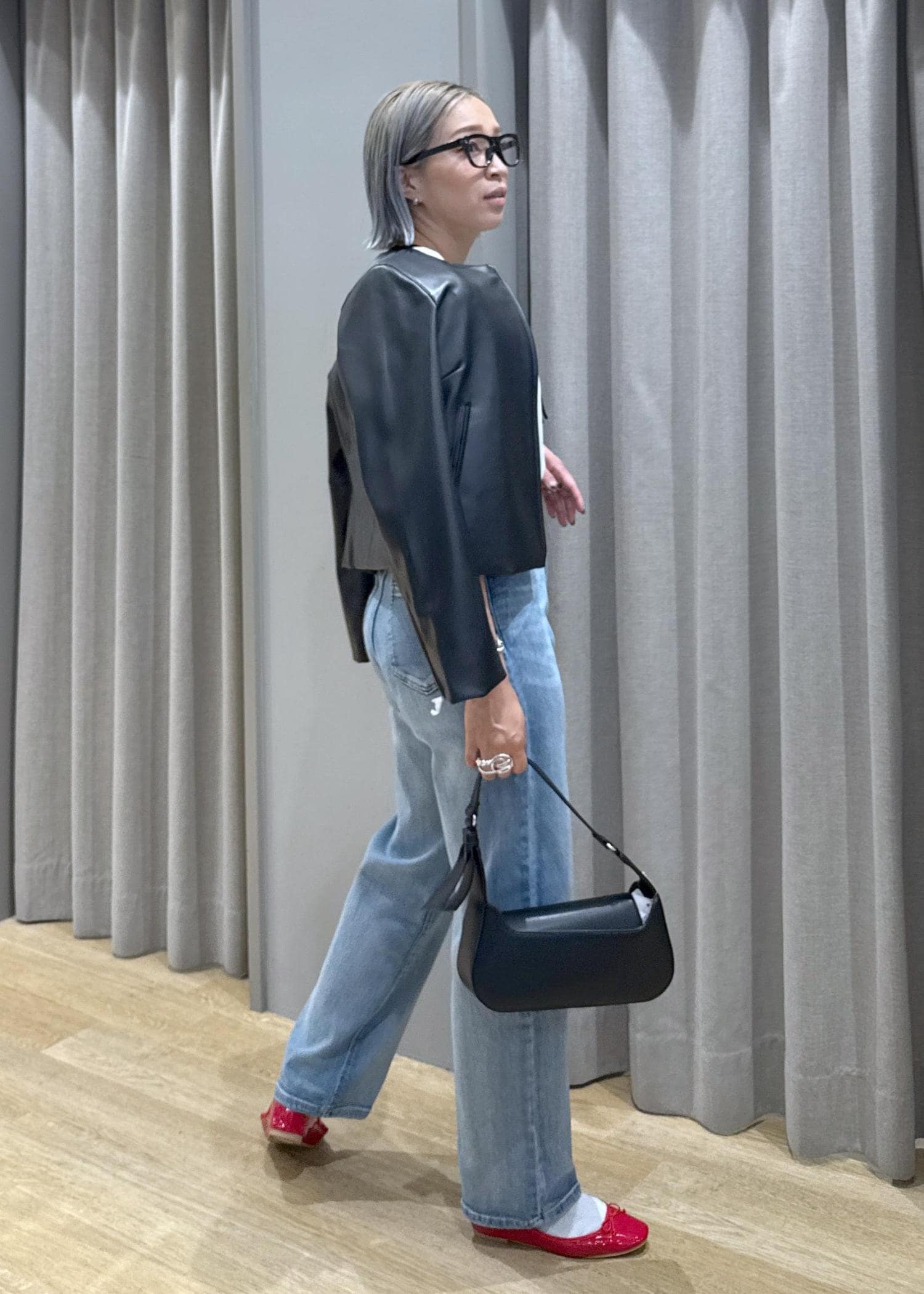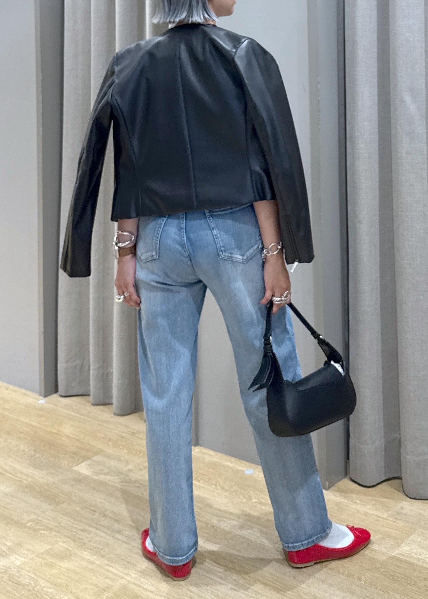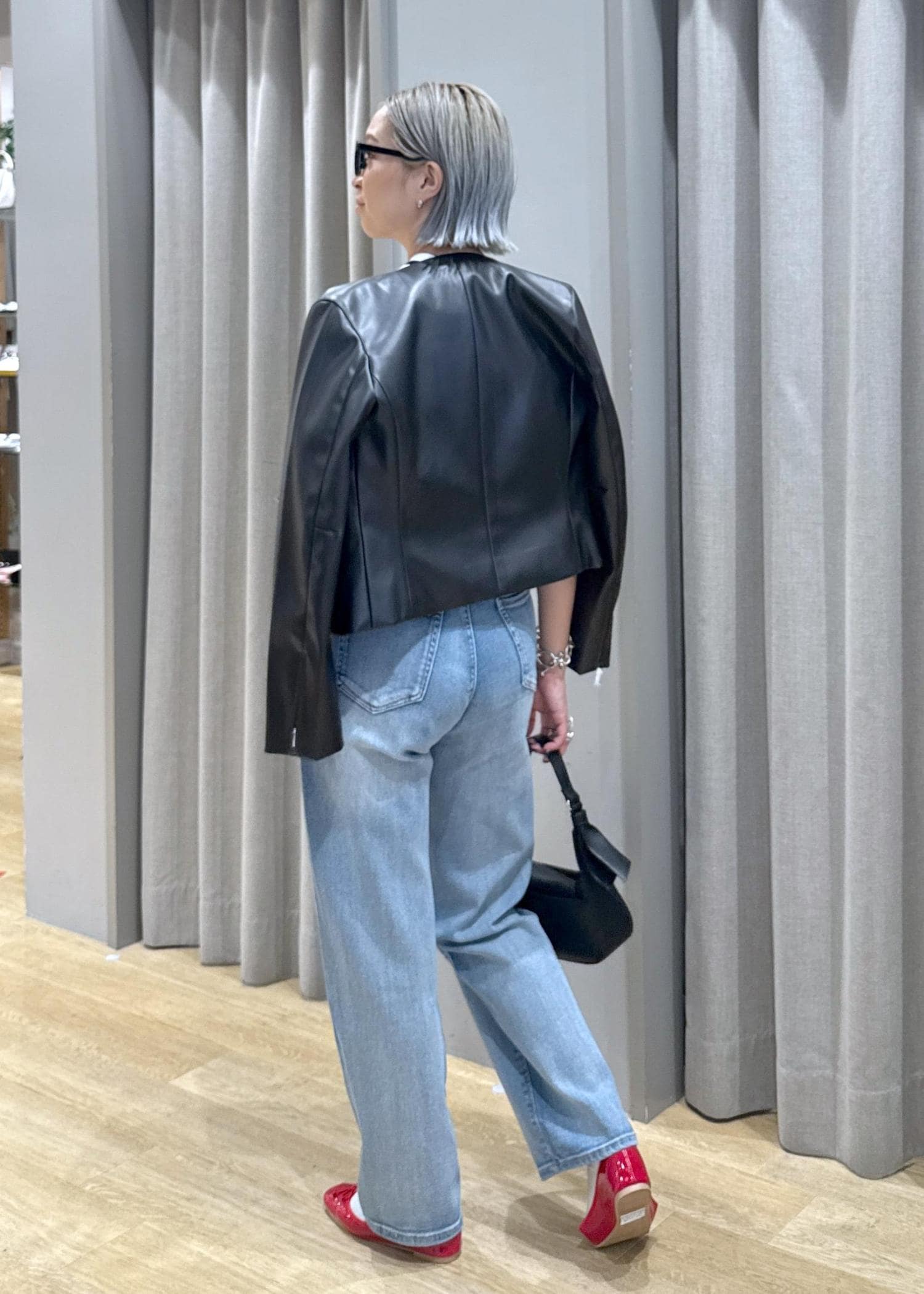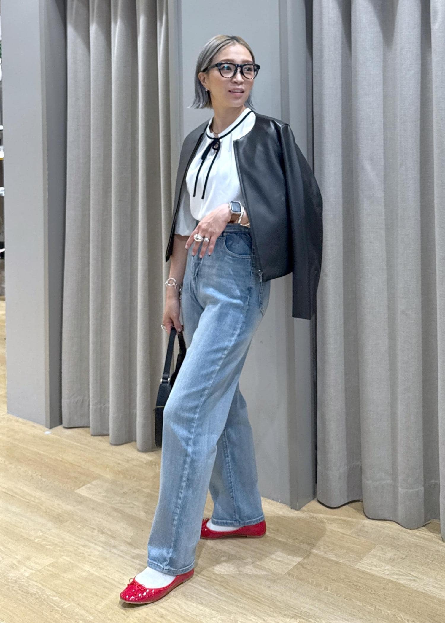 甘くなりすぎないように羽織りはクールなレザーブルゾンにしました♪