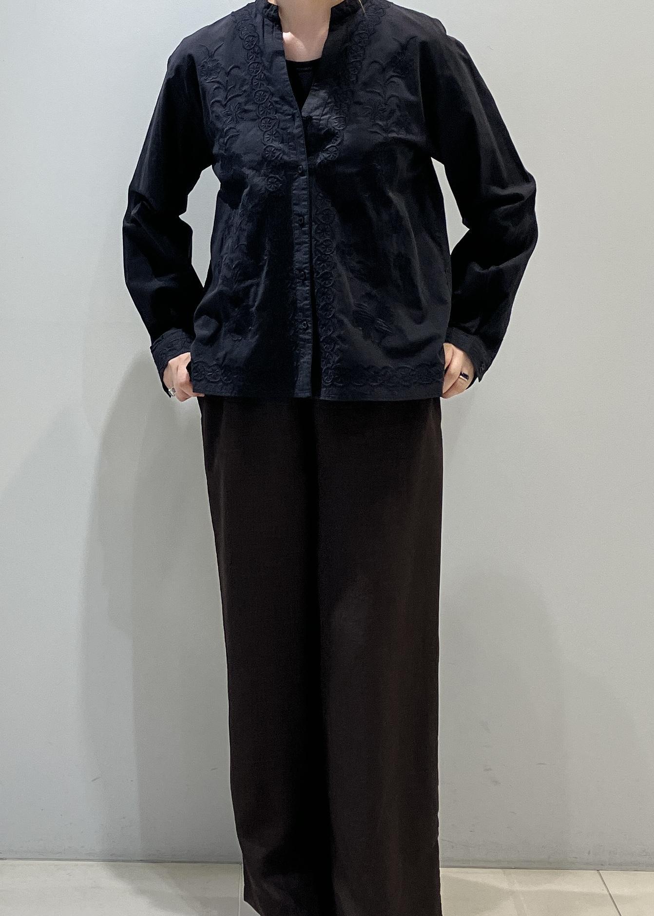 同色の花柄の刺繍があしらわれた格好良いブラウスと