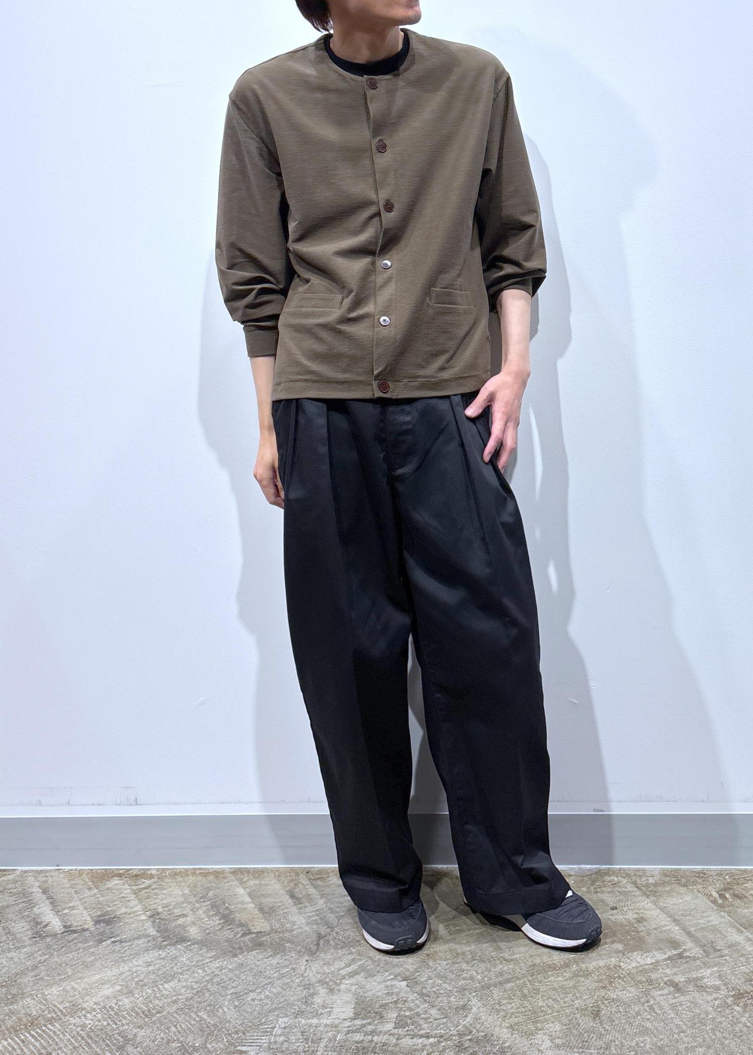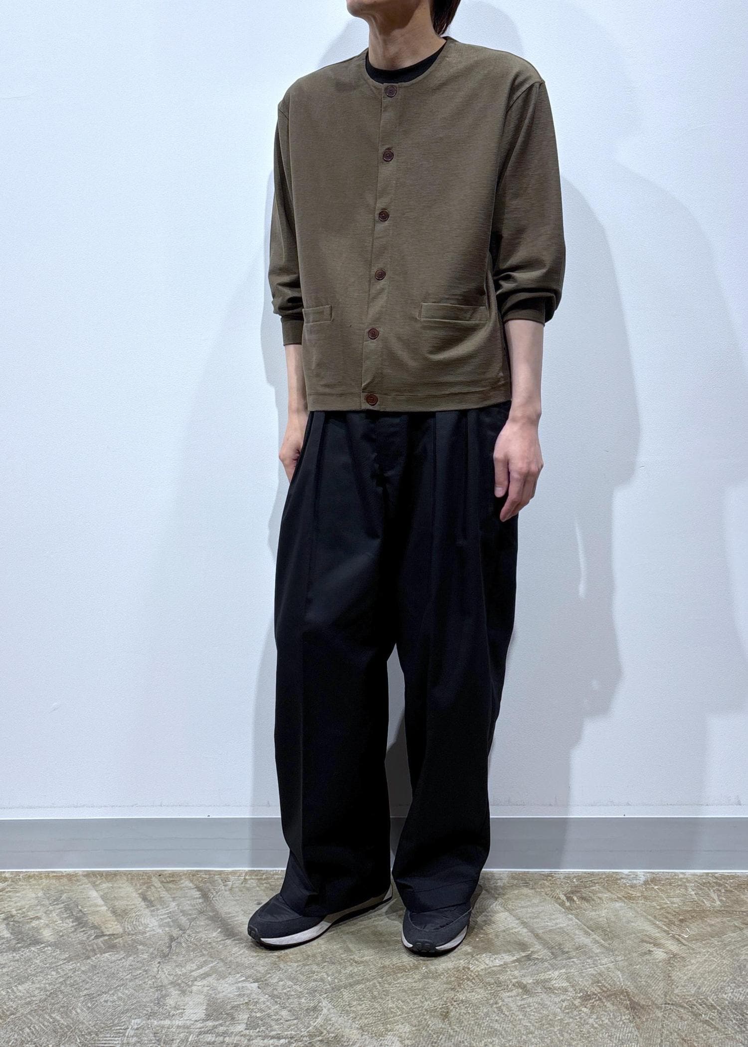 トップスは襟なしのカーディガンに、ゆったり目のボトムスを合わせました。