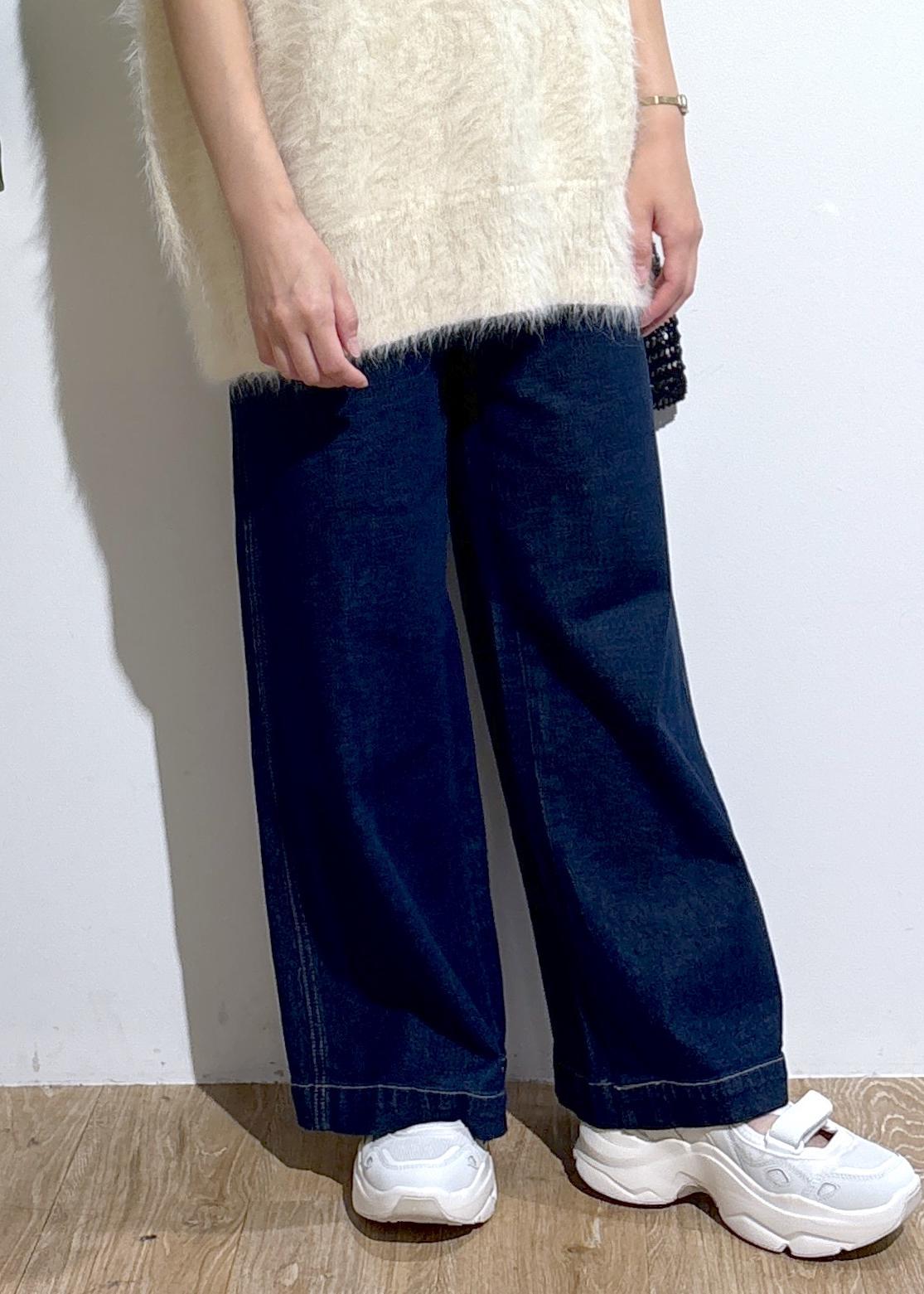 着丈が長めなのでワイドパンツや、やや広がりのあるスカートを合わせると今っぽくおしゃれに決まります。