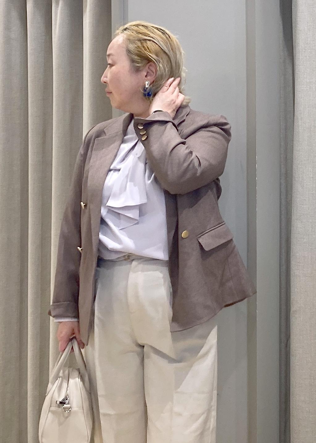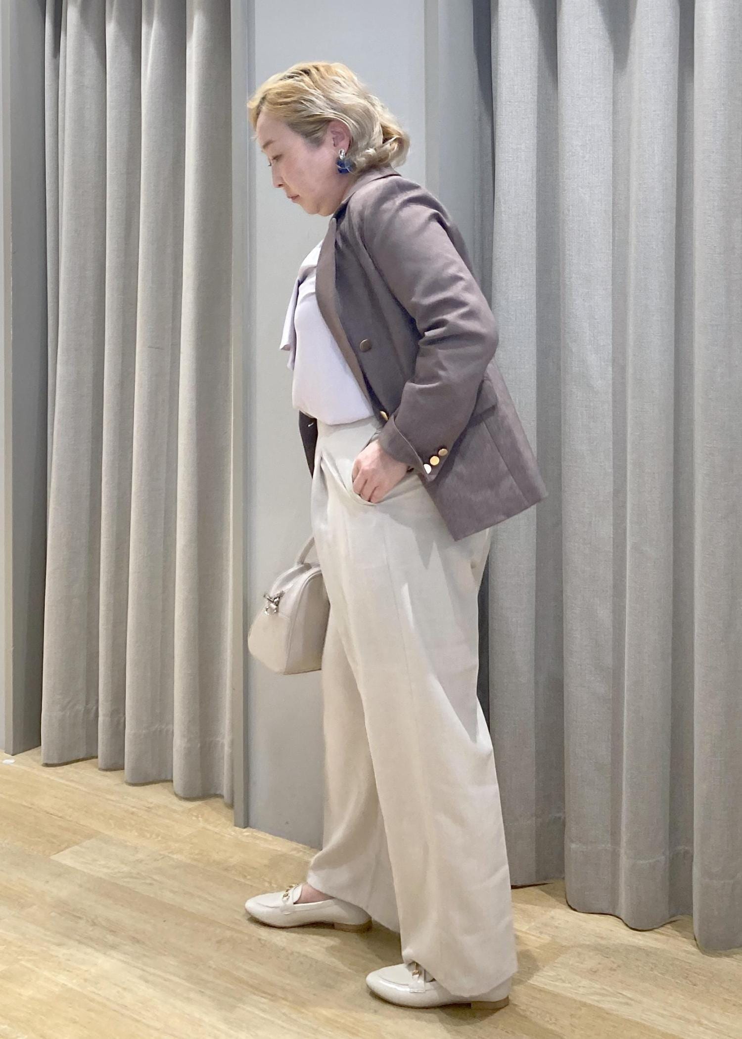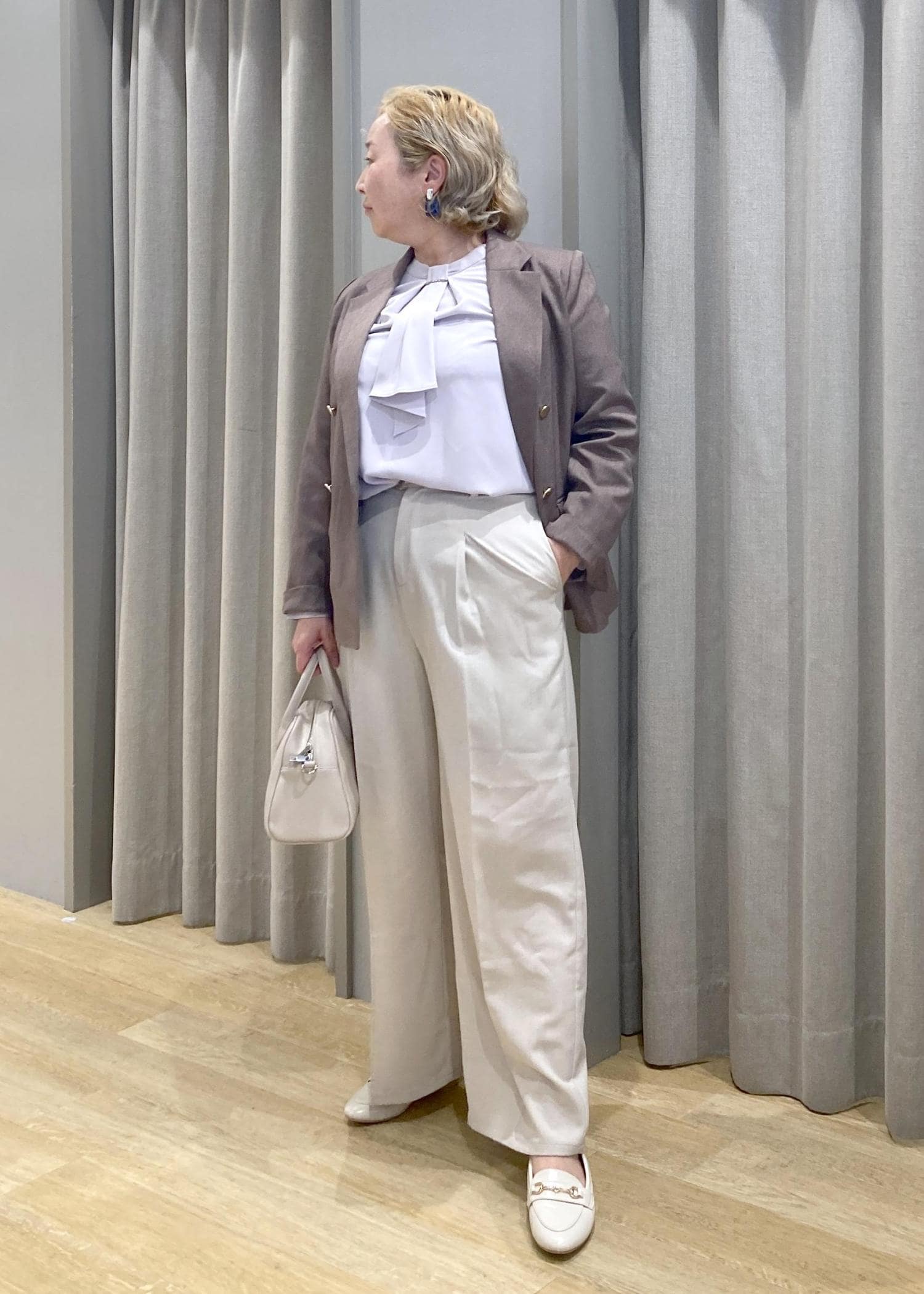 柔らかカラーで、大人のオフィスカジュアルコーデ