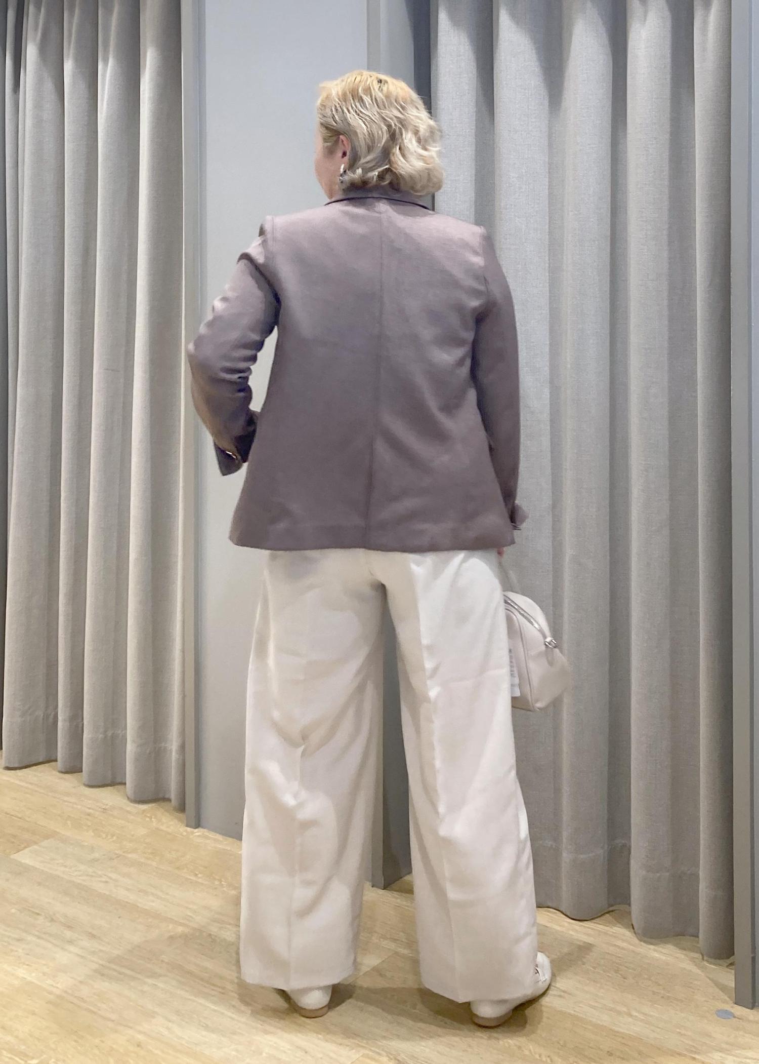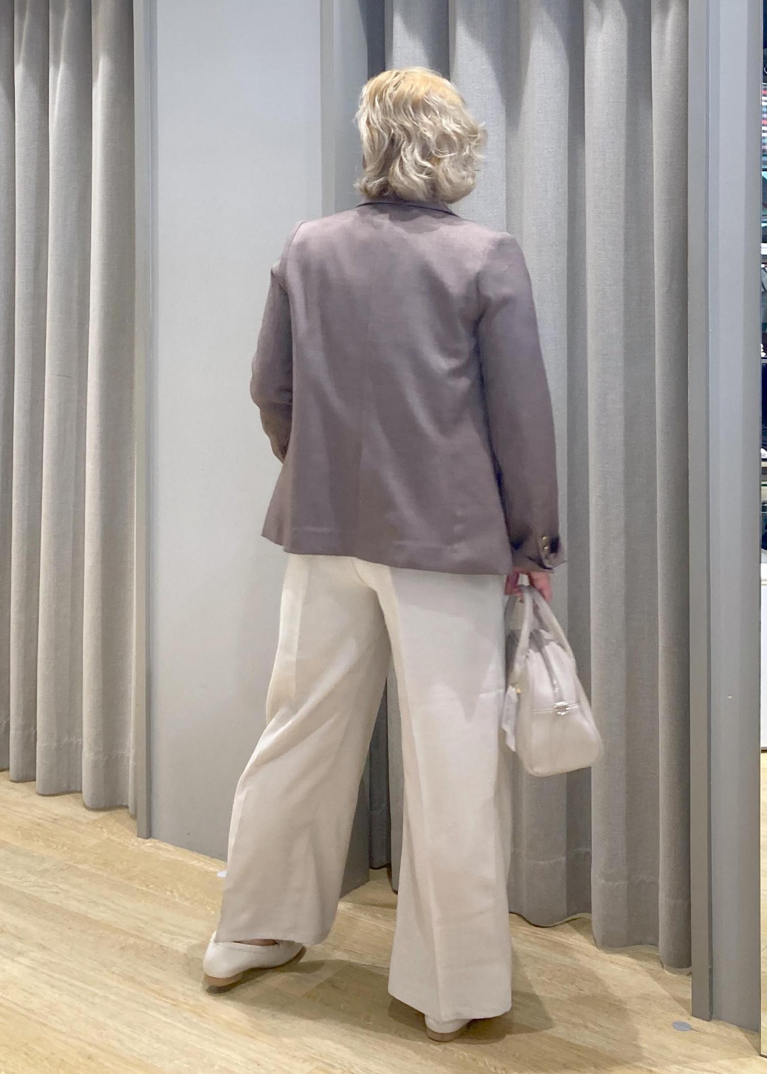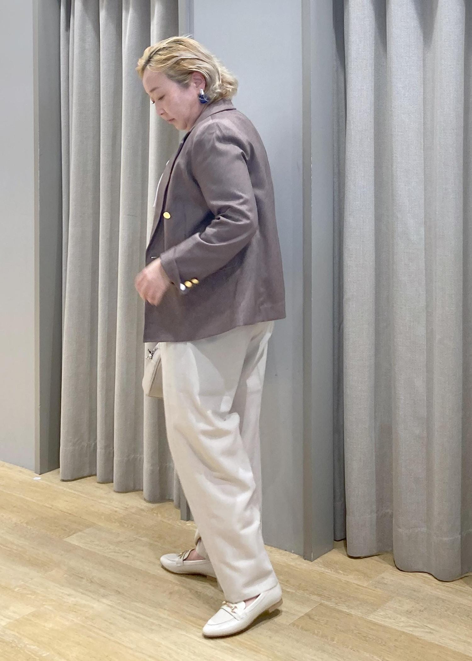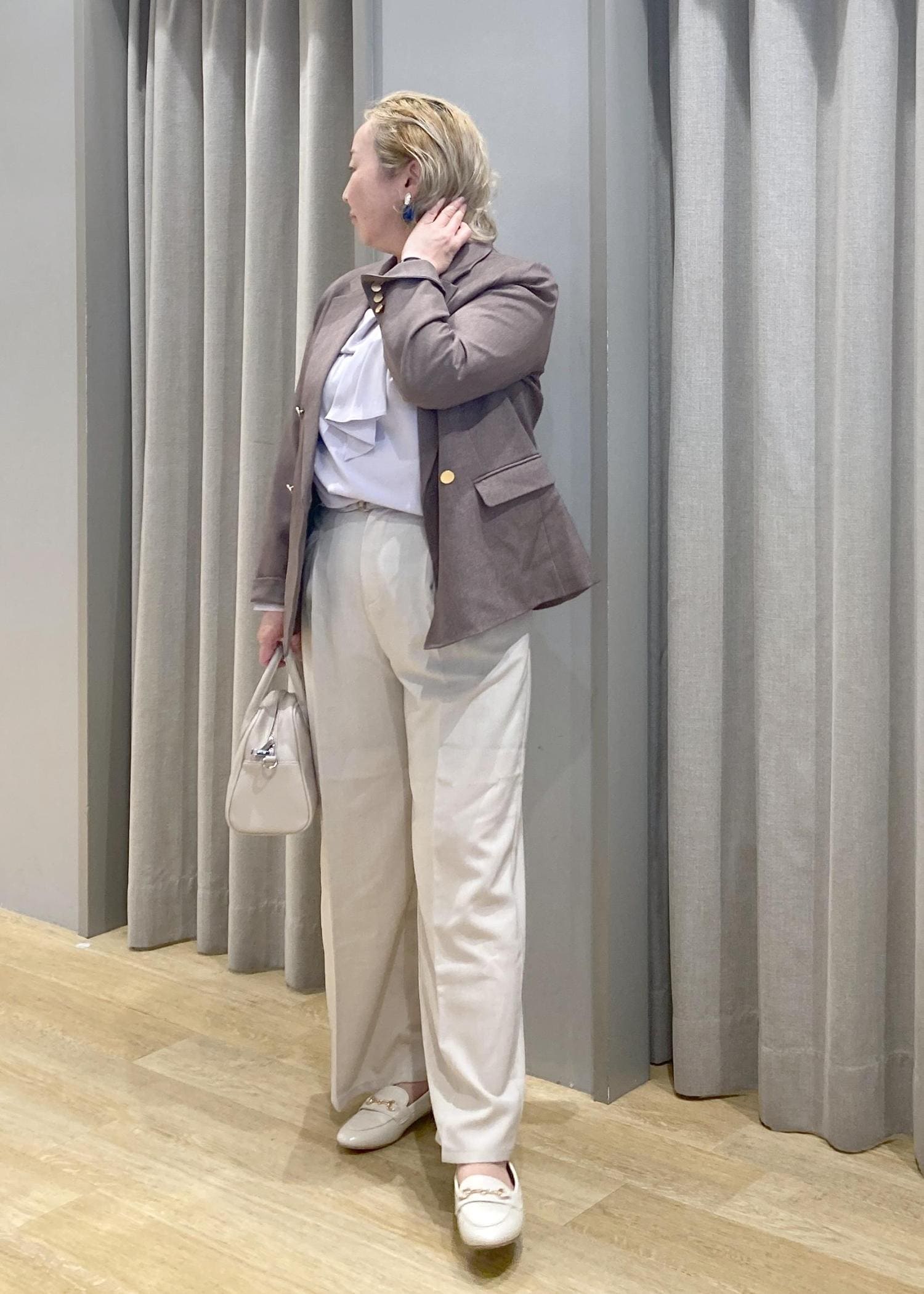 柔らかカラーで、大人のオフィスカジュアルコーデ