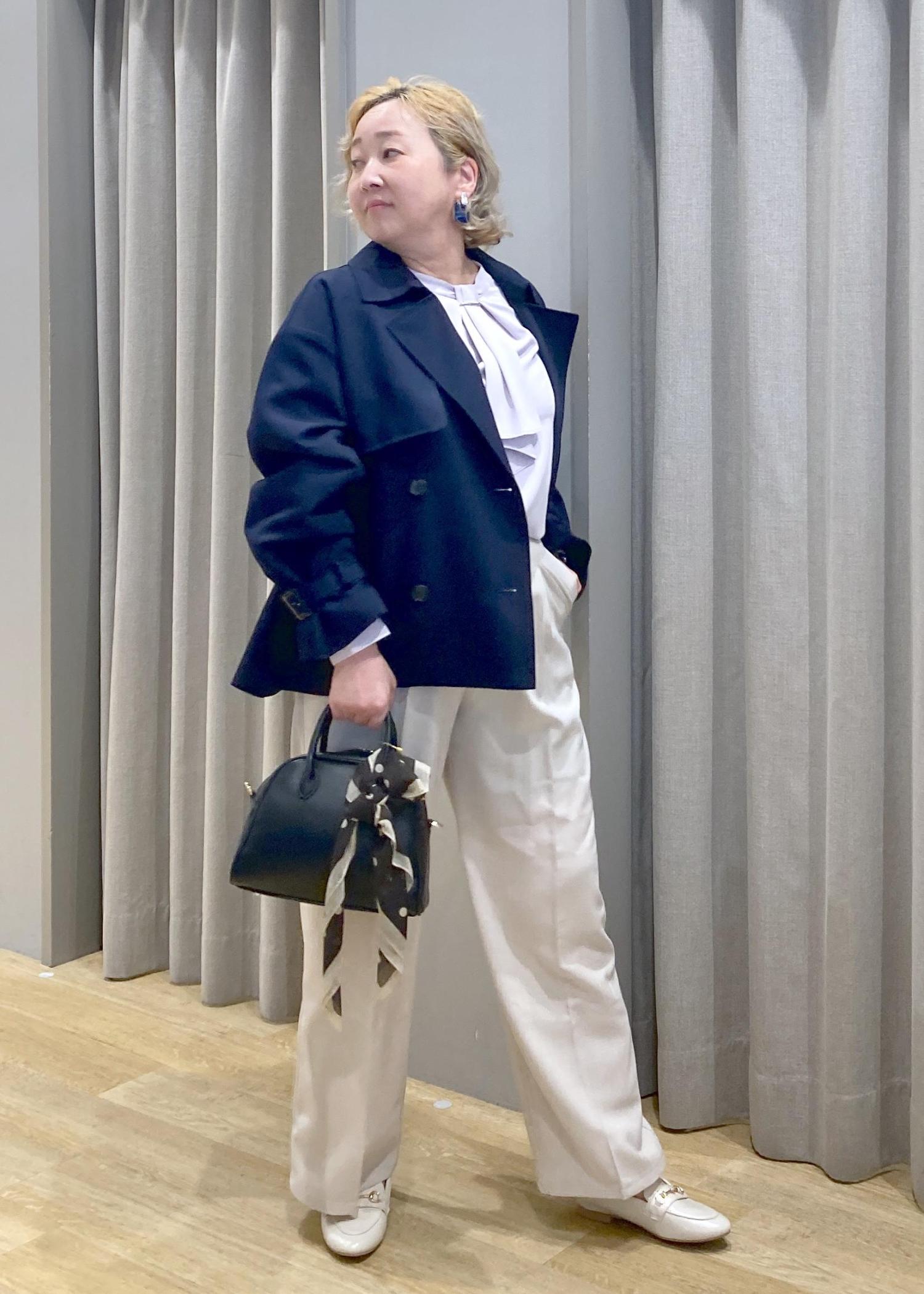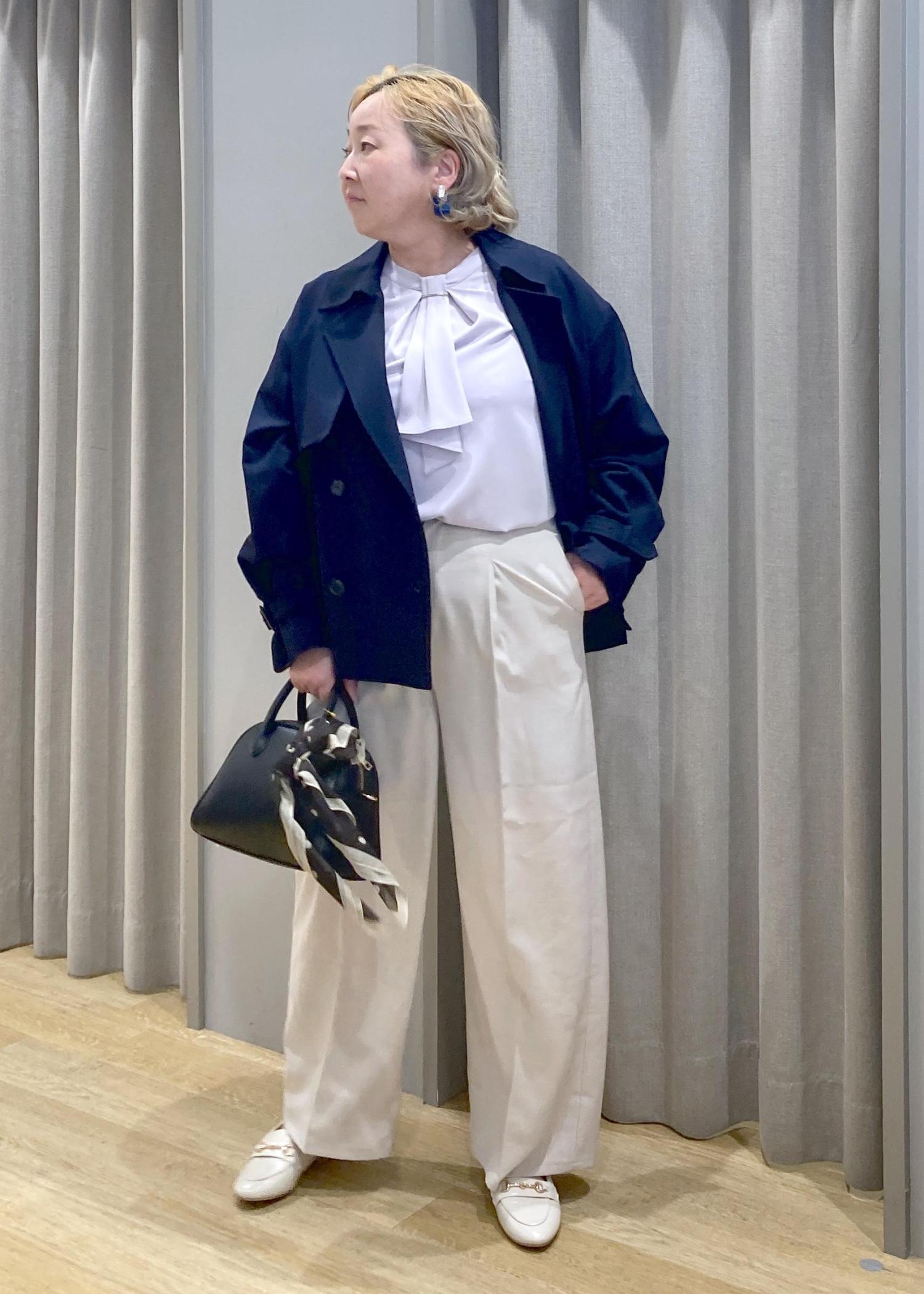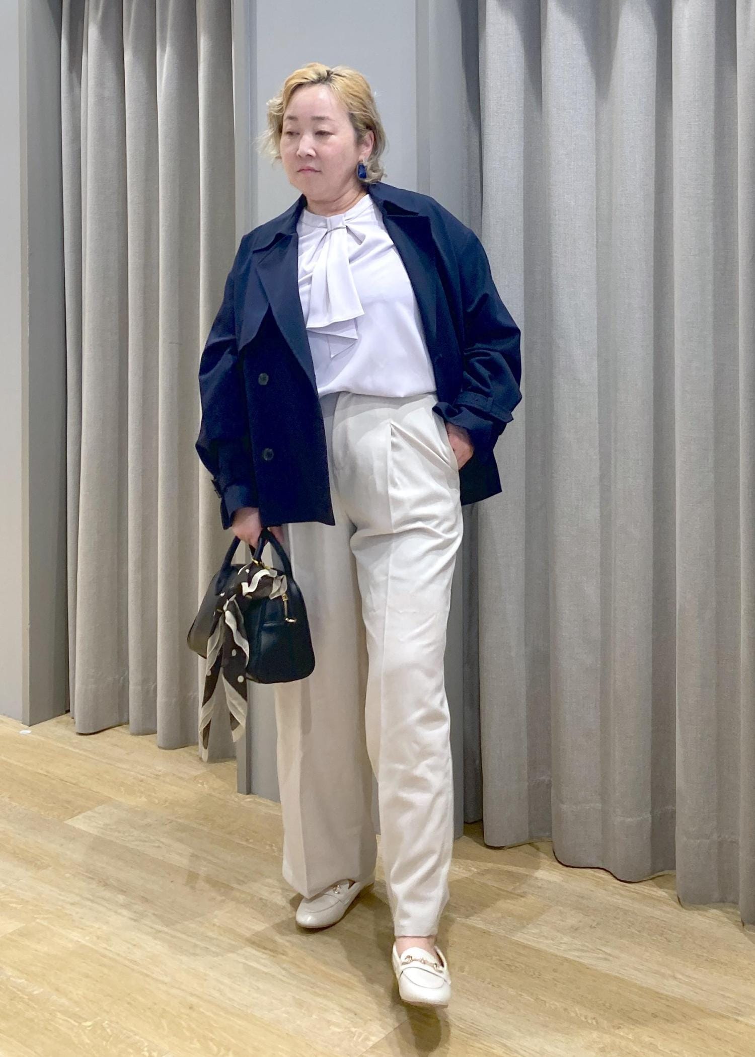 ネイビーならお仕事にも◎、明るめのパンツで抜け感を出せばきれいめカジュアルに。
