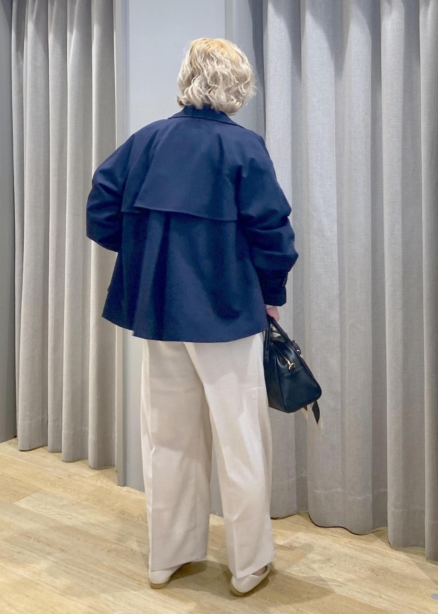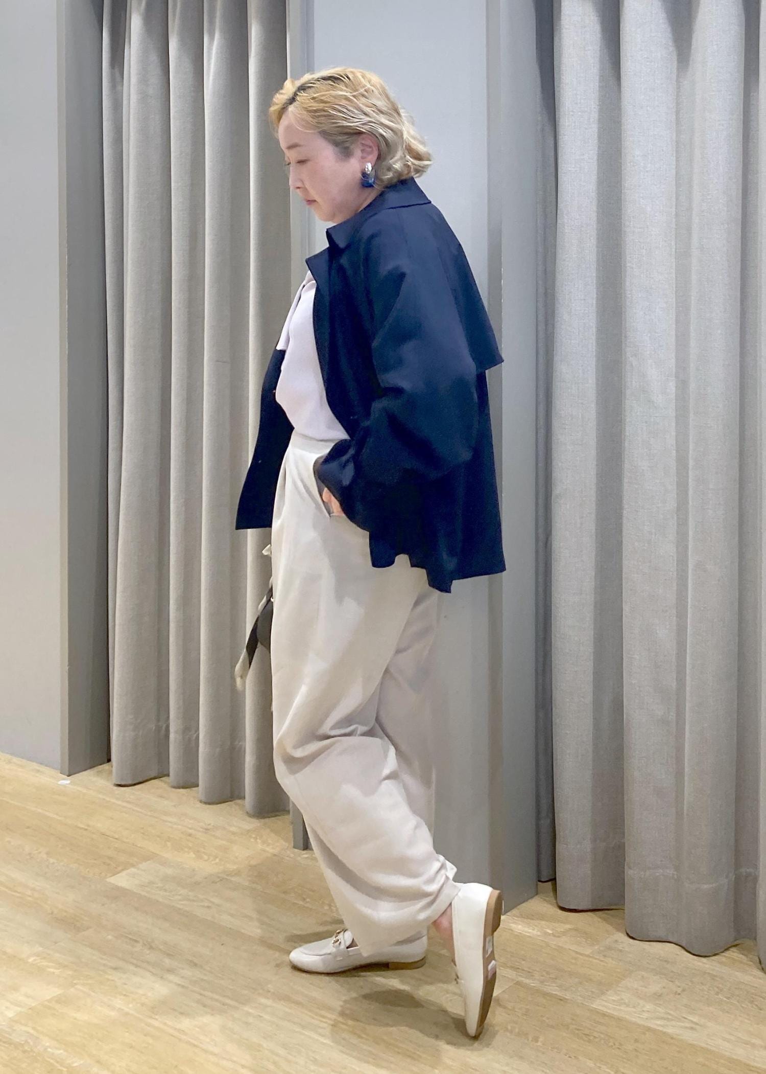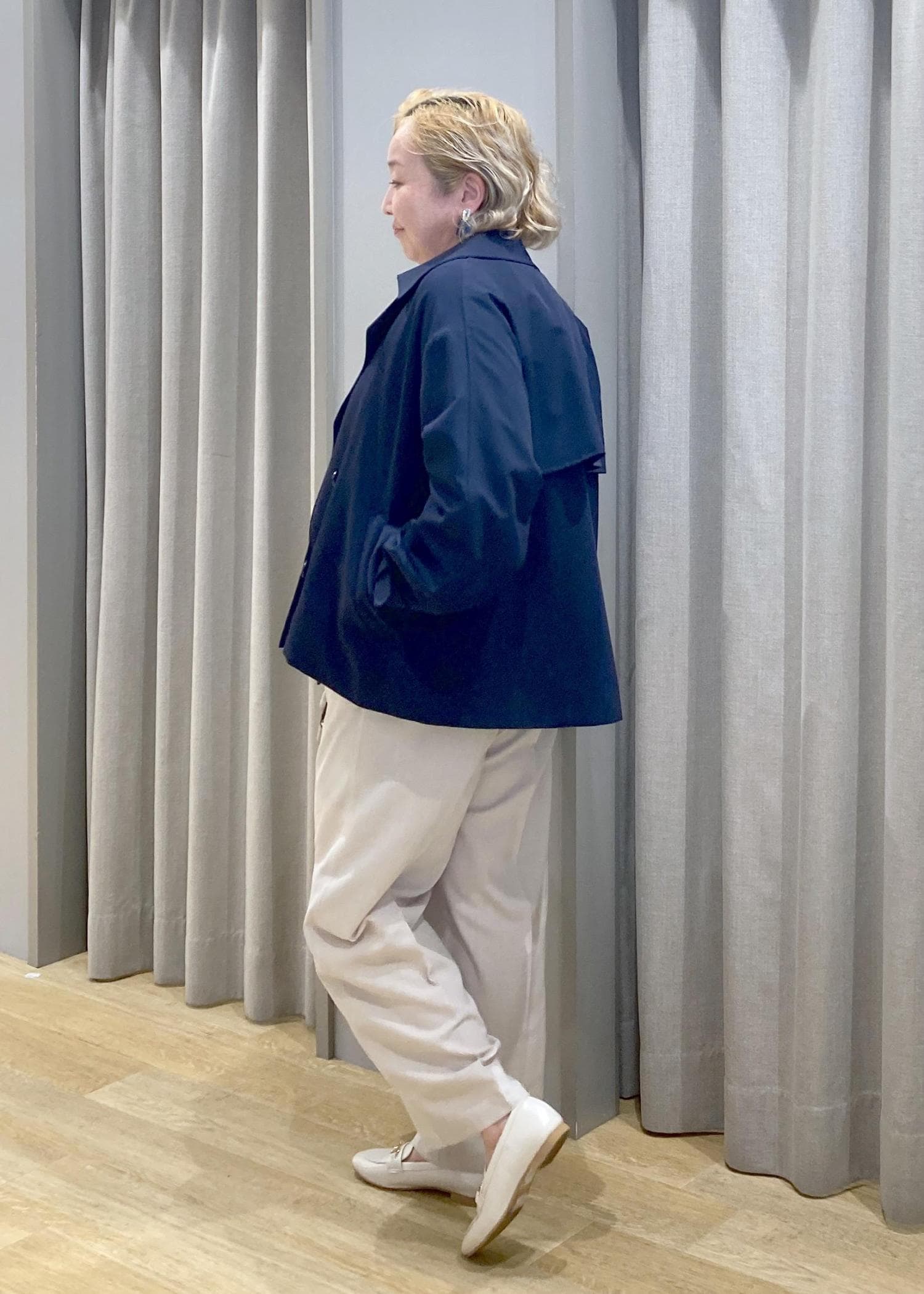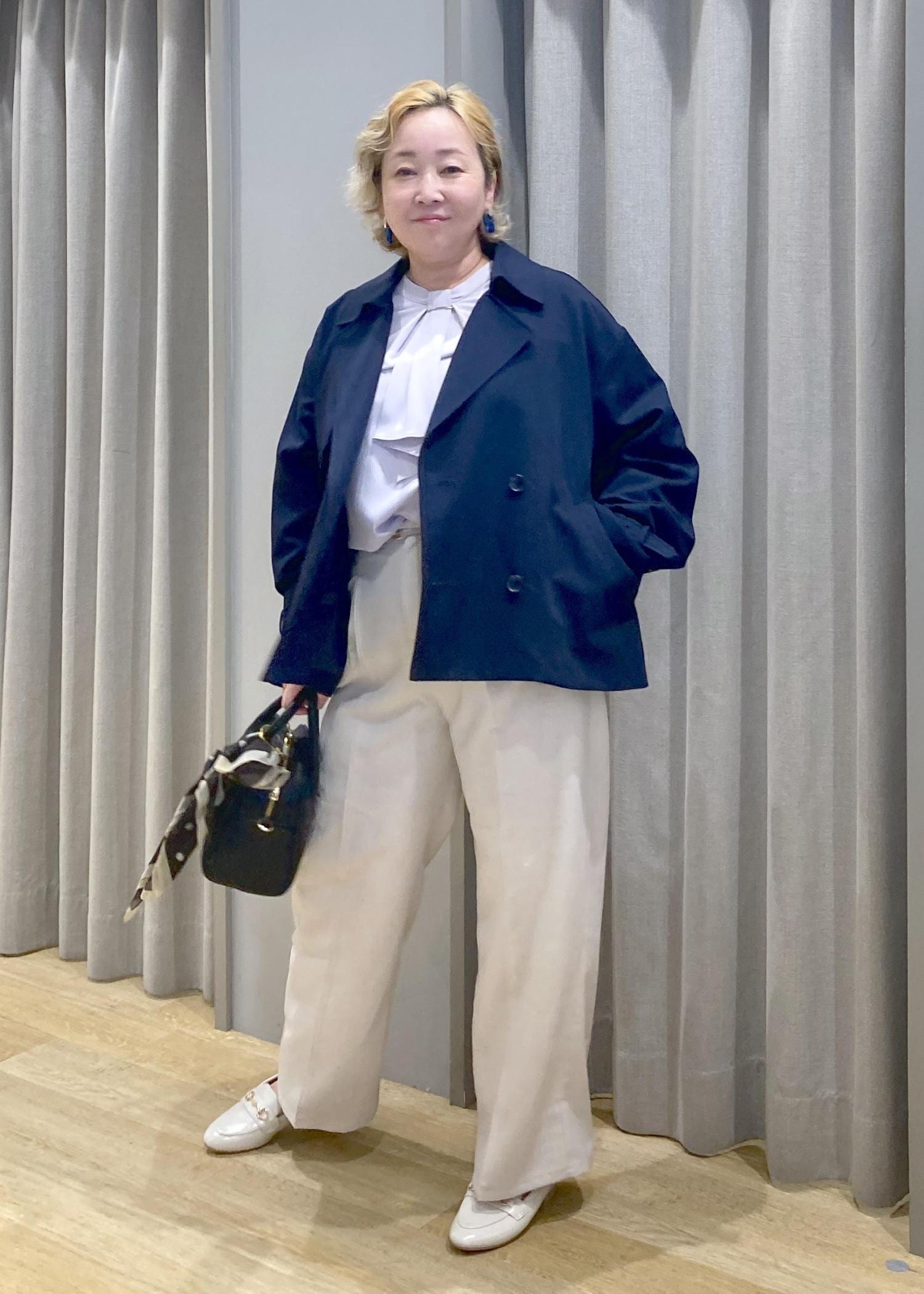 ネイビーならお仕事にも◎、明るめのパンツで抜け感を出せばきれいめカジュアルに。