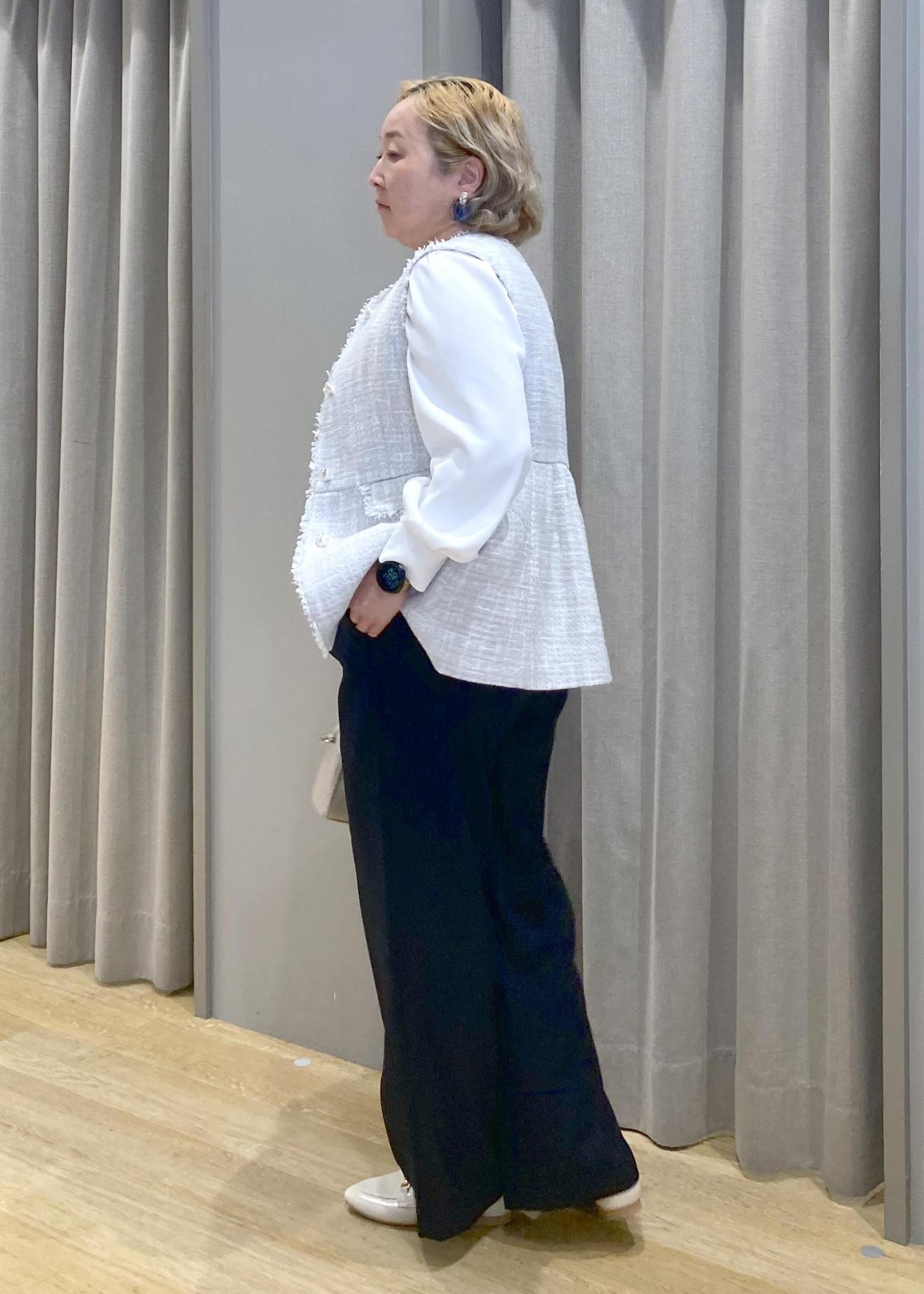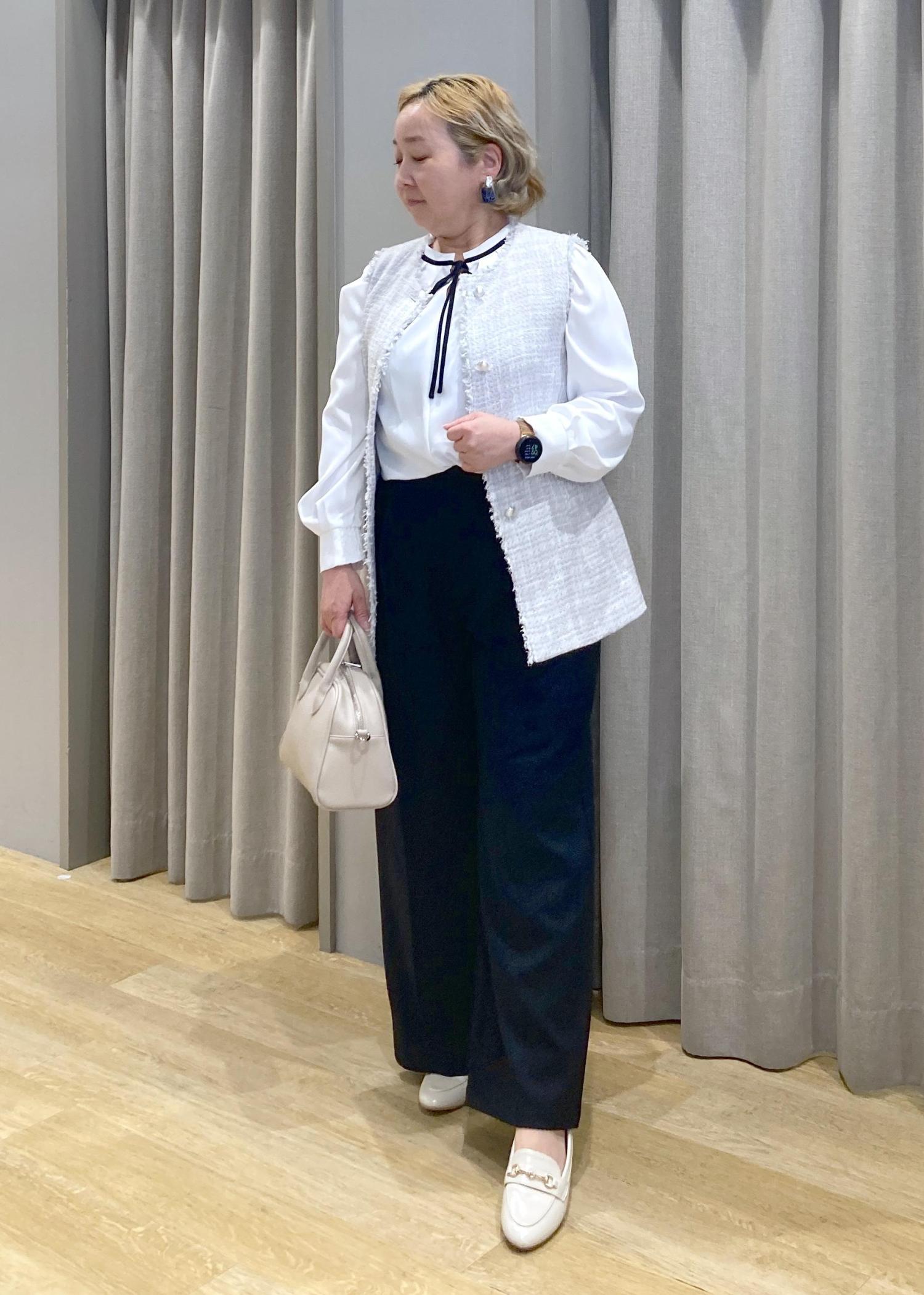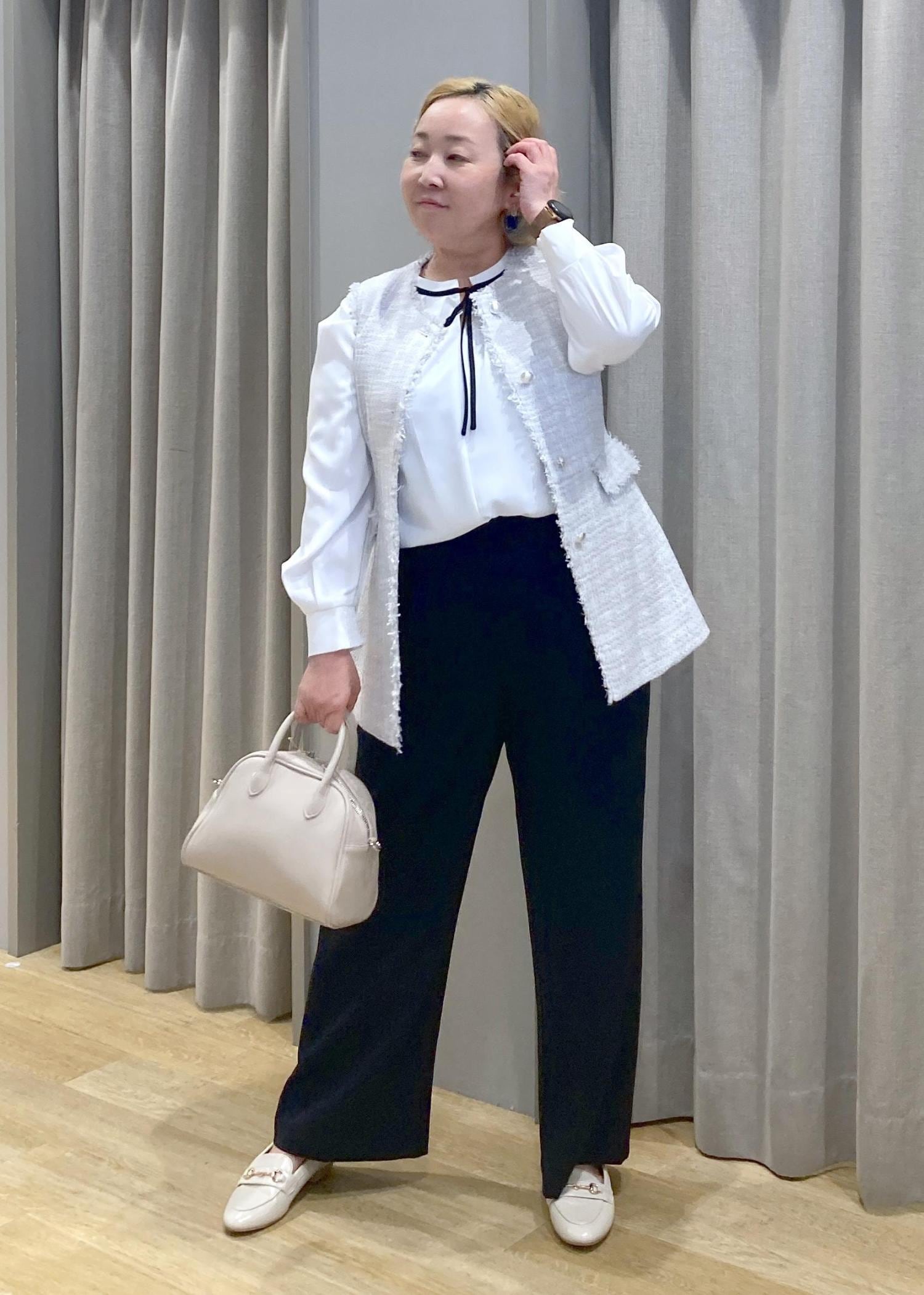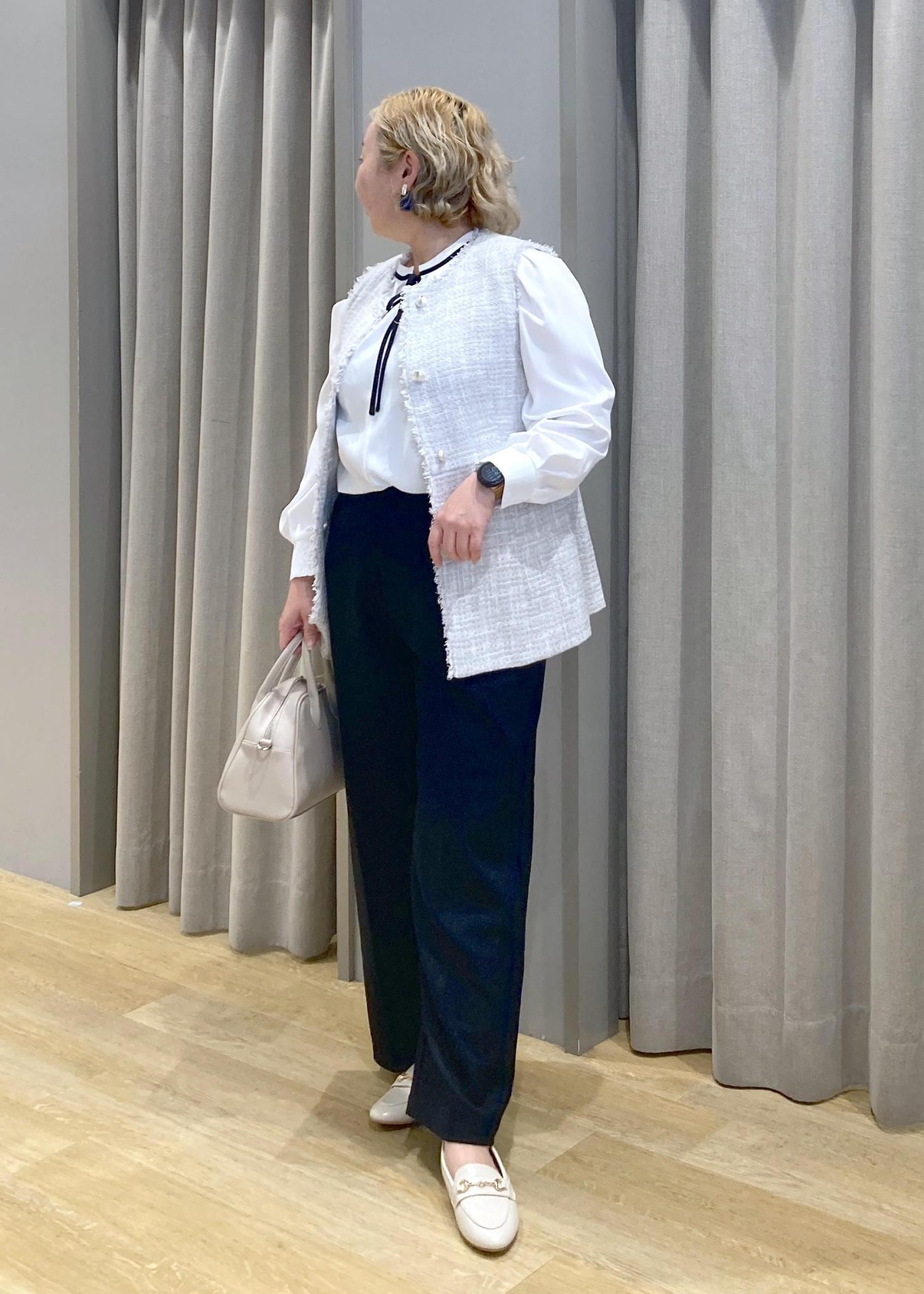 バックスタイルまで可愛いツイートジレに、シンプルなパンツとリボンのアクセントのあるブラウスでちょっとしたセレモニーにも使えるスタイリングに合わせてみました。