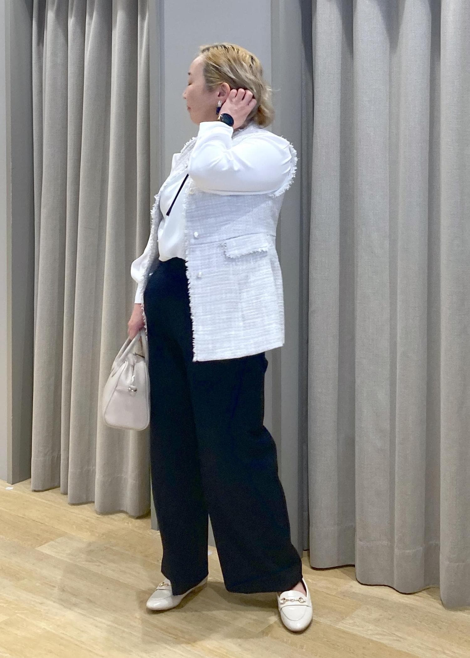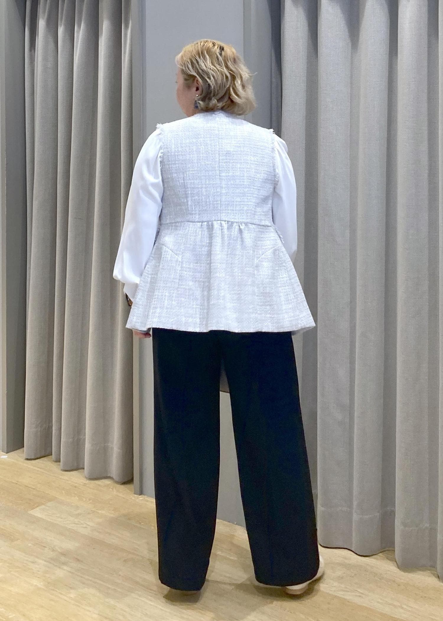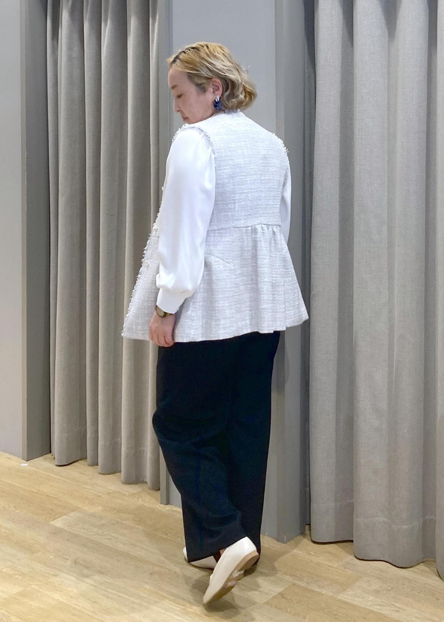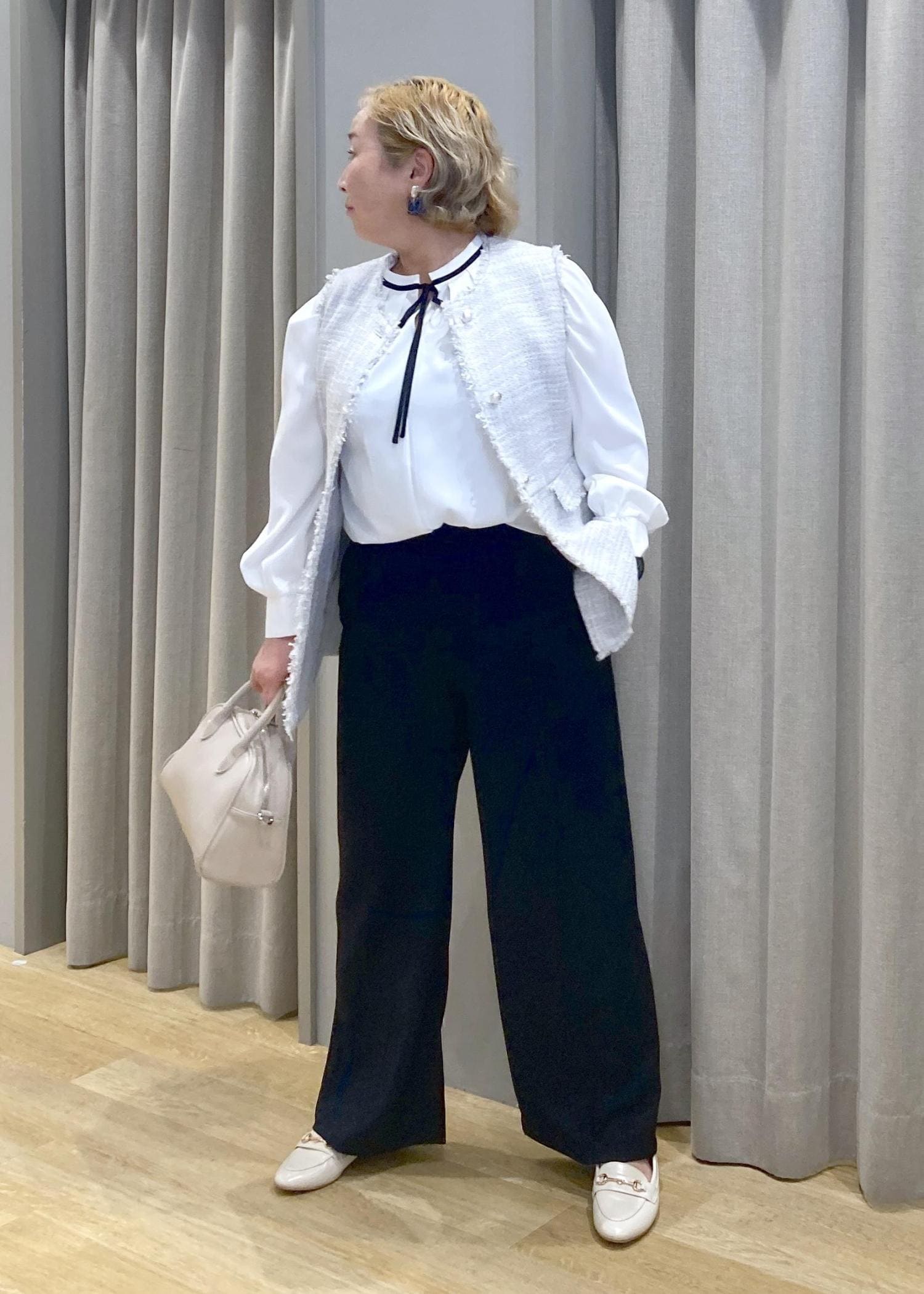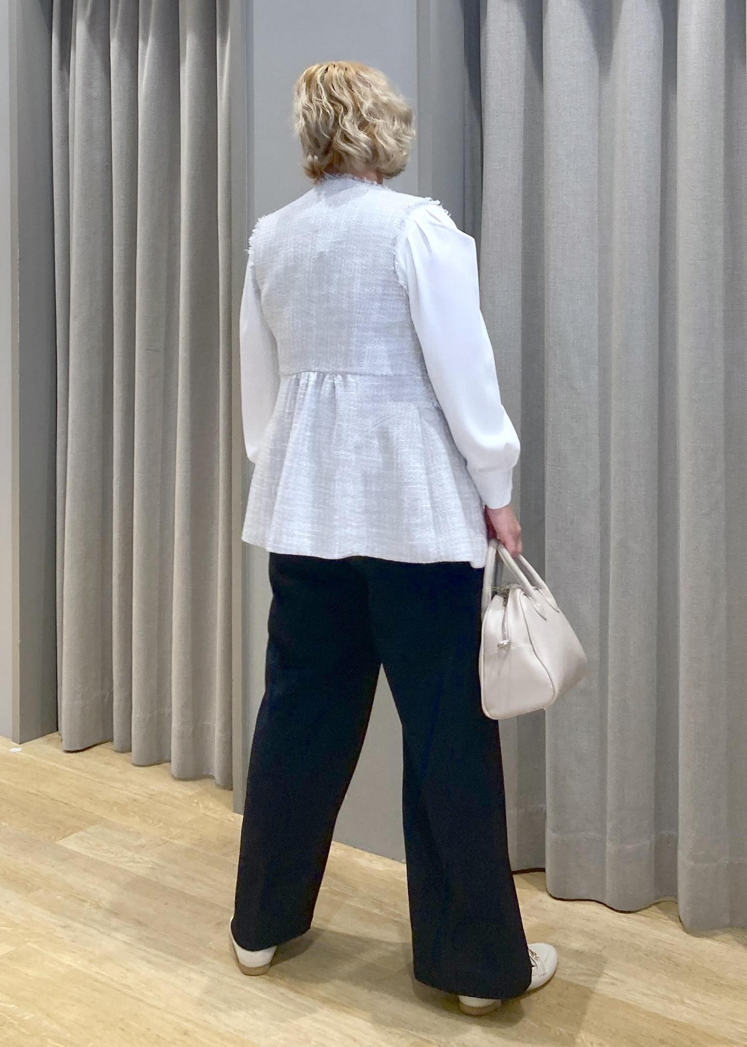 バックスタイルまで可愛いツイートジレに、シンプルなパンツとリボンのアクセントのあるブラウスでちょっとしたセレモニーにも使えるスタイリングに合わせてみました。