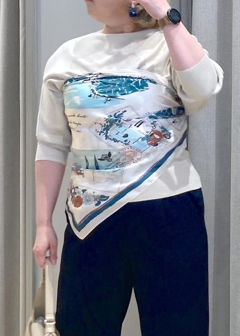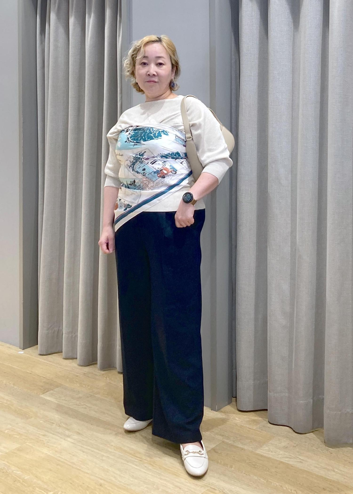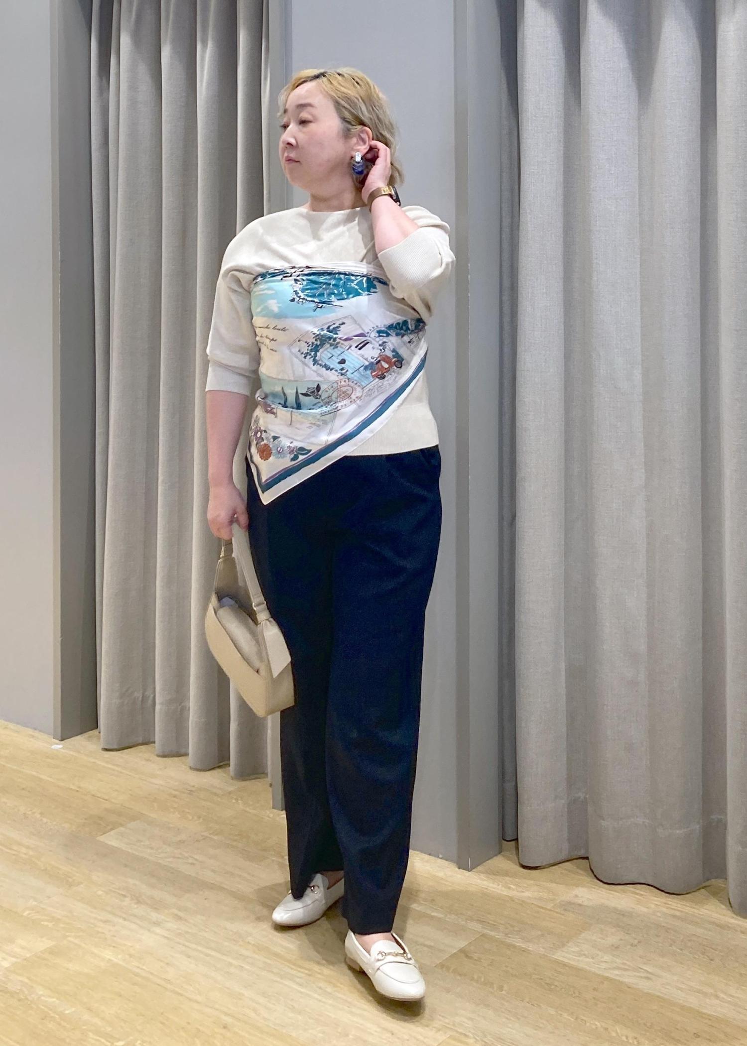無地トップスにスカーフをプラスするだけで、顔まわりが一気に明るく華やかな印象に。