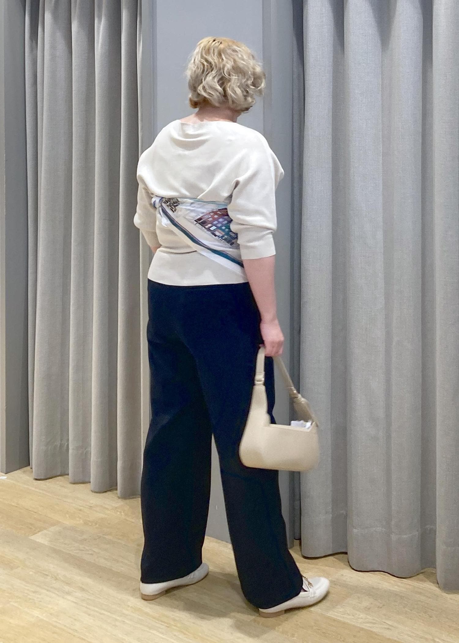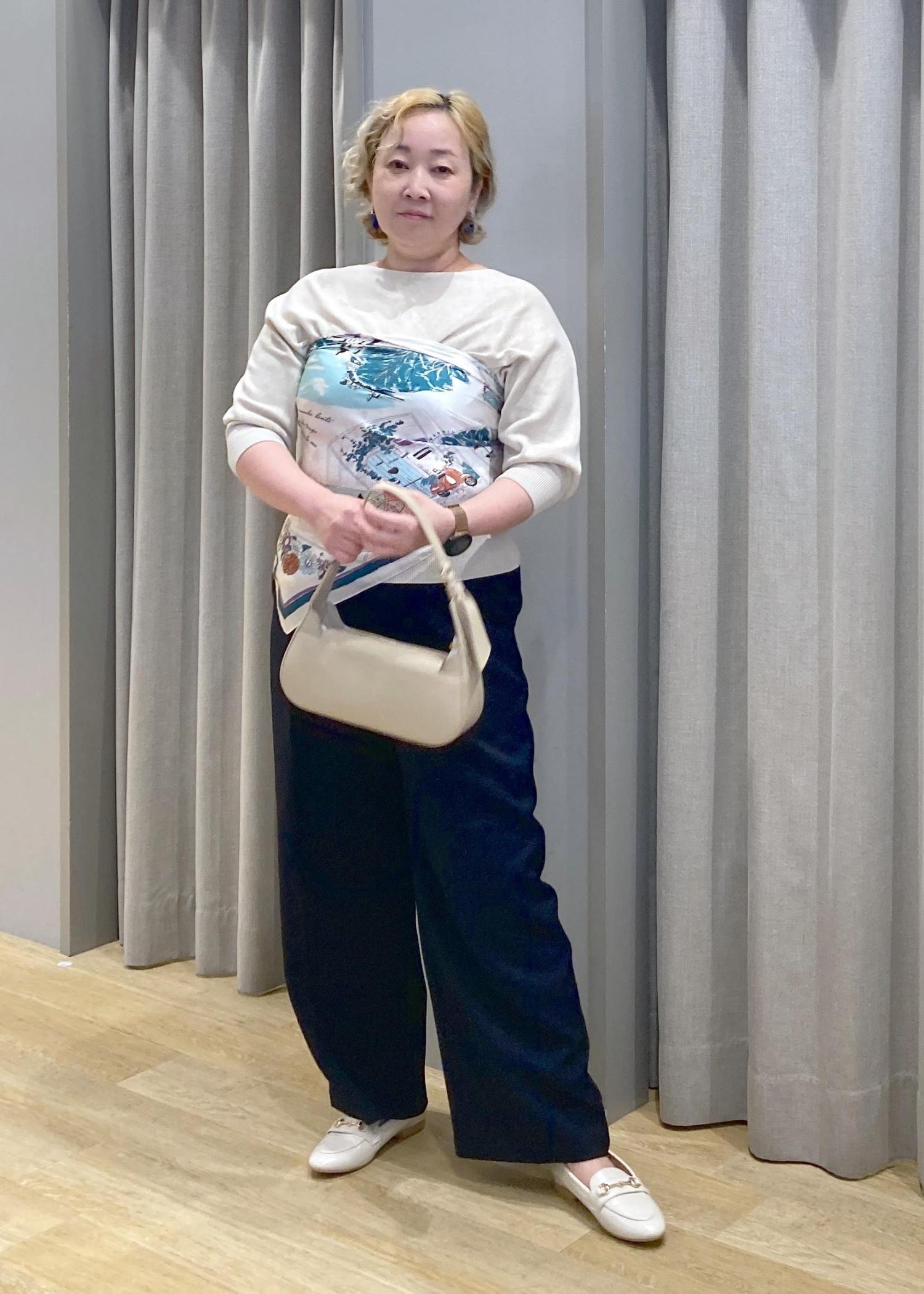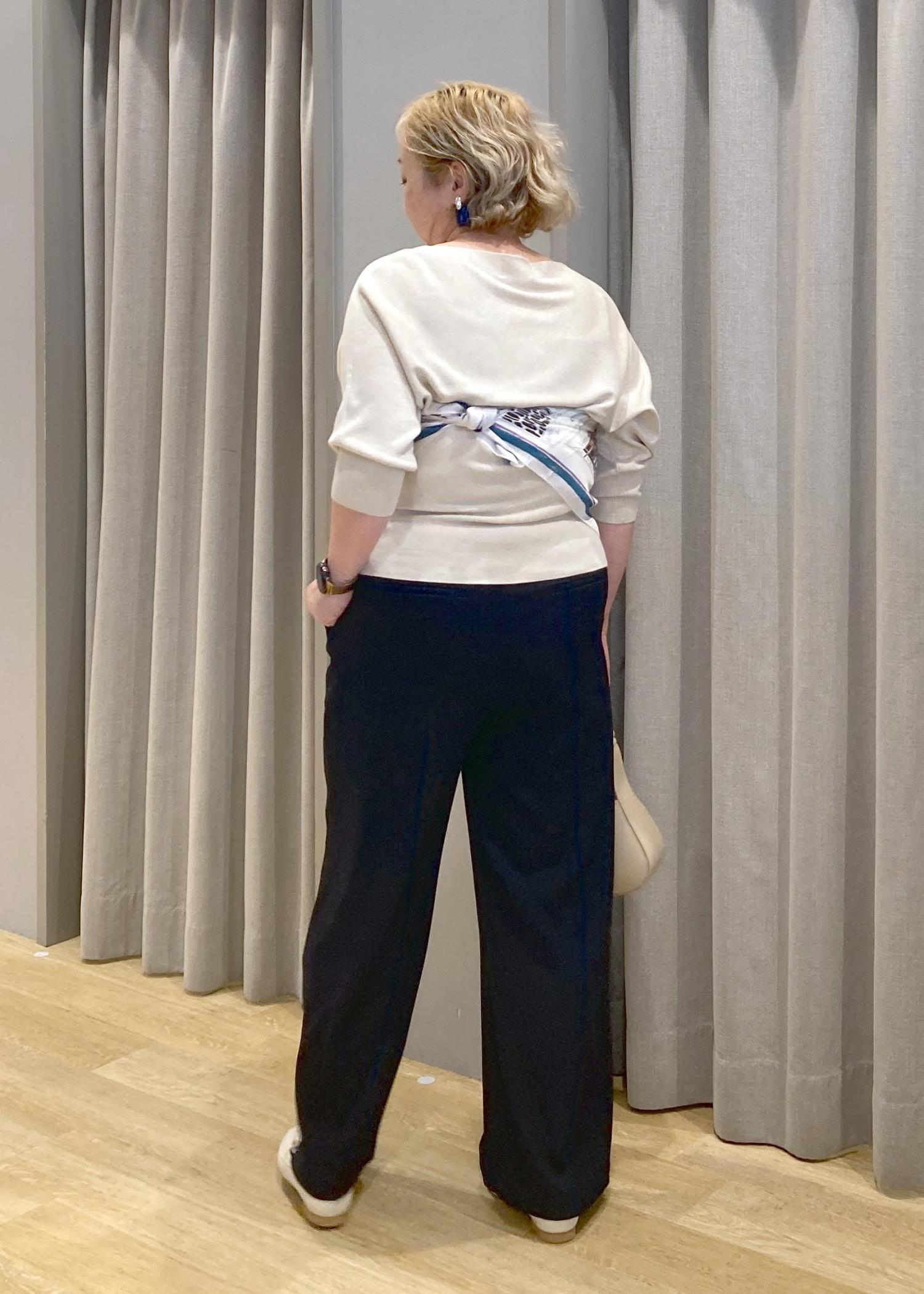 ゆるっとしたワイドパンツが腰まわりをカバーしつつ、上品さもキープ。