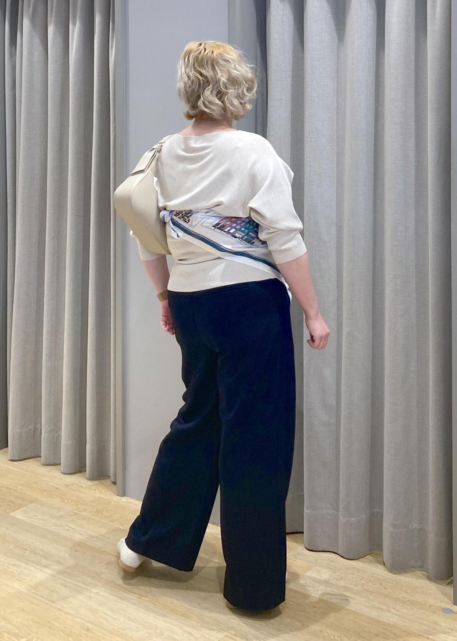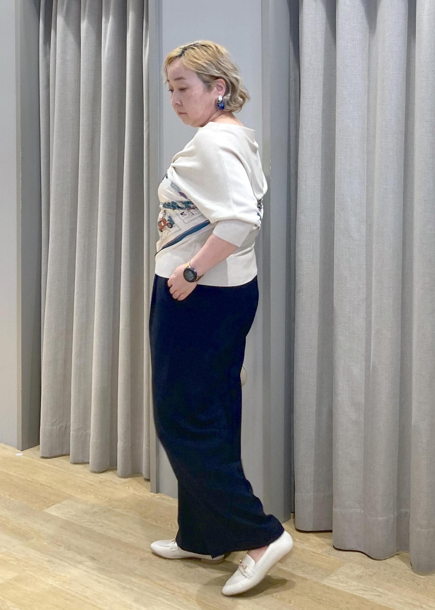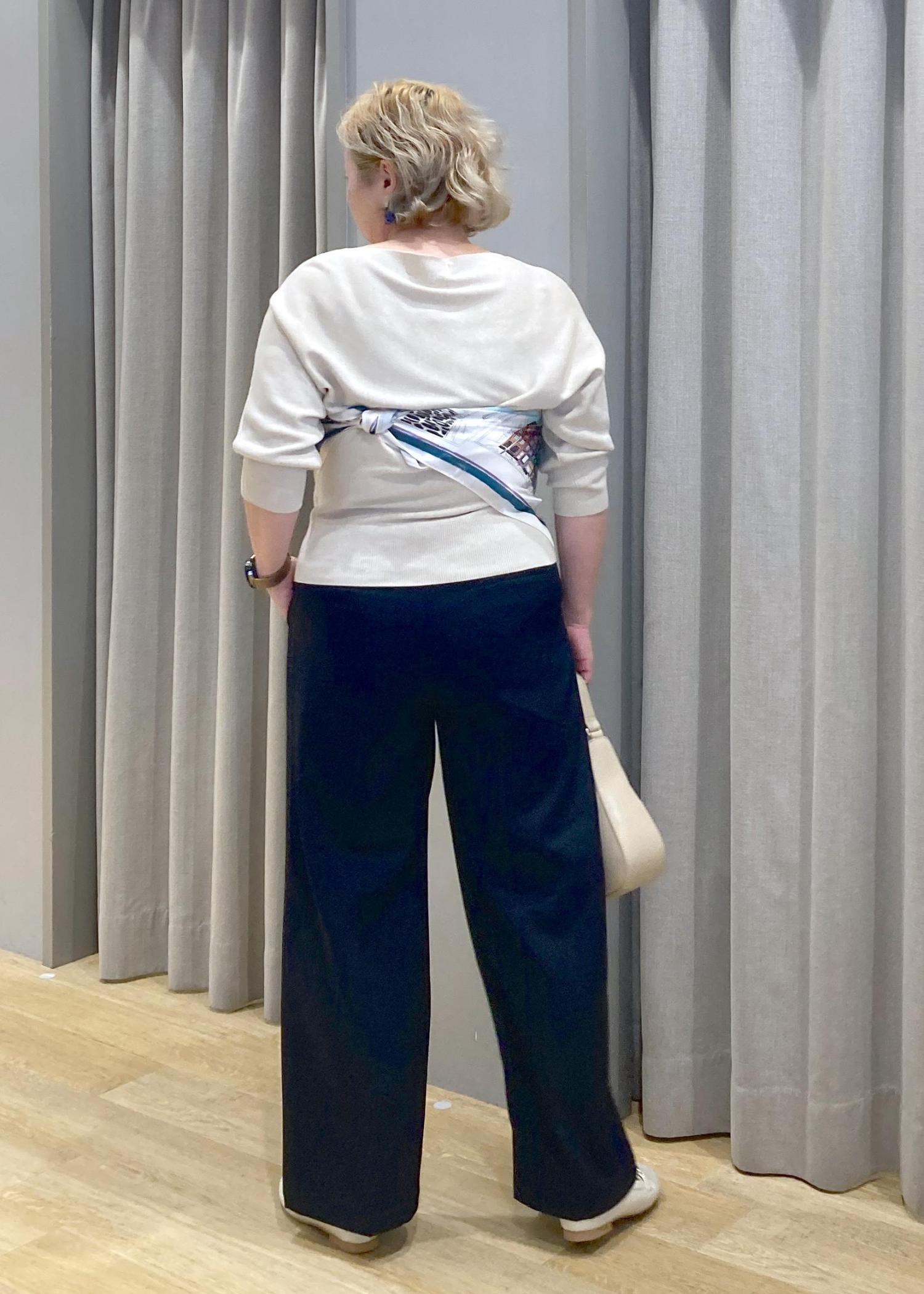 ゆるっとしたワイドパンツが腰まわりをカバーしつつ、上品さもキープ。