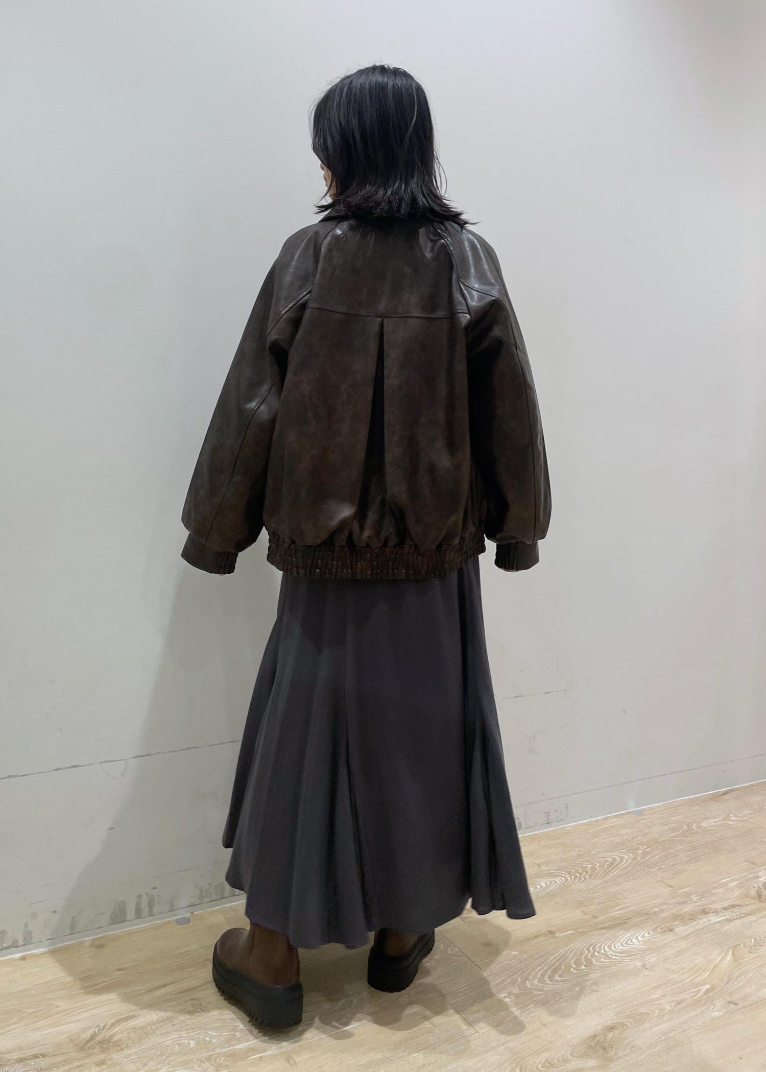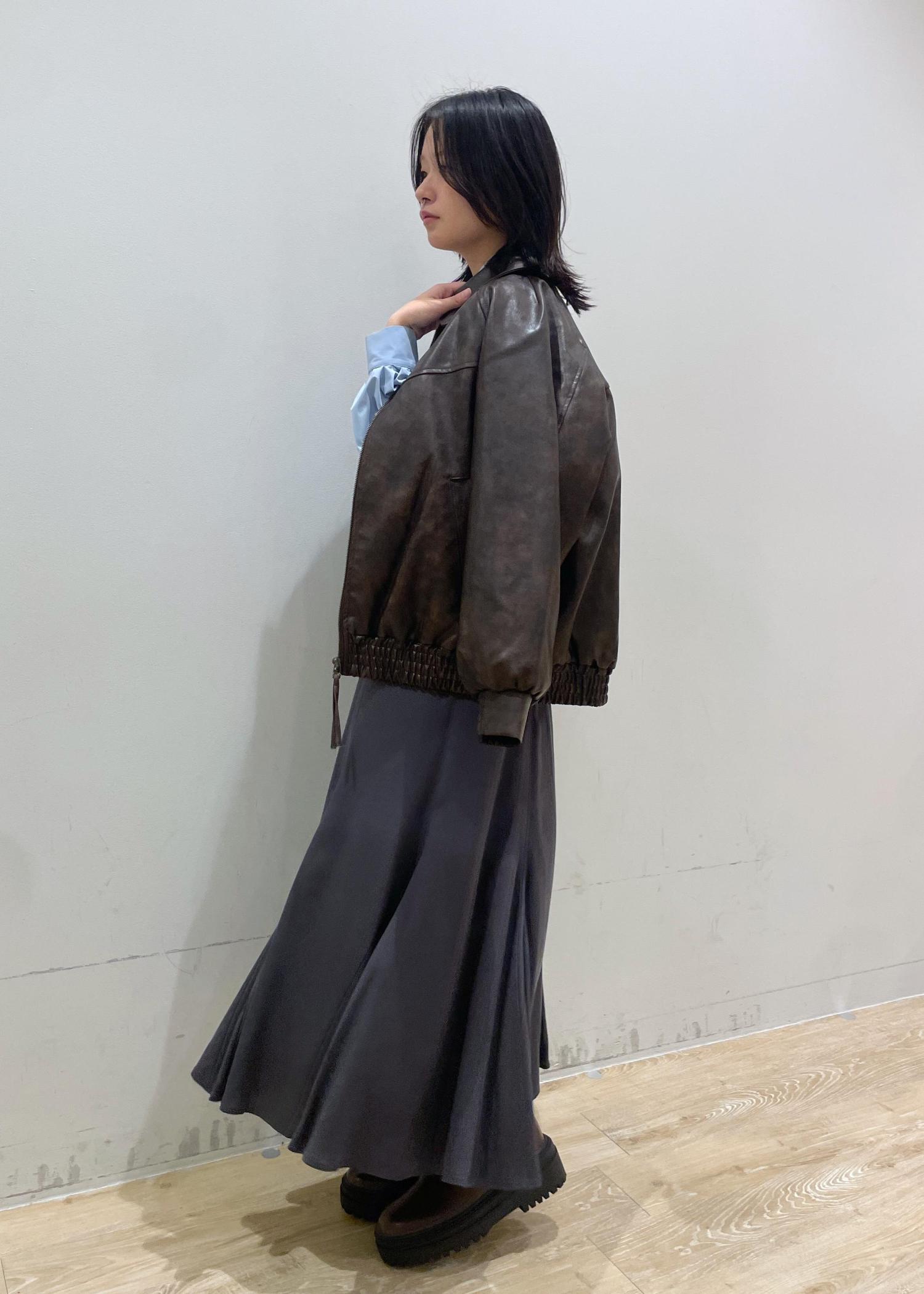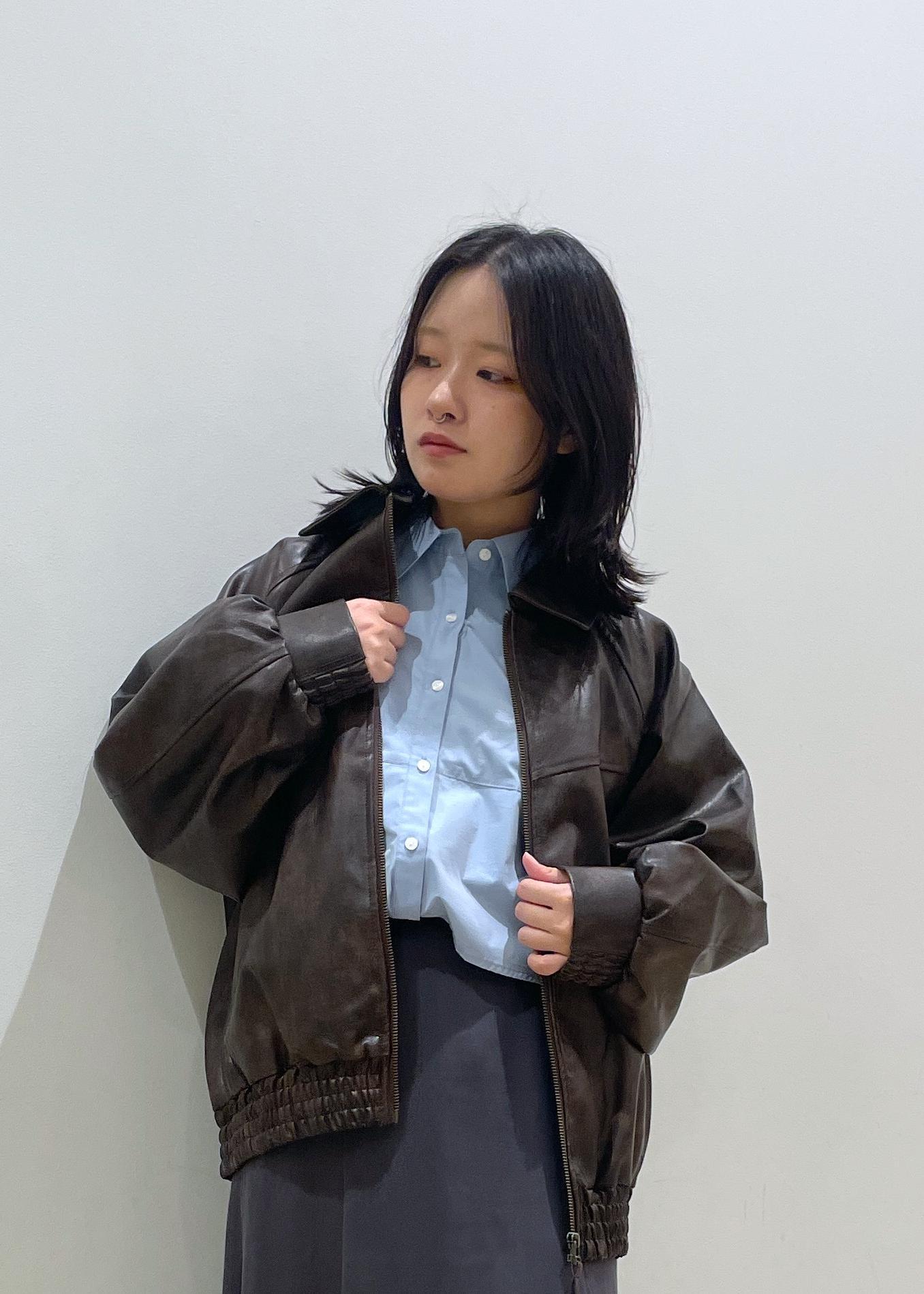 ブルーシャツの爽やかさをベースに、レザージャケットで辛さをプラス、ロングスカートの流れるようなラインで女性らしさも残した絶妙なバランスのコーデです!!