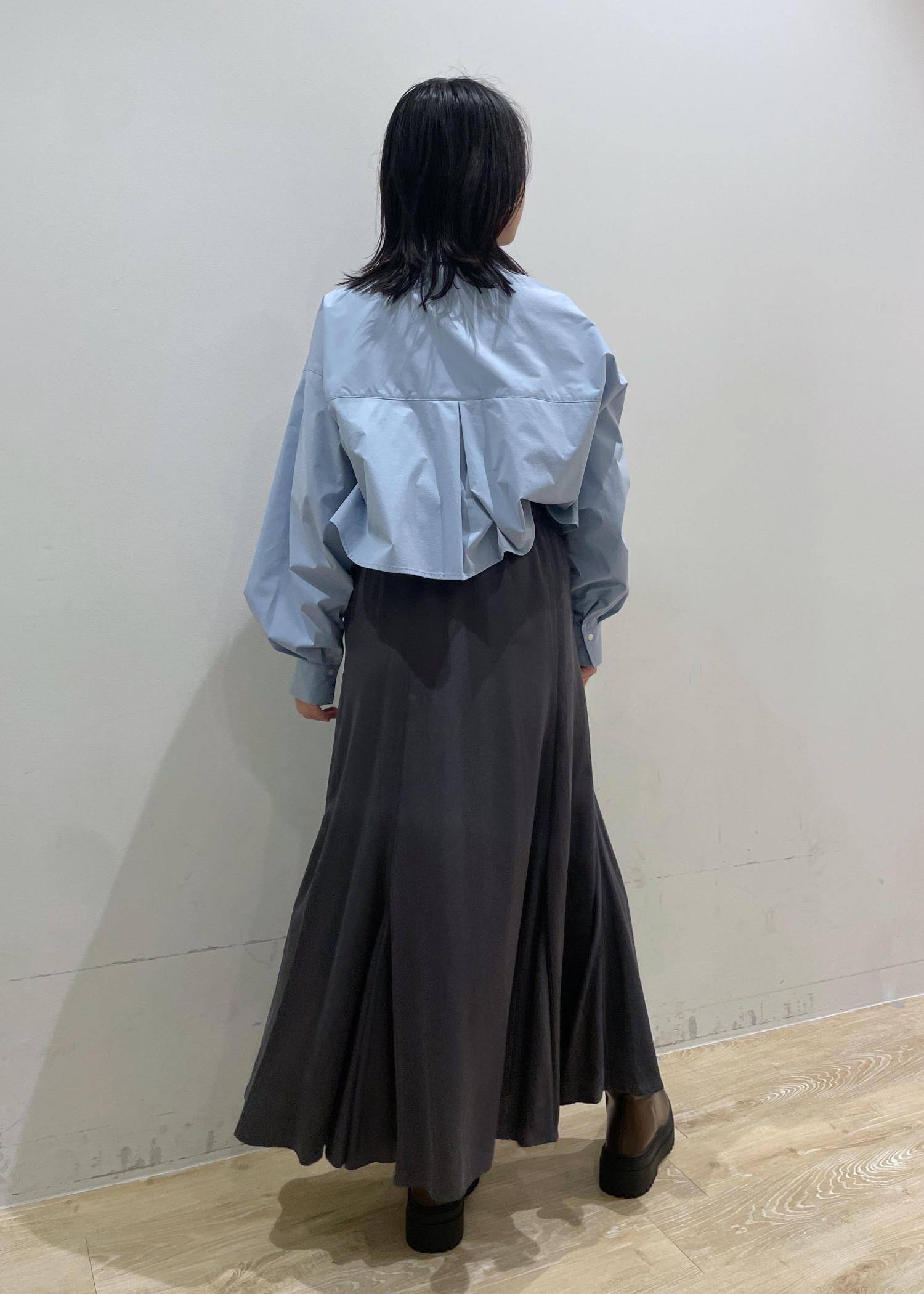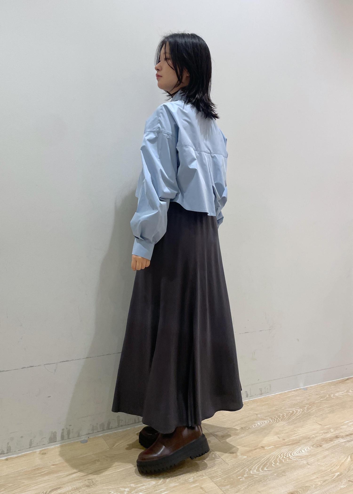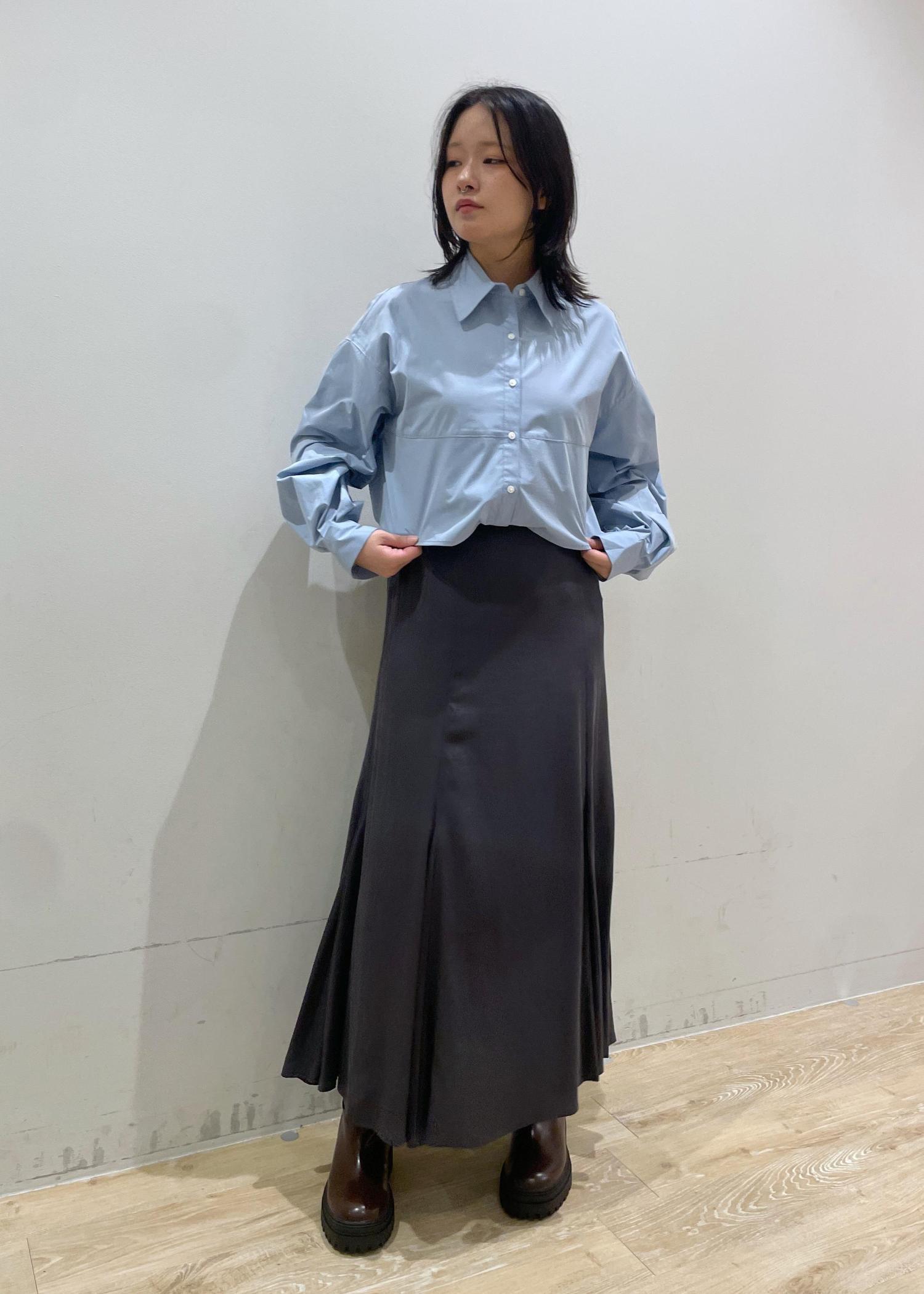 ブルーシャツの爽やかさをベースに、レザージャケットで辛さをプラス、ロングスカートの流れるようなラインで女性らしさも残した絶妙なバランスのコーデです!!