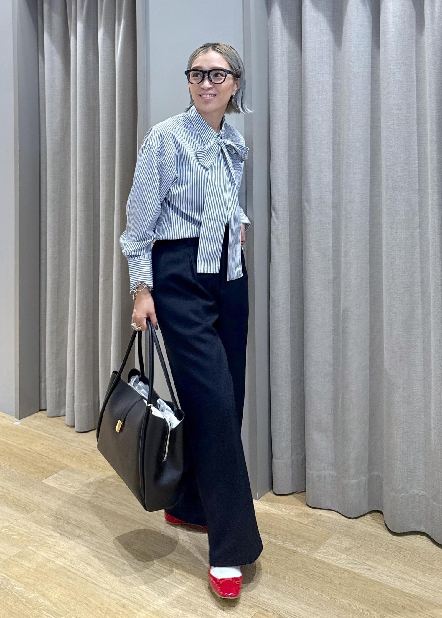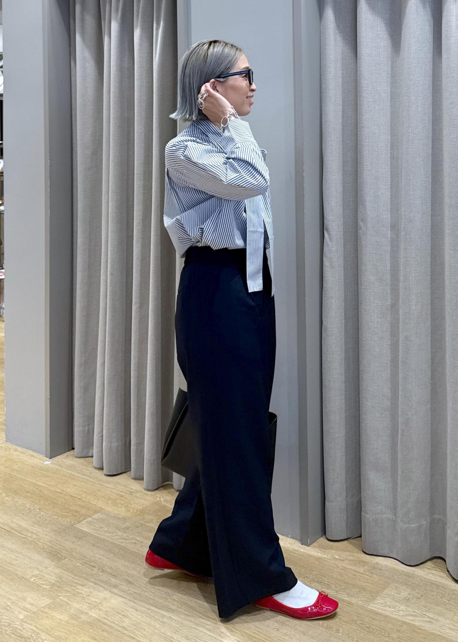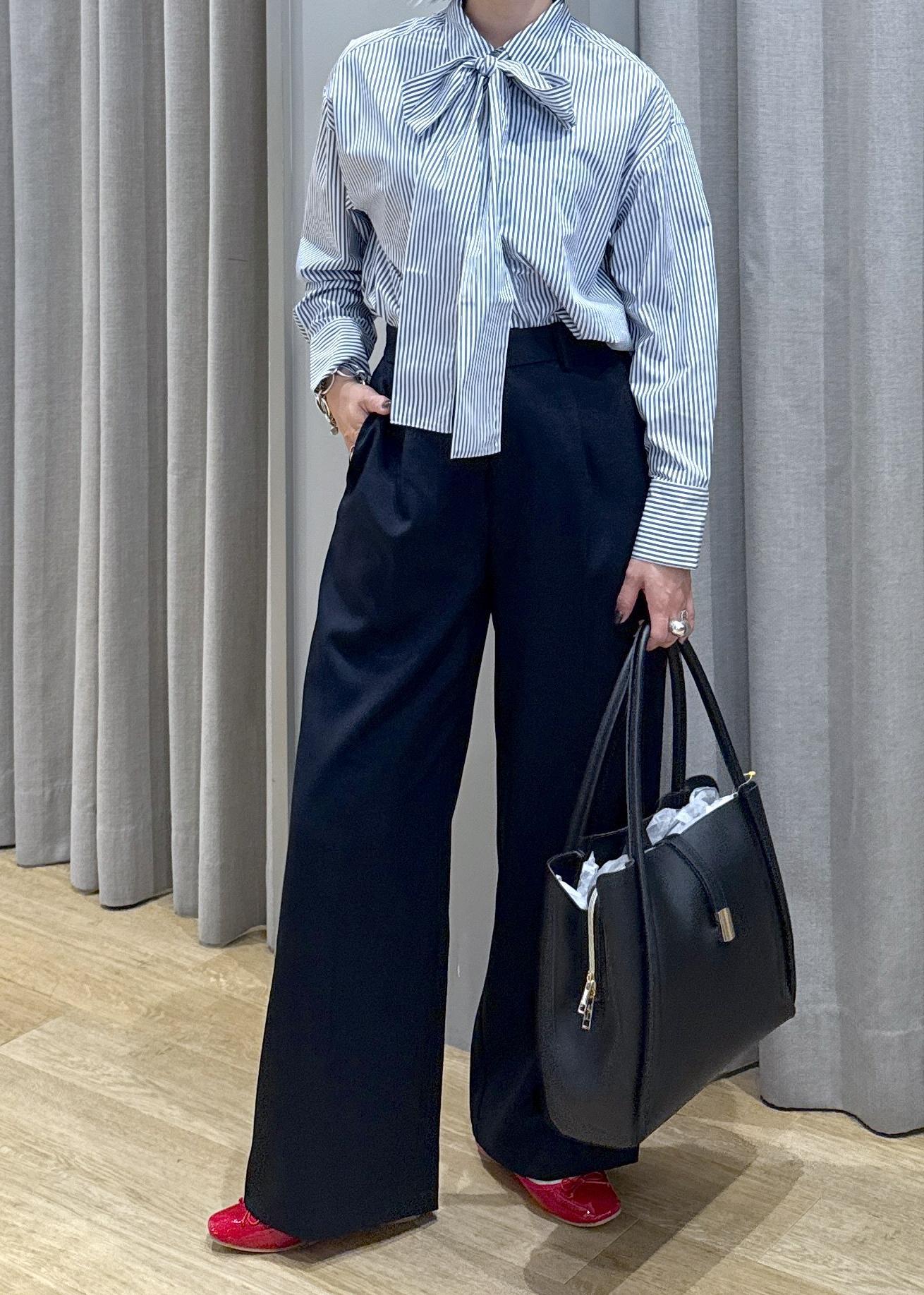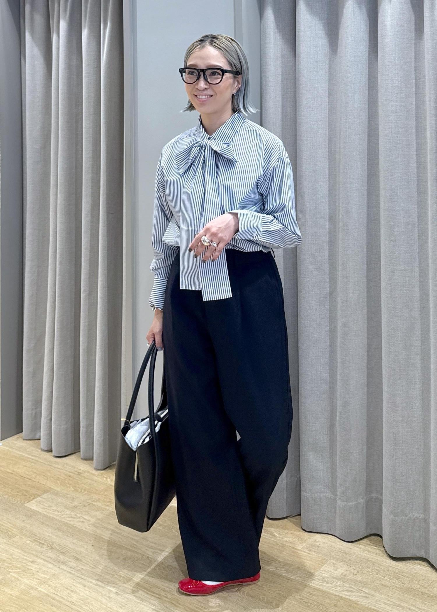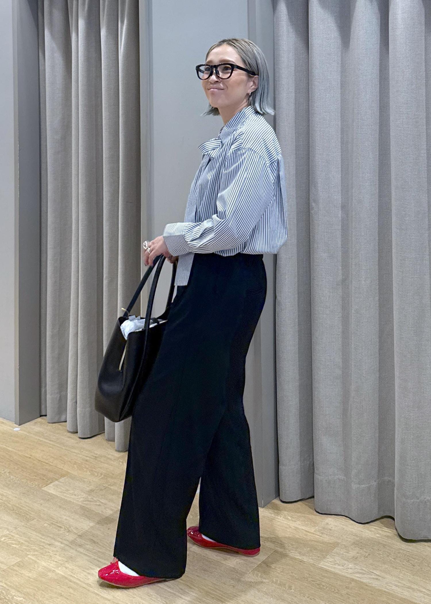 気になるヒップ周りをタックと太ももからのワイドラインがカバーしてくれます。