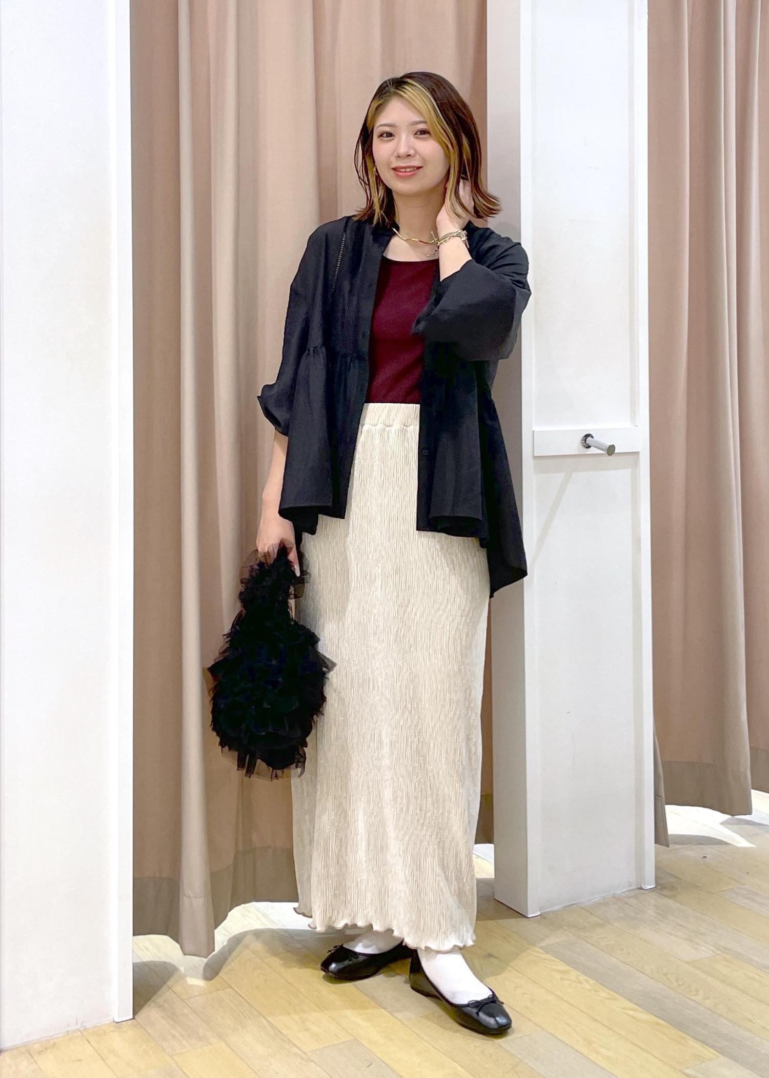 スカート、小物はベーシックカラーで統一し、ボルドーのインナーで差し色をプラス◎