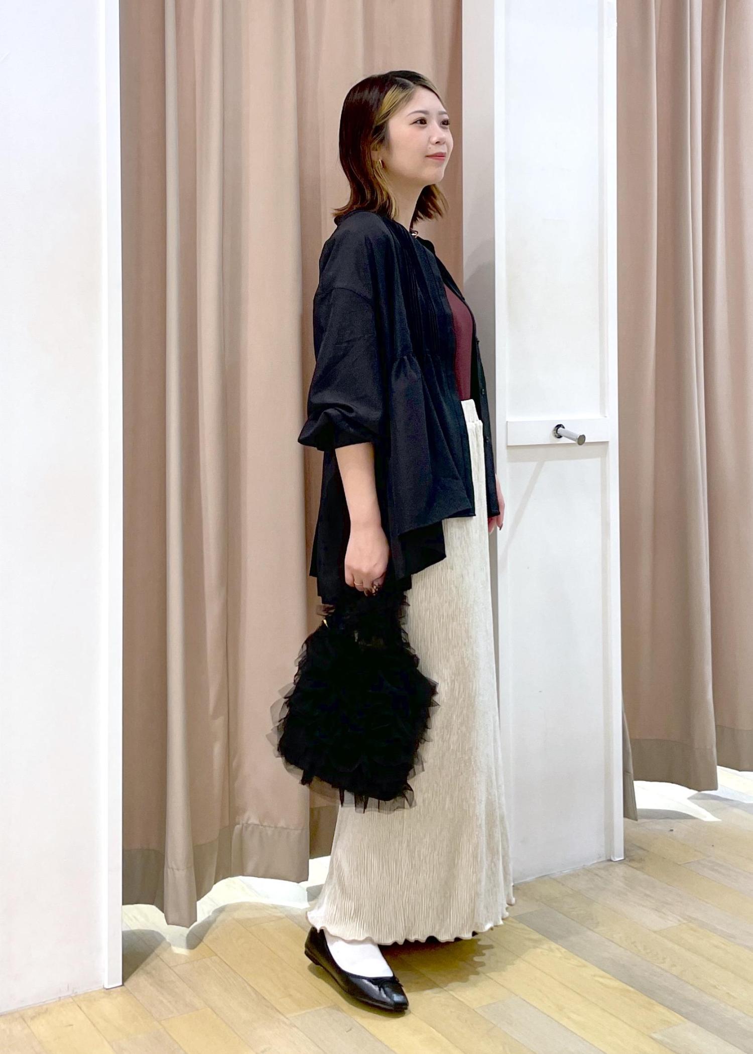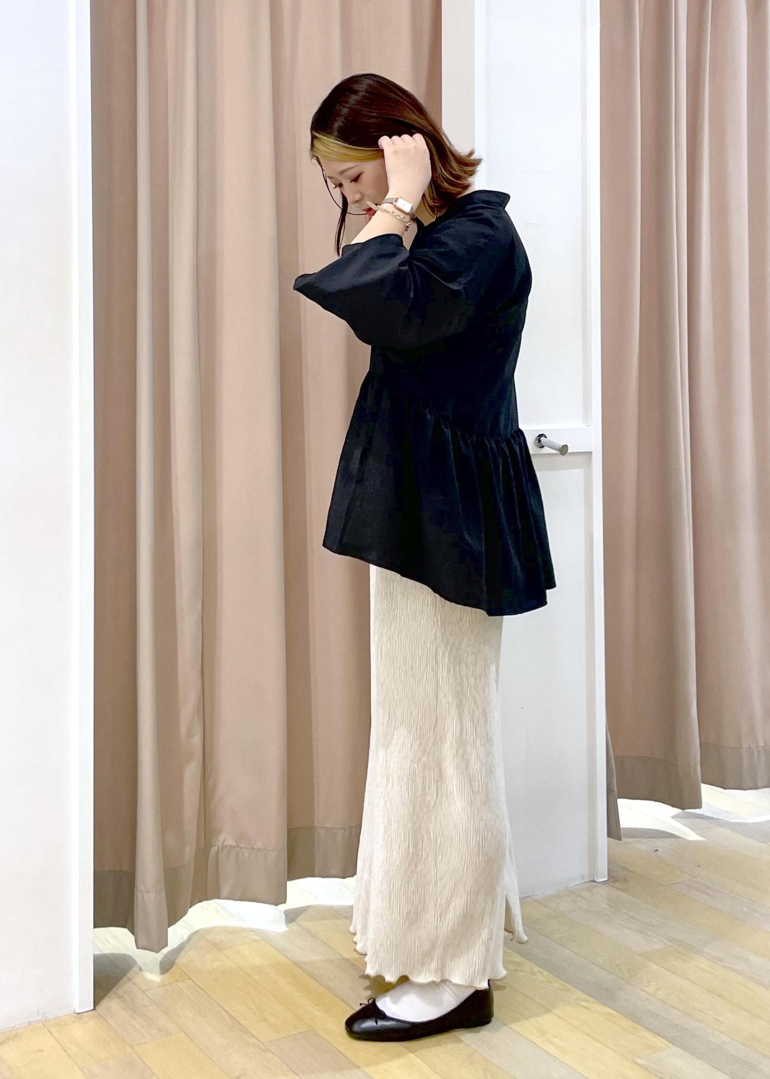 胸元のピンタックが可愛いペプラムブラウスを、羽織として着用しました。