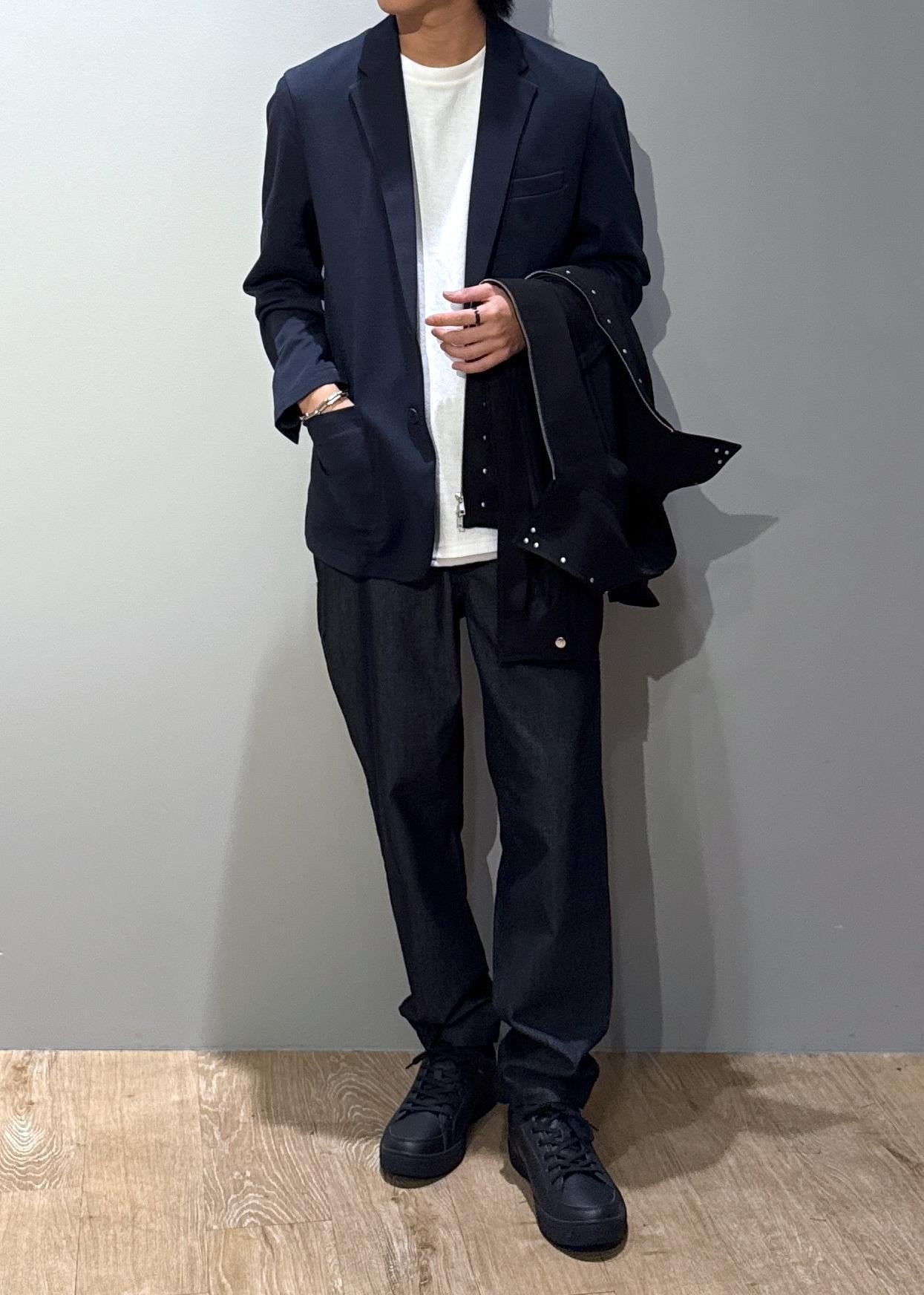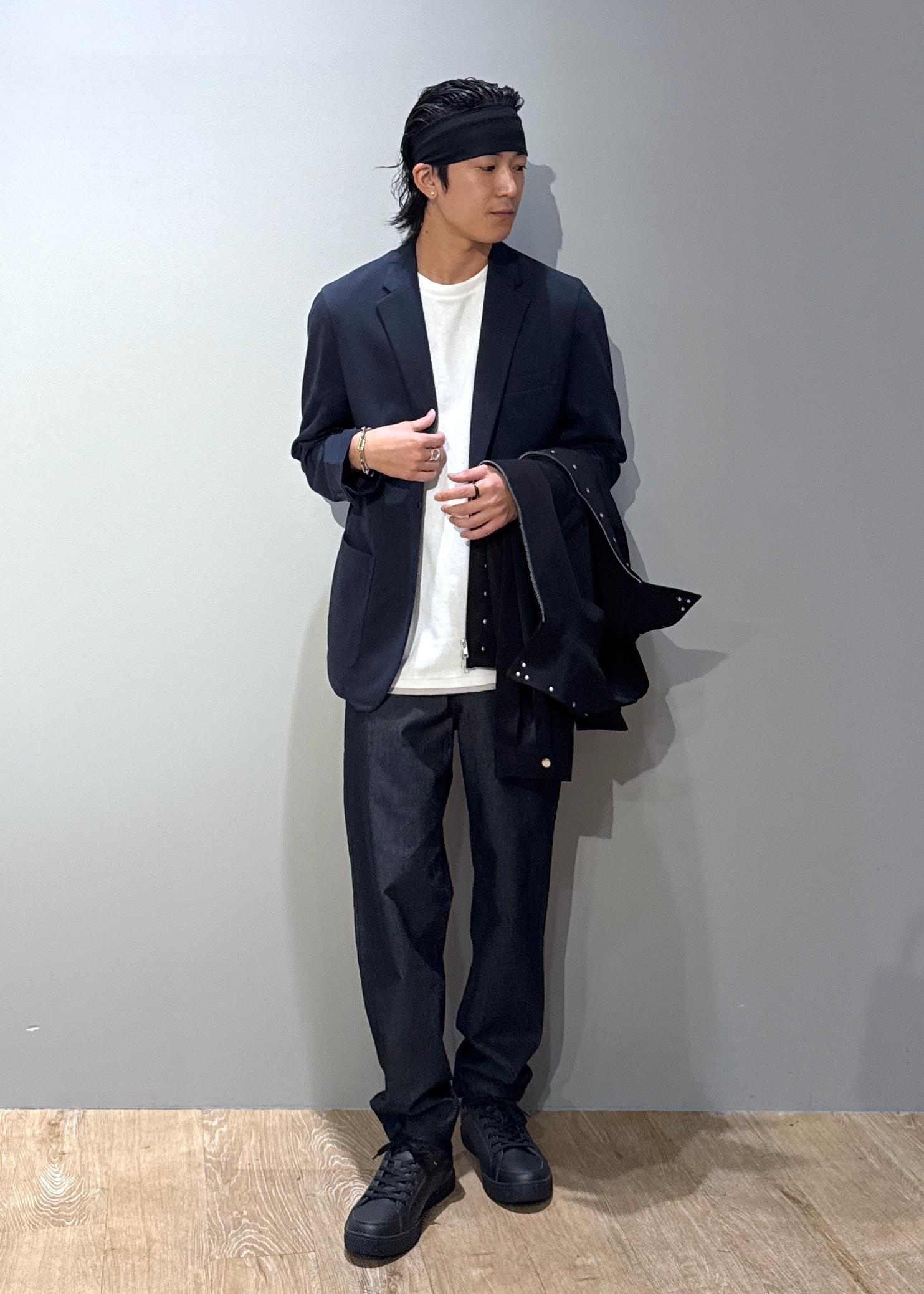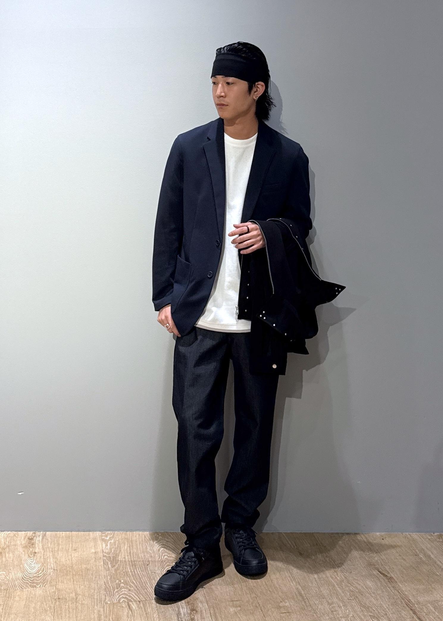 ビジネスカジュアルセットアップアイテムを使って、堅すぎず、抜けすぎてないコーデを組んでみました。