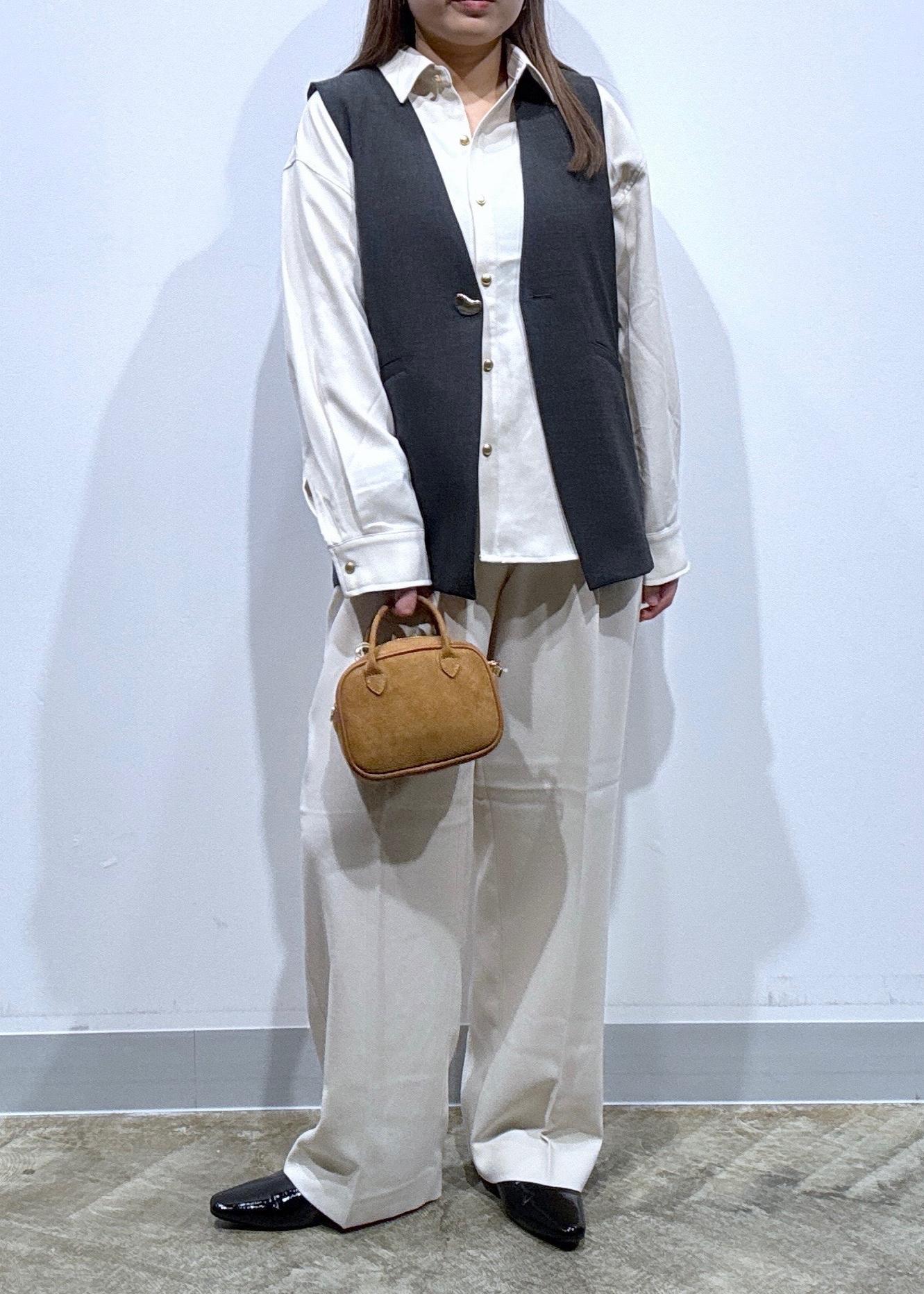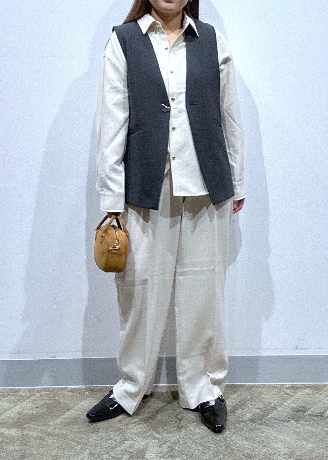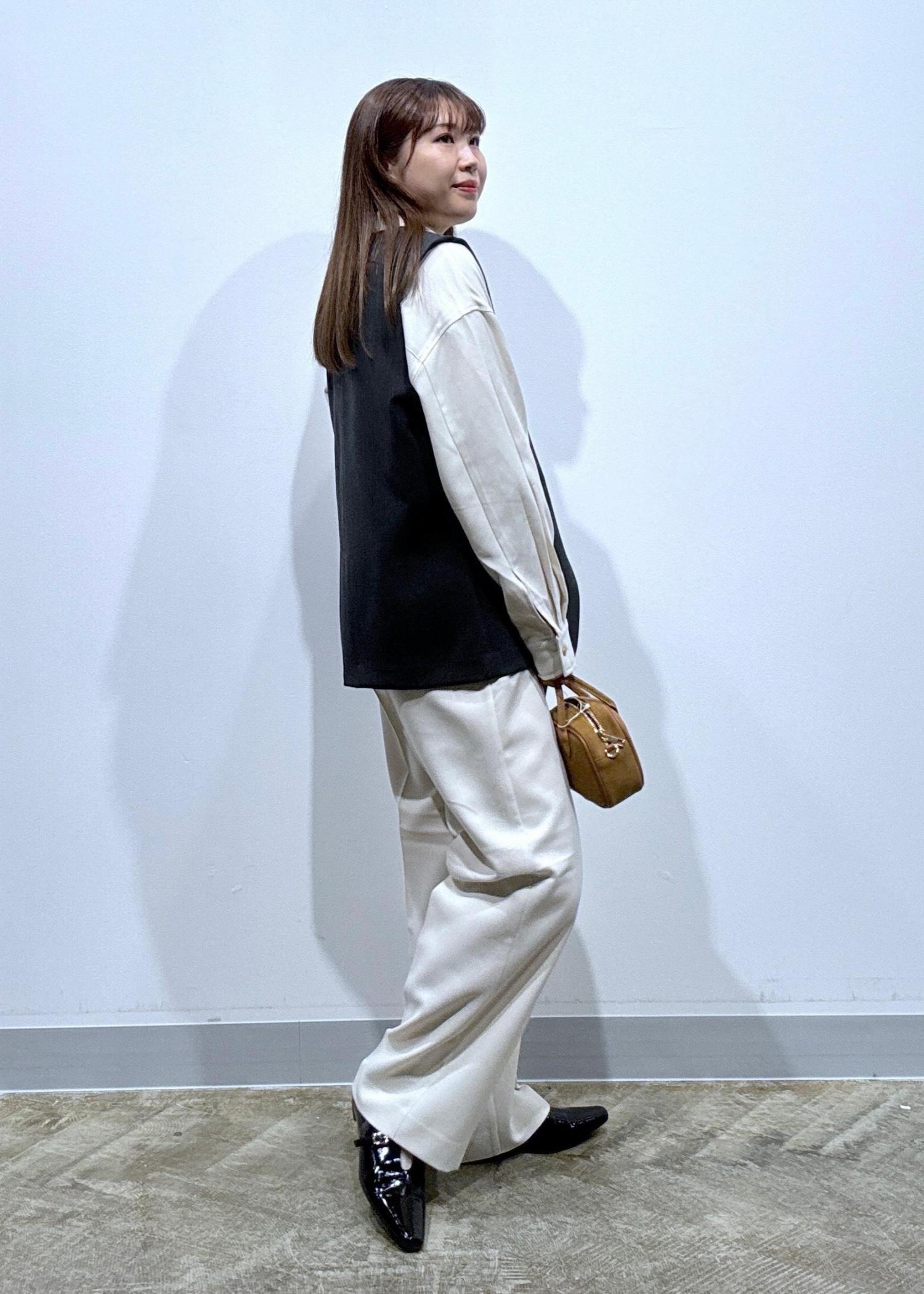 ノーカラーのベストと合わせてスタイリッシュに〇