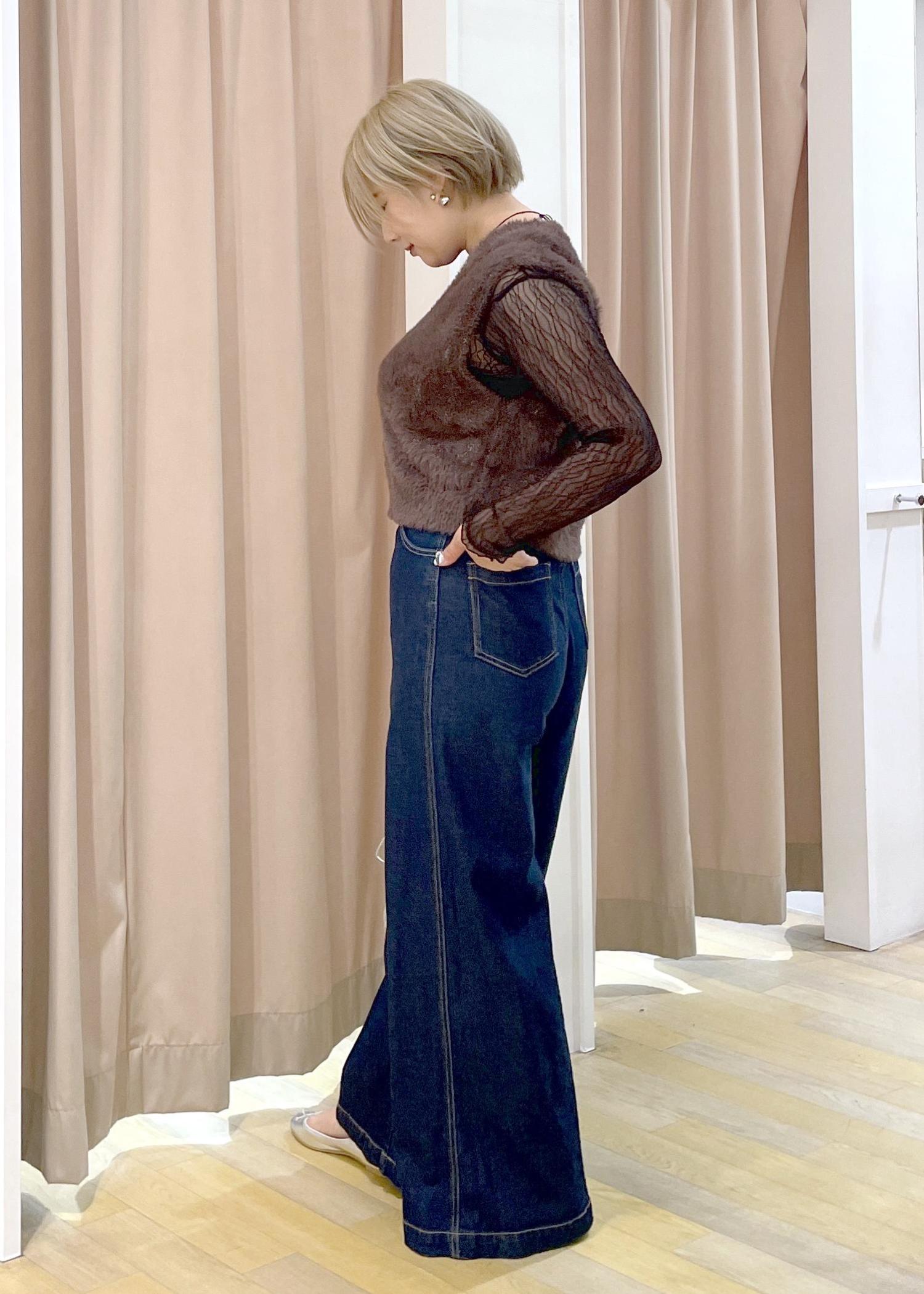 肌触りの良いフェザーニットを使った、晩夏にオススメなコーデです。