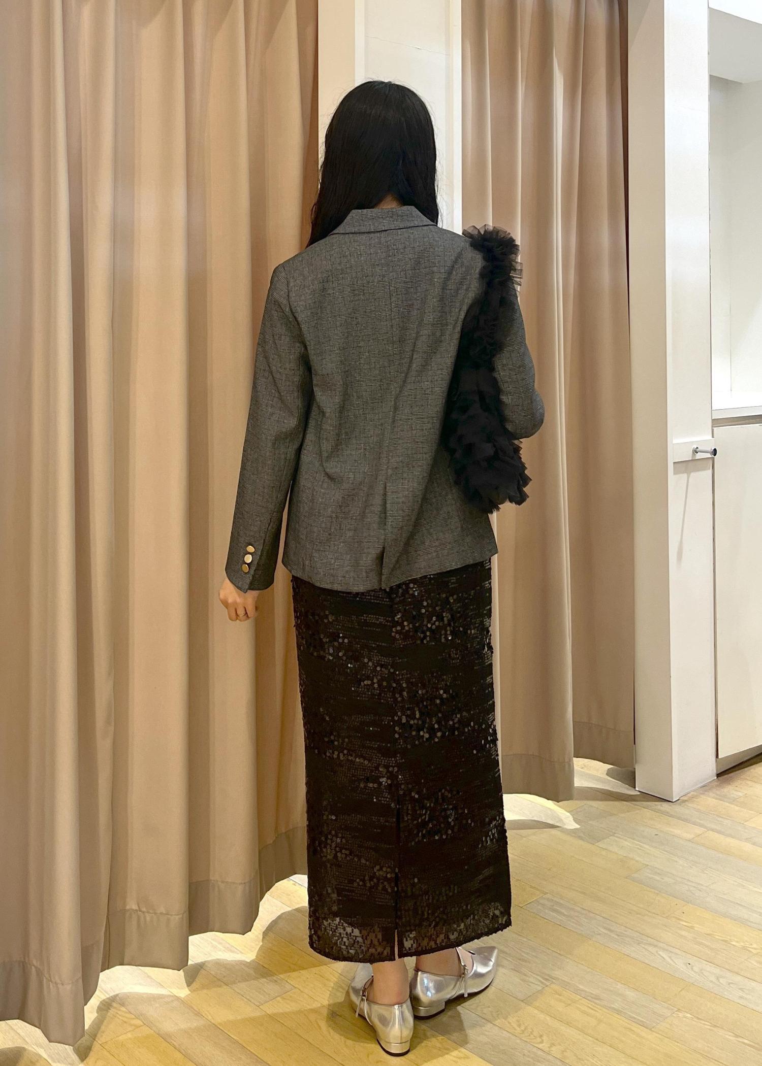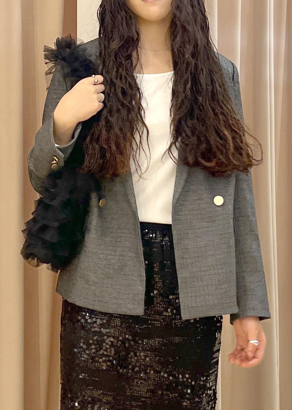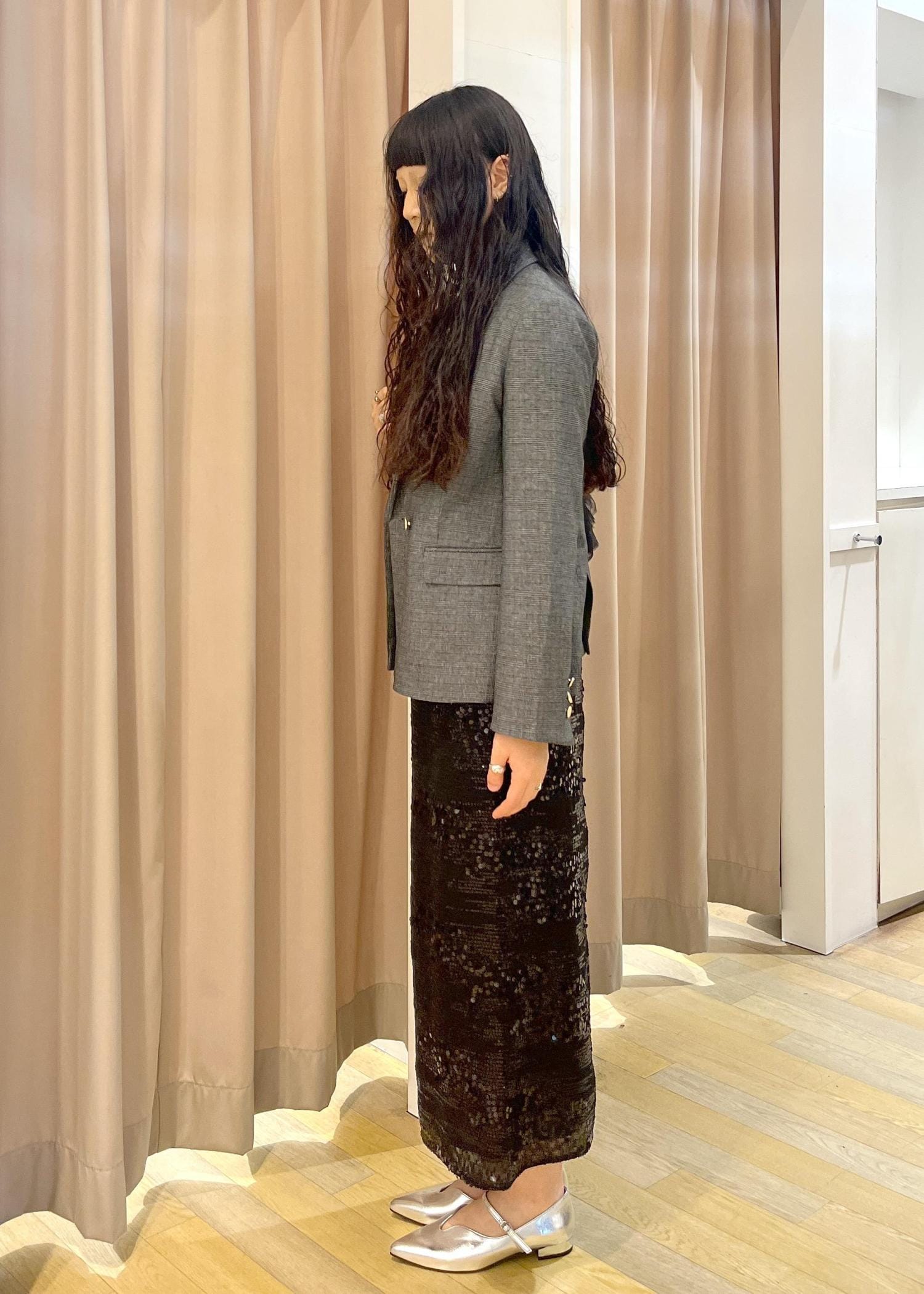 キレイめのジャケットに、動くとキラキラ輝くスカートを合わせ、堅苦しくなりすぎないジャケットコーデを組みましたᐩᕀ
