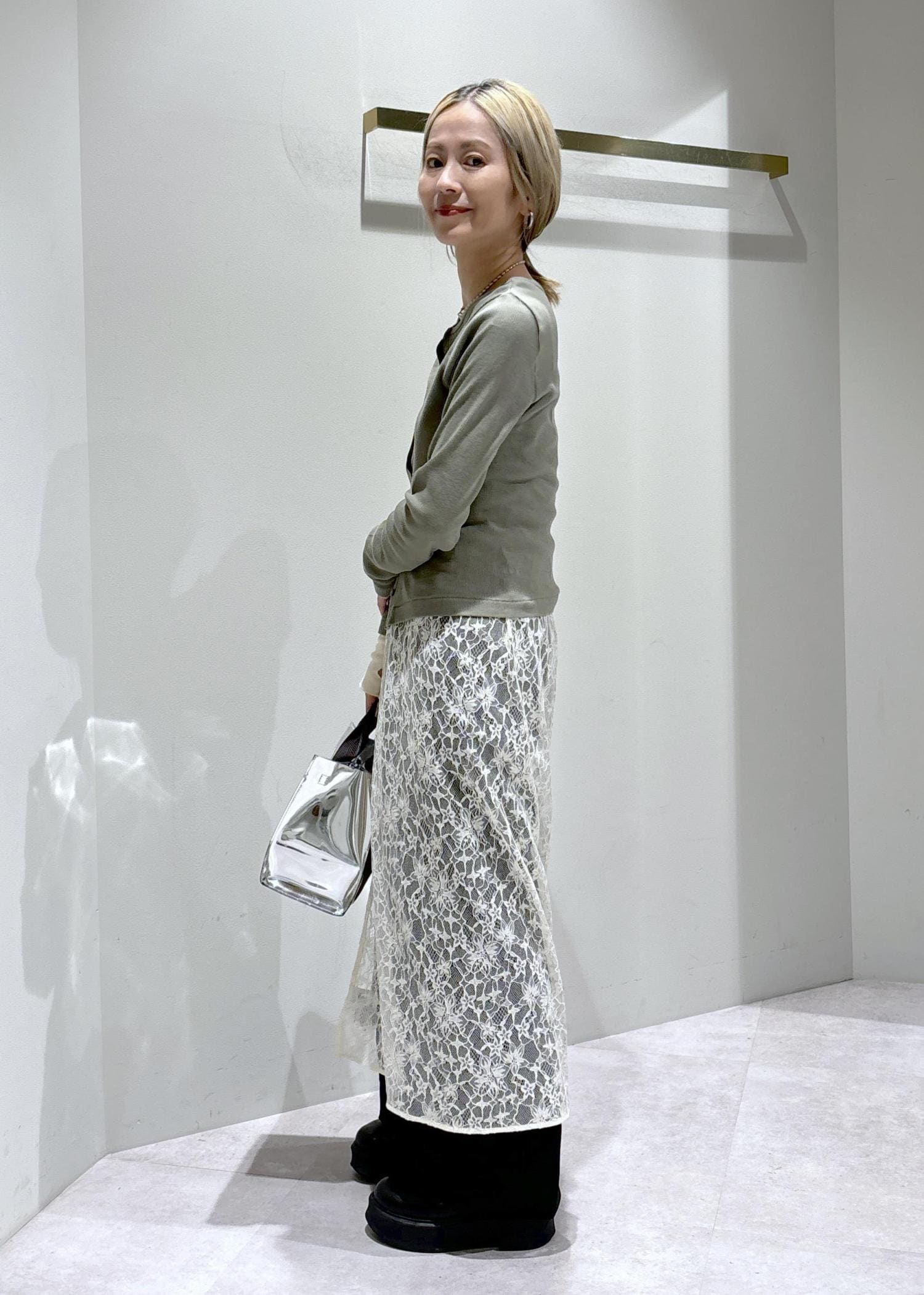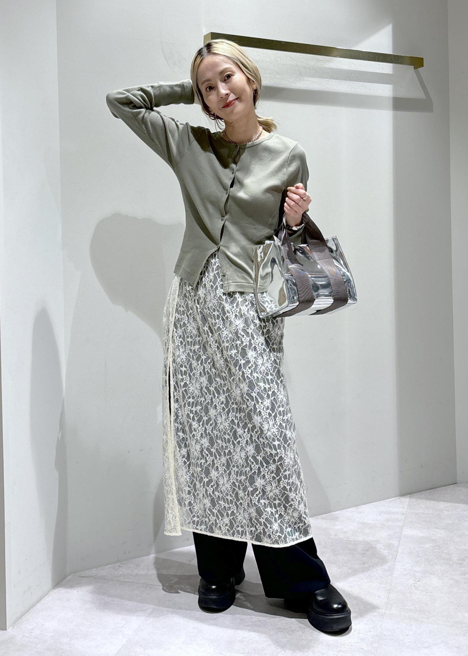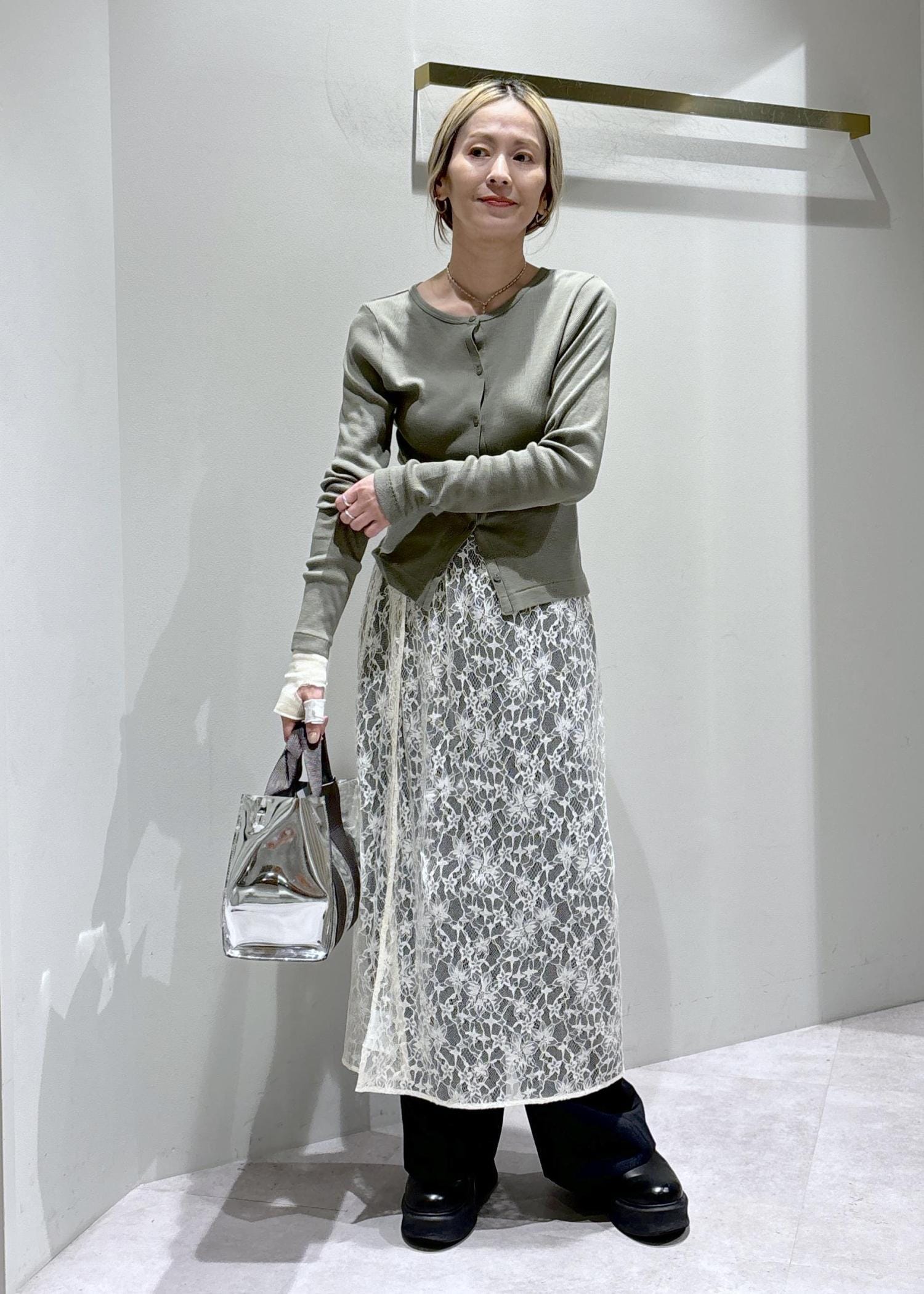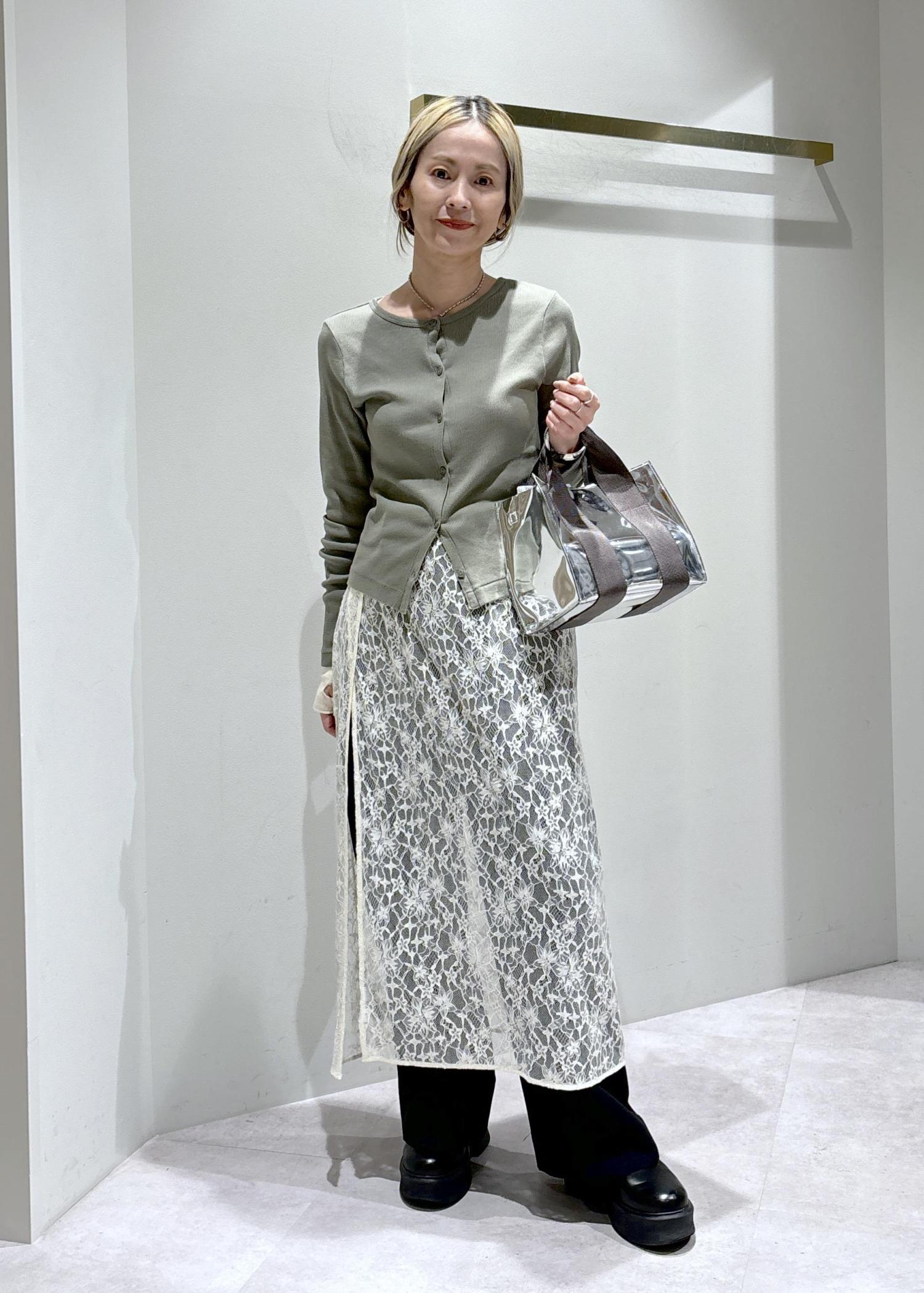 カーキ×ブラックのシンプルなスタイルもよいですが、ラップスカートで女性らしさをプラスして雰囲気を変えてみました