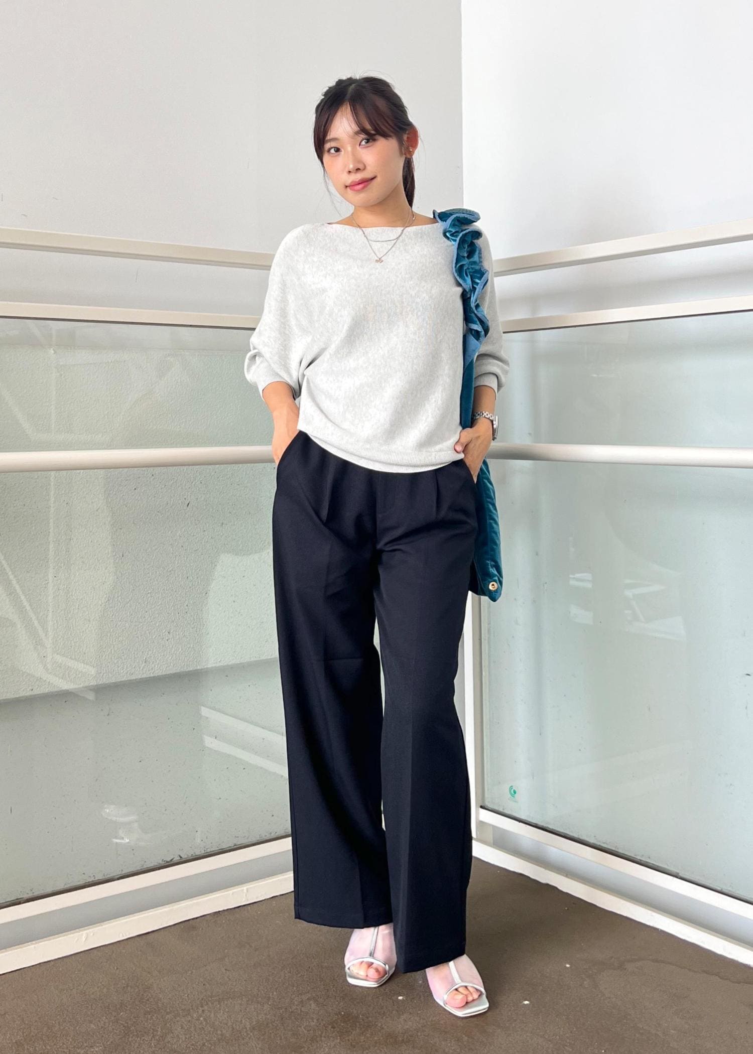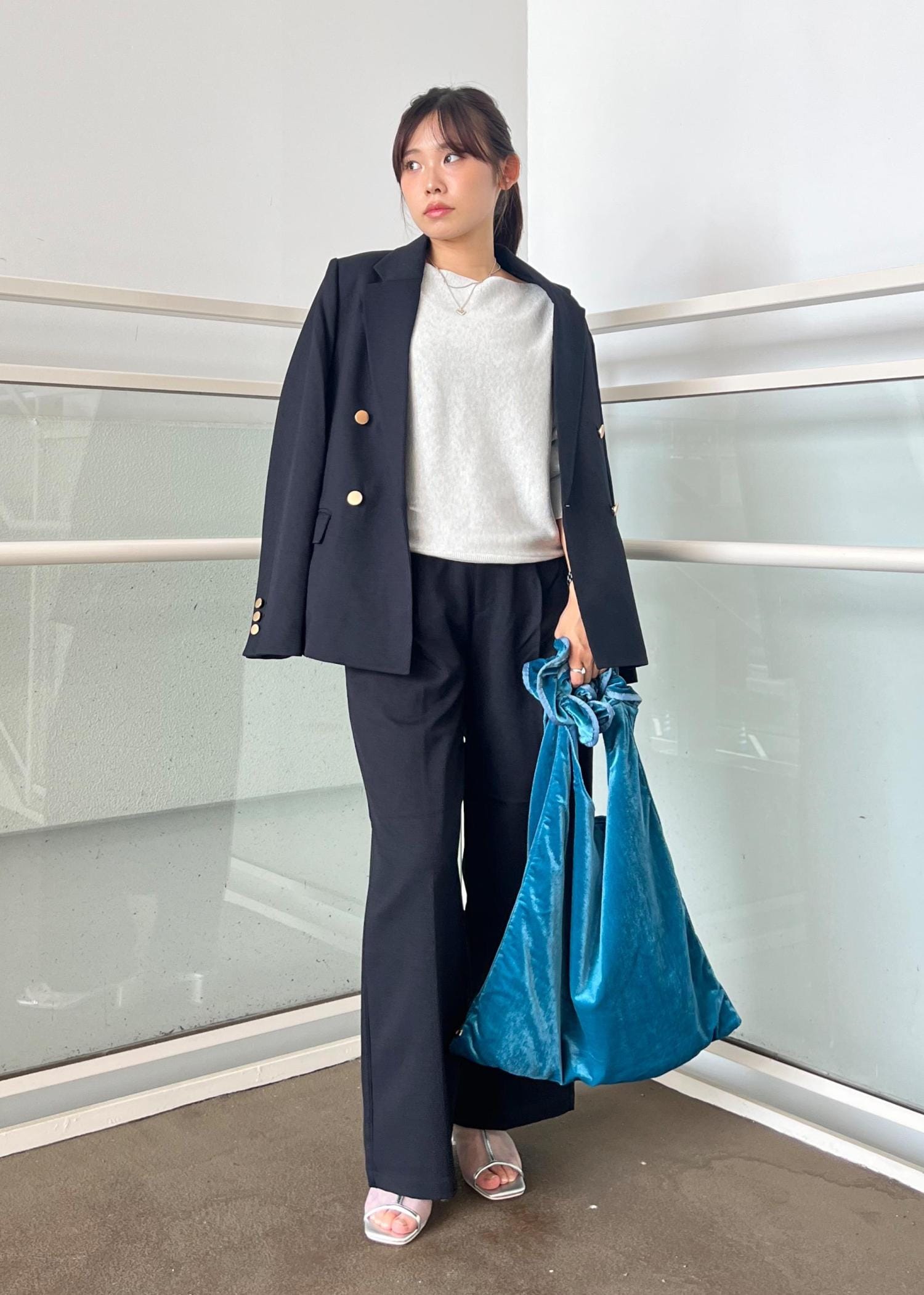 大人ドルマンにネイビーカラーのセットアップを合わせて、カジュアルな綺麗めコーデを組みました。秋は羽織が活躍する時期なので紺ブレは1つ持っていると着回しが沢山できます。